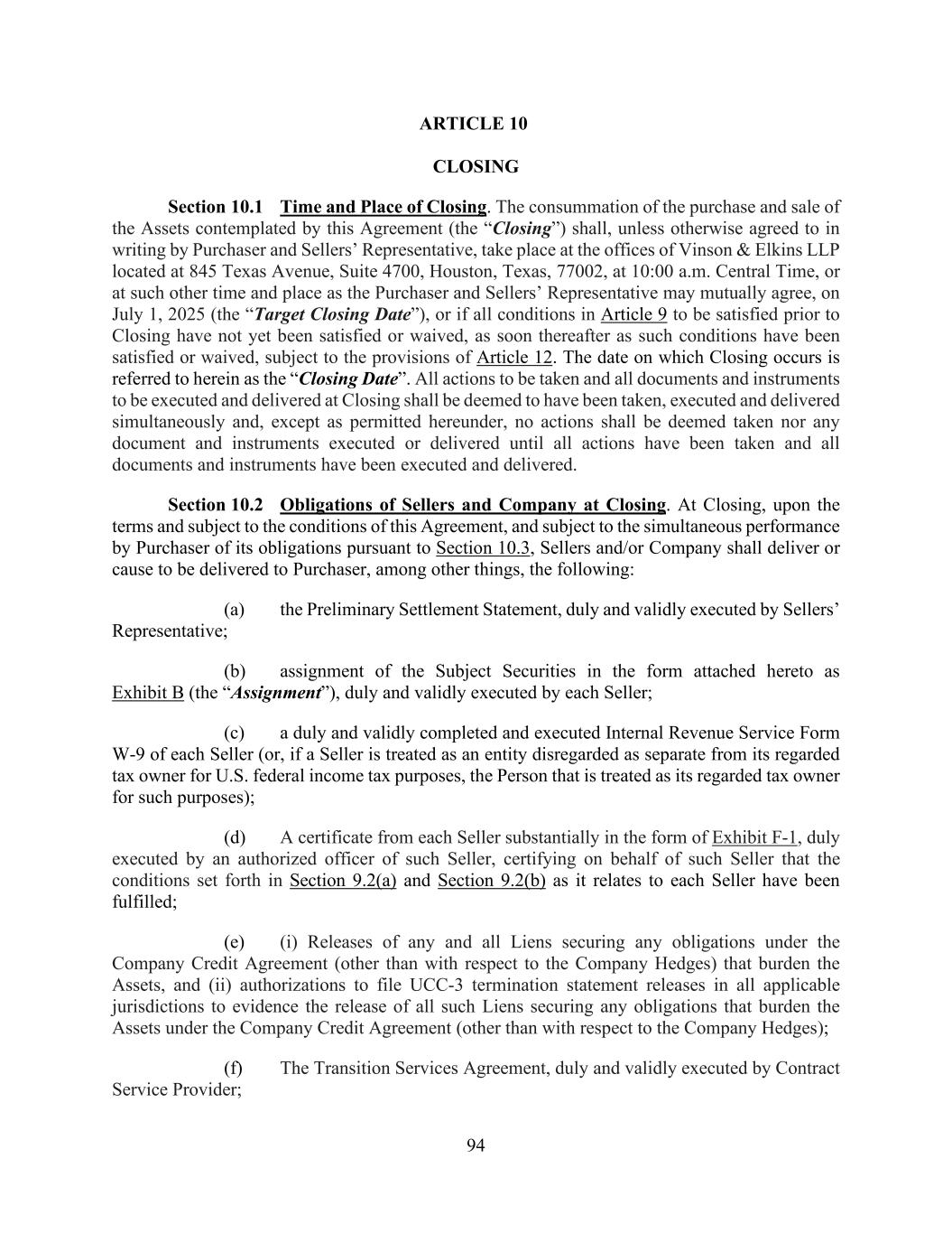 94 ARTICLE 10 CLOSING Section 10.1 Time and Place of Closing. The consummation of the purchase and sale of the Assets contemplated by this Agreement (the “Closing”) shall, unless otherwise agreed to in writing by Purchaser and Sellers’ Representative, take place at the offices of Vinson & Elkins LLP located at 845 Texas Avenue, Suite 4700, Houston, Texas, 77002, at 10:00 a.m. Central Time, or at such other time and place as the Purchaser and Sellers’ Representative may mutually agree, on July 1, 2025 (the “Target Closing Date”), or if all conditions in Article 9 to be satisfied prior to Closing have not yet been satisfied or waived, as soon thereafter as such conditions have been satisfied or waived, subject to the provisions of Article 12. The date on which Closing occurs is referred to herein as the “Closing Date”. All actions to be taken and all documents and instruments to be executed and delivered at Closing shall be deemed to have been taken, executed and delivered simultaneously and, except as permitted hereunder, no actions shall be deemed taken nor any document and instruments executed or delivered until all actions have been taken and all documents and instruments have been executed and delivered. Section 10.2 Obligations of Sellers and Company at Closing. At Closing, upon the terms and subject to the conditions of this Agreement, and subject to the simultaneous performance by Purchaser of its obligations pursuant to Section 10.3, Sellers and/or Company shall deliver or cause to be delivered to Purchaser, among other things, the following: (a) the Preliminary Settlement Statement, duly and validly executed by Sellers’ Representative; (b) assignment of the Subject Securities in the form attached hereto as Exhibit B (the “Assignment”), duly and validly executed by each Seller; (c) a duly and validly completed and executed Internal Revenue Service Form W-9 of each Seller (or, if a Seller is treated as an entity disregarded as separate from its regarded tax owner for U.S. federal income tax purposes, the Person that is treated as its regarded tax owner for such purposes); (d) A certificate from each Seller substantially in the form of Exhibit F-1, duly executed by an authorized officer of such Seller, certifying on behalf of such Seller that the conditions set forth in Section 9.2(a) and Section 9.2(b) as it relates to each Seller have been fulfilled; (e) (i) Releases of any and all Liens securing any obligations under the Company Credit Agreement (other than with respect to the Company Hedges) that burden the Assets, and (ii) authorizations to file UCC-3 termination statement releases in all applicable jurisdictions to evidence the release of all such Liens securing any obligations that burden the Assets under the Company Credit Agreement (other than with respect to the Company Hedges); (f) The Transition Services Agreement, duly and validly executed by Contract Service Provider;