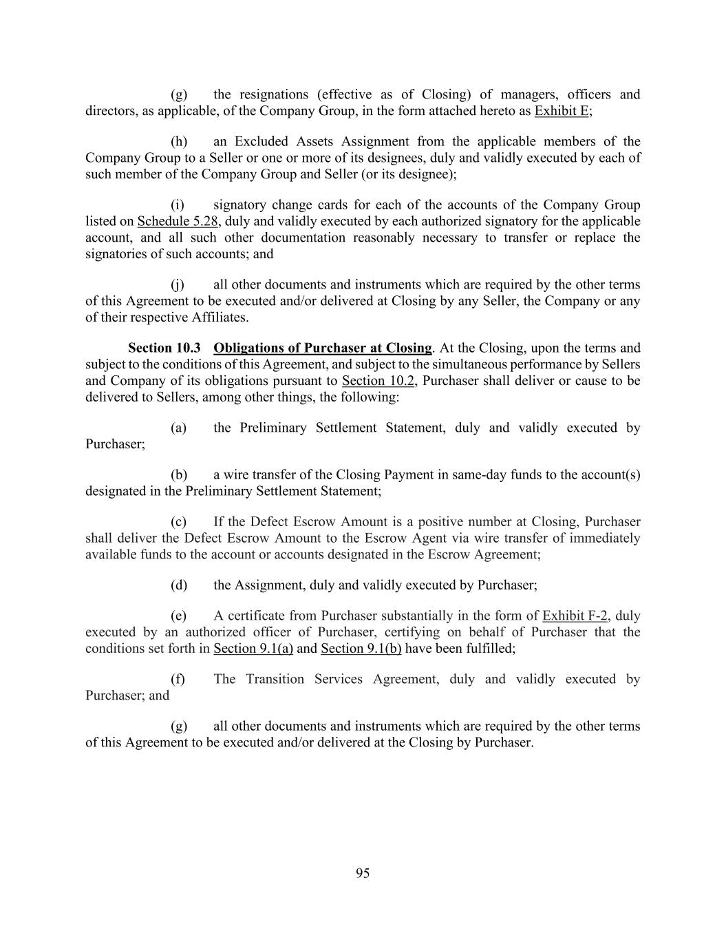 95 (g) the resignations (effective as of Closing) of managers, officers and directors, as applicable, of the Company Group, in the form attached hereto as Exhibit E; (h) an Excluded Assets Assignment from the applicable members of the Company Group to a Seller or one or more of its designees, duly and validly executed by each of such member of the Company Group and Seller (or its designee); (i) signatory change cards for each of the accounts of the Company Group listed on Schedule 5.28, duly and validly executed by each authorized signatory for the applicable account, and all such other documentation reasonably necessary to transfer or replace the signatories of such accounts; and (j) all other documents and instruments which are required by the other terms of this Agreement to be executed and/or delivered at Closing by any Seller, the Company or any of their respective Affiliates. Section 10.3 Obligations of Purchaser at Closing. At the Closing, upon the terms and subject to the conditions of this Agreement, and subject to the simultaneous performance by Sellers and Company of its obligations pursuant to Section 10.2, Purchaser shall deliver or cause to be delivered to Sellers, among other things, the following: (a) the Preliminary Settlement Statement, duly and validly executed by Purchaser; (b) a wire transfer of the Closing Payment in same-day funds to the account(s) designated in the Preliminary Settlement Statement; (c) If the Defect Escrow Amount is a positive number at Closing, Purchaser shall deliver the Defect Escrow Amount to the Escrow Agent via wire transfer of immediately available funds to the account or accounts designated in the Escrow Agreement; (d) the Assignment, duly and validly executed by Purchaser; (e) A certificate from Purchaser substantially in the form of Exhibit F-2, duly executed by an authorized officer of Purchaser, certifying on behalf of Purchaser that the conditions set forth in Section 9.1(a) and Section 9.1(b) have been fulfilled; (f) The Transition Services Agreement, duly and validly executed by Purchaser; and (g) all other documents and instruments which are required by the other terms of this Agreement to be executed and/or delivered at the Closing by Purchaser.