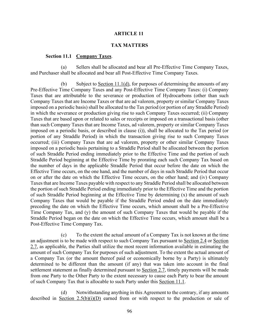 96 ARTICLE 11 TAX MATTERS Section 11.1 Company Taxes. (a) Sellers shall be allocated and bear all Pre-Effective Time Company Taxes, and Purchaser shall be allocated and bear all Post-Effective Time Company Taxes. (b) Subject to Section 11.1(d), for purposes of determining the amounts of any Pre-Effective Time Company Taxes and any Post-Effective Time Company Taxes: (i) Company Taxes that are attributable to the severance or production of Hydrocarbons (other than such Company Taxes that are Income Taxes or that are ad valorem, property or similar Company Taxes imposed on a periodic basis) shall be allocated to the Tax period (or portion of any Straddle Period) in which the severance or production giving rise to such Company Taxes occurred; (ii) Company Taxes that are based upon or related to sales or receipts or imposed on a transactional basis (other than such Company Taxes that are Income Taxes, ad valorem, property or similar Company Taxes imposed on a periodic basis, or described in clause (i)), shall be allocated to the Tax period (or portion of any Straddle Period) in which the transaction giving rise to such Company Taxes occurred; (iii) Company Taxes that are ad valorem, property or other similar Company Taxes imposed on a periodic basis pertaining to a Straddle Period shall be allocated between the portion of such Straddle Period ending immediately prior to the Effective Time and the portion of such Straddle Period beginning at the Effective Time by prorating each such Company Tax based on the number of days in the applicable Straddle Period that occur before the date on which the Effective Time occurs, on the one hand, and the number of days in such Straddle Period that occur on or after the date on which the Effective Time occurs, on the other hand; and (iv) Company Taxes that are Income Taxes payable with respect to any Straddle Period shall be allocated between the portion of such Straddle Period ending immediately prior to the Effective Time and the portion of such Straddle Period beginning at the Effective Time by determining (x) the amount of such Company Taxes that would be payable if the Straddle Period ended on the date immediately preceding the date on which the Effective Time occurs, which amount shall be a Pre-Effective Time Company Tax, and (y) the amount of such Company Taxes that would be payable if the Straddle Period began on the date on which the Effective Time occurs, which amount shall be a Post-Effective Time Company Tax. (c) To the extent the actual amount of a Company Tax is not known at the time an adjustment is to be made with respect to such Company Tax pursuant to Section 2.4 or Section 2.7, as applicable, the Parties shall utilize the most recent information available in estimating the amount of such Company Tax for purposes of such adjustment. To the extent the actual amount of a Company Tax (or the amount thereof paid or economically borne by a Party) is ultimately determined to be different than the amount (if any) that was taken into account in the final settlement statement as finally determined pursuant to Section 2.7, timely payments will be made from one Party to the Other Party to the extent necessary to cause each Party to bear the amount of such Company Tax that is allocable to such Party under this Section 11.1. (d) Notwithstanding anything in this Agreement to the contrary, if any amounts described in Section 2.5(b)(i)(D) earned from or with respect to the production or sale of