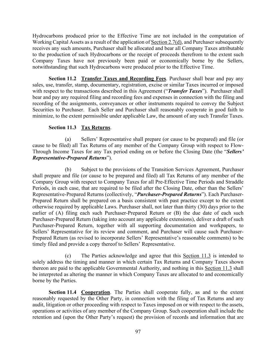 97 Hydrocarbons produced prior to the Effective Time are not included in the computation of Working Capital Assets as a result of the application of Section 2.7(d), and Purchaser subsequently receives any such amounts, Purchaser shall be allocated and bear all Company Taxes attributable to the production of such Hydrocarbons or the receipt of proceeds therefrom to the extent such Company Taxes have not previously been paid or economically borne by the Sellers, notwithstanding that such Hydrocarbons were produced prior to the Effective Time. Section 11.2 Transfer Taxes and Recording Fees. Purchaser shall bear and pay any sales, use, transfer, stamp, documentary, registration, excise or similar Taxes incurred or imposed with respect to the transactions described in this Agreement (“Transfer Taxes”). Purchaser shall bear and pay any required filing and recording fees and expenses in connection with the filing and recording of the assignments, conveyances or other instruments required to convey the Subject Securities to Purchaser. Each Seller and Purchaser shall reasonably cooperate in good faith to minimize, to the extent permissible under applicable Law, the amount of any such Transfer Taxes. Section 11.3 Tax Returns. (a) Sellers’ Representative shall prepare (or cause to be prepared) and file (or cause to be filed) all Tax Returns of any member of the Company Group with respect to Flow- Through Income Taxes for any Tax period ending on or before the Closing Date (the “Sellers’ Representative-Prepared Returns”). (b) Subject to the provisions of the Transition Services Agreement, Purchaser shall prepare and file (or cause to be prepared and filed) all Tax Returns of any member of the Company Group with respect to Company Taxes for all Pre-Effective Time Periods and Straddle Periods, in each case, that are required to be filed after the Closing Date, other than the Sellers’ Representative-Prepared Returns (collectively, “Purchaser-Prepared Returns”). Each Purchaser- Prepared Return shall be prepared on a basis consistent with past practice except to the extent otherwise required by applicable Laws. Purchaser shall, not later than thirty (30) days prior to the earlier of (A) filing each such Purchaser-Prepared Return or (B) the due date of each such Purchaser-Prepared Return (taking into account any applicable extensions), deliver a draft of such Purchaser-Prepared Return, together with all supporting documentation and workpapers, to Sellers’ Representative for its review and comment, and Purchaser will cause such Purchaser- Prepared Return (as revised to incorporate Sellers’ Representative’s reasonable comments) to be timely filed and provide a copy thereof to Sellers’ Representative. (c) The Parties acknowledge and agree that this Section 11.3 is intended to solely address the timing and manner in which certain Tax Returns and Company Taxes shown thereon are paid to the applicable Governmental Authority, and nothing in this Section 11.3 shall be interpreted as altering the manner in which Company Taxes are allocated to and economically borne by the Parties. Section 11.4 Cooperation. The Parties shall cooperate fully, as and to the extent reasonably requested by the Other Party, in connection with the filing of Tax Returns and any audit, litigation or other proceeding with respect to Taxes imposed on or with respect to the assets, operations or activities of any member of the Company Group. Such cooperation shall include the retention and (upon the Other Party’s request) the provision of records and information that are