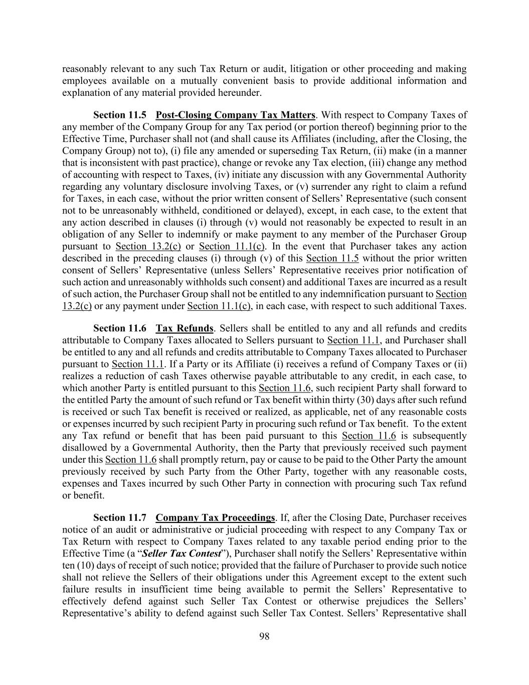 98 reasonably relevant to any such Tax Return or audit, litigation or other proceeding and making employees available on a mutually convenient basis to provide additional information and explanation of any material provided hereunder. Section 11.5 Post-Closing Company Tax Matters. With respect to Company Taxes of any member of the Company Group for any Tax period (or portion thereof) beginning prior to the Effective Time, Purchaser shall not (and shall cause its Affiliates (including, after the Closing, the Company Group) not to), (i) file any amended or superseding Tax Return, (ii) make (in a manner that is inconsistent with past practice), change or revoke any Tax election, (iii) change any method of accounting with respect to Taxes, (iv) initiate any discussion with any Governmental Authority regarding any voluntary disclosure involving Taxes, or (v) surrender any right to claim a refund for Taxes, in each case, without the prior written consent of Sellers’ Representative (such consent not to be unreasonably withheld, conditioned or delayed), except, in each case, to the extent that any action described in clauses (i) through (v) would not reasonably be expected to result in an obligation of any Seller to indemnify or make payment to any member of the Purchaser Group pursuant to Section 13.2(c) or Section 11.1(c). In the event that Purchaser takes any action described in the preceding clauses (i) through (v) of this Section 11.5 without the prior written consent of Sellers’ Representative (unless Sellers’ Representative receives prior notification of such action and unreasonably withholds such consent) and additional Taxes are incurred as a result of such action, the Purchaser Group shall not be entitled to any indemnification pursuant to Section 13.2(c) or any payment under Section 11.1(c), in each case, with respect to such additional Taxes. Section 11.6 Tax Refunds. Sellers shall be entitled to any and all refunds and credits attributable to Company Taxes allocated to Sellers pursuant to Section 11.1, and Purchaser shall be entitled to any and all refunds and credits attributable to Company Taxes allocated to Purchaser pursuant to Section 11.1. If a Party or its Affiliate (i) receives a refund of Company Taxes or (ii) realizes a reduction of cash Taxes otherwise payable attributable to any credit, in each case, to which another Party is entitled pursuant to this Section 11.6, such recipient Party shall forward to the entitled Party the amount of such refund or Tax benefit within thirty (30) days after such refund is received or such Tax benefit is received or realized, as applicable, net of any reasonable costs or expenses incurred by such recipient Party in procuring such refund or Tax benefit. To the extent any Tax refund or benefit that has been paid pursuant to this Section 11.6 is subsequently disallowed by a Governmental Authority, then the Party that previously received such payment under this Section 11.6 shall promptly return, pay or cause to be paid to the Other Party the amount previously received by such Party from the Other Party, together with any reasonable costs, expenses and Taxes incurred by such Other Party in connection with procuring such Tax refund or benefit. Section 11.7 Company Tax Proceedings. If, after the Closing Date, Purchaser receives notice of an audit or administrative or judicial proceeding with respect to any Company Tax or Tax Return with respect to Company Taxes related to any taxable period ending prior to the Effective Time (a “Seller Tax Contest”), Purchaser shall notify the Sellers’ Representative within ten (10) days of receipt of such notice; provided that the failure of Purchaser to provide such notice shall not relieve the Sellers of their obligations under this Agreement except to the extent such failure results in insufficient time being available to permit the Sellers’ Representative to effectively defend against such Seller Tax Contest or otherwise prejudices the Sellers’ Representative’s ability to defend against such Seller Tax Contest. Sellers’ Representative shall