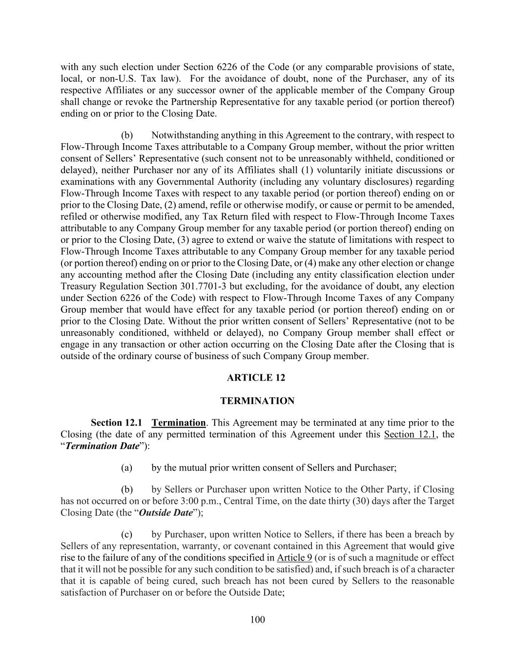 100 with any such election under Section 6226 of the Code (or any comparable provisions of state, local, or non-U.S. Tax law). For the avoidance of doubt, none of the Purchaser, any of its respective Affiliates or any successor owner of the applicable member of the Company Group shall change or revoke the Partnership Representative for any taxable period (or portion thereof) ending on or prior to the Closing Date. (b) Notwithstanding anything in this Agreement to the contrary, with respect to Flow-Through Income Taxes attributable to a Company Group member, without the prior written consent of Sellers’ Representative (such consent not to be unreasonably withheld, conditioned or delayed), neither Purchaser nor any of its Affiliates shall (1) voluntarily initiate discussions or examinations with any Governmental Authority (including any voluntary disclosures) regarding Flow-Through Income Taxes with respect to any taxable period (or portion thereof) ending on or prior to the Closing Date, (2) amend, refile or otherwise modify, or cause or permit to be amended, refiled or otherwise modified, any Tax Return filed with respect to Flow-Through Income Taxes attributable to any Company Group member for any taxable period (or portion thereof) ending on or prior to the Closing Date, (3) agree to extend or waive the statute of limitations with respect to Flow-Through Income Taxes attributable to any Company Group member for any taxable period (or portion thereof) ending on or prior to the Closing Date, or (4) make any other election or change any accounting method after the Closing Date (including any entity classification election under Treasury Regulation Section 301.7701-3 but excluding, for the avoidance of doubt, any election under Section 6226 of the Code) with respect to Flow-Through Income Taxes of any Company Group member that would have effect for any taxable period (or portion thereof) ending on or prior to the Closing Date. Without the prior written consent of Sellers’ Representative (not to be unreasonably conditioned, withheld or delayed), no Company Group member shall effect or engage in any transaction or other action occurring on the Closing Date after the Closing that is outside of the ordinary course of business of such Company Group member. ARTICLE 12 TERMINATION Section 12.1 Termination. This Agreement may be terminated at any time prior to the Closing (the date of any permitted termination of this Agreement under this Section 12.1, the “Termination Date”): (a) by the mutual prior written consent of Sellers and Purchaser; (b) by Sellers or Purchaser upon written Notice to the Other Party, if Closing has not occurred on or before 3:00 p.m., Central Time, on the date thirty (30) days after the Target Closing Date (the “Outside Date”); (c) by Purchaser, upon written Notice to Sellers, if there has been a breach by Sellers of any representation, warranty, or covenant contained in this Agreement that would give rise to the failure of any of the conditions specified in Article 9 (or is of such a magnitude or effect that it will not be possible for any such condition to be satisfied) and, if such breach is of a character that it is capable of being cured, such breach has not been cured by Sellers to the reasonable satisfaction of Purchaser on or before the Outside Date;