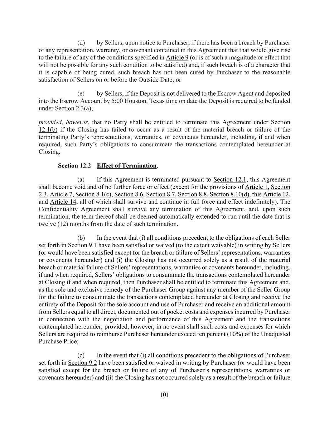 101 (d) by Sellers, upon notice to Purchaser, if there has been a breach by Purchaser of any representation, warranty, or covenant contained in this Agreement that that would give rise to the failure of any of the conditions specified in Article 9 (or is of such a magnitude or effect that will not be possible for any such condition to be satisfied) and, if such breach is of a character that it is capable of being cured, such breach has not been cured by Purchaser to the reasonable satisfaction of Sellers on or before the Outside Date; or (e) by Sellers, if the Deposit is not delivered to the Escrow Agent and deposited into the Escrow Account by 5:00 Houston, Texas time on date the Deposit is required to be funded under Section 2.3(a); provided, however, that no Party shall be entitled to terminate this Agreement under Section 12.1(b) if the Closing has failed to occur as a result of the material breach or failure of the terminating Party’s representations, warranties, or covenants hereunder, including, if and when required, such Party’s obligations to consummate the transactions contemplated hereunder at Closing. Section 12.2 Effect of Termination. (a) If this Agreement is terminated pursuant to Section 12.1, this Agreement shall become void and of no further force or effect (except for the provisions of Article 1, Section 2.3, Article 7, Section 8.1(c), Section 8.6, Section 8.7, Section 8.8, Section 8.10(d), this Article 12, and Article 14, all of which shall survive and continue in full force and effect indefinitely). The Confidentiality Agreement shall survive any termination of this Agreement, and, upon such termination, the term thereof shall be deemed automatically extended to run until the date that is twelve (12) months from the date of such termination. (b) In the event that (i) all conditions precedent to the obligations of each Seller set forth in Section 9.1 have been satisfied or waived (to the extent waivable) in writing by Sellers (or would have been satisfied except for the breach or failure of Sellers’ representations, warranties or covenants hereunder) and (i) the Closing has not occurred solely as a result of the material breach or material failure of Sellers’ representations, warranties or covenants hereunder, including, if and when required, Sellers’ obligations to consummate the transactions contemplated hereunder at Closing if and when required, then Purchaser shall be entitled to terminate this Agreement and, as the sole and exclusive remedy of the Purchaser Group against any member of the Seller Group for the failure to consummate the transactions contemplated hereunder at Closing and receive the entirety of the Deposit for the sole account and use of Purchaser and receive an additional amount from Sellers equal to all direct, documented out of pocket costs and expenses incurred by Purchaser in connection with the negotiation and performance of this Agreement and the transactions contemplated hereunder; provided, however, in no event shall such costs and expenses for which Sellers are required to reimburse Purchaser hereunder exceed ten percent (10%) of the Unadjusted Purchase Price; (c) In the event that (i) all conditions precedent to the obligations of Purchaser set forth in Section 9.2 have been satisfied or waived in writing by Purchaser (or would have been satisfied except for the breach or failure of any of Purchaser’s representations, warranties or covenants hereunder) and (ii) the Closing has not occurred solely as a result of the breach or failure