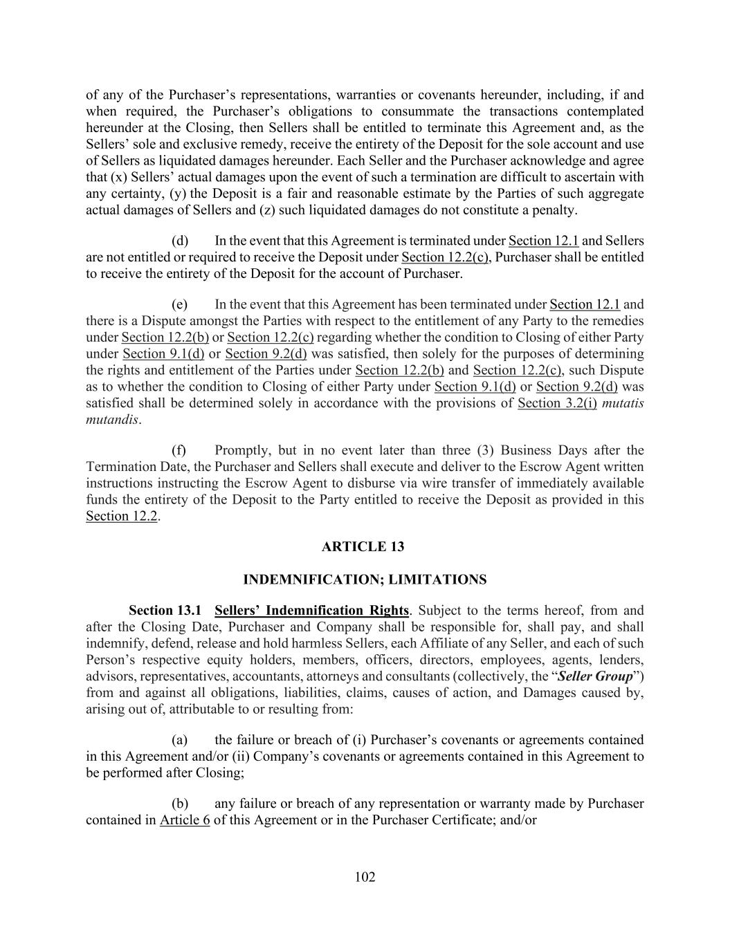 102 of any of the Purchaser’s representations, warranties or covenants hereunder, including, if and when required, the Purchaser’s obligations to consummate the transactions contemplated hereunder at the Closing, then Sellers shall be entitled to terminate this Agreement and, as the Sellers’ sole and exclusive remedy, receive the entirety of the Deposit for the sole account and use of Sellers as liquidated damages hereunder. Each Seller and the Purchaser acknowledge and agree that (x) Sellers’ actual damages upon the event of such a termination are difficult to ascertain with any certainty, (y) the Deposit is a fair and reasonable estimate by the Parties of such aggregate actual damages of Sellers and (z) such liquidated damages do not constitute a penalty. (d) In the event that this Agreement is terminated under Section 12.1 and Sellers are not entitled or required to receive the Deposit under Section 12.2(c), Purchaser shall be entitled to receive the entirety of the Deposit for the account of Purchaser. (e) In the event that this Agreement has been terminated under Section 12.1 and there is a Dispute amongst the Parties with respect to the entitlement of any Party to the remedies under Section 12.2(b) or Section 12.2(c) regarding whether the condition to Closing of either Party under Section 9.1(d) or Section 9.2(d) was satisfied, then solely for the purposes of determining the rights and entitlement of the Parties under Section 12.2(b) and Section 12.2(c), such Dispute as to whether the condition to Closing of either Party under Section 9.1(d) or Section 9.2(d) was satisfied shall be determined solely in accordance with the provisions of Section 3.2(i) mutatis mutandis. (f) Promptly, but in no event later than three (3) Business Days after the Termination Date, the Purchaser and Sellers shall execute and deliver to the Escrow Agent written instructions instructing the Escrow Agent to disburse via wire transfer of immediately available funds the entirety of the Deposit to the Party entitled to receive the Deposit as provided in this Section 12.2. ARTICLE 13 INDEMNIFICATION; LIMITATIONS Section 13.1 Sellers’ Indemnification Rights. Subject to the terms hereof, from and after the Closing Date, Purchaser and Company shall be responsible for, shall pay, and shall indemnify, defend, release and hold harmless Sellers, each Affiliate of any Seller, and each of such Person’s respective equity holders, members, officers, directors, employees, agents, lenders, advisors, representatives, accountants, attorneys and consultants (collectively, the “Seller Group”) from and against all obligations, liabilities, claims, causes of action, and Damages caused by, arising out of, attributable to or resulting from: (a) the failure or breach of (i) Purchaser’s covenants or agreements contained in this Agreement and/or (ii) Company’s covenants or agreements contained in this Agreement to be performed after Closing; (b) any failure or breach of any representation or warranty made by Purchaser contained in Article 6 of this Agreement or in the Purchaser Certificate; and/or