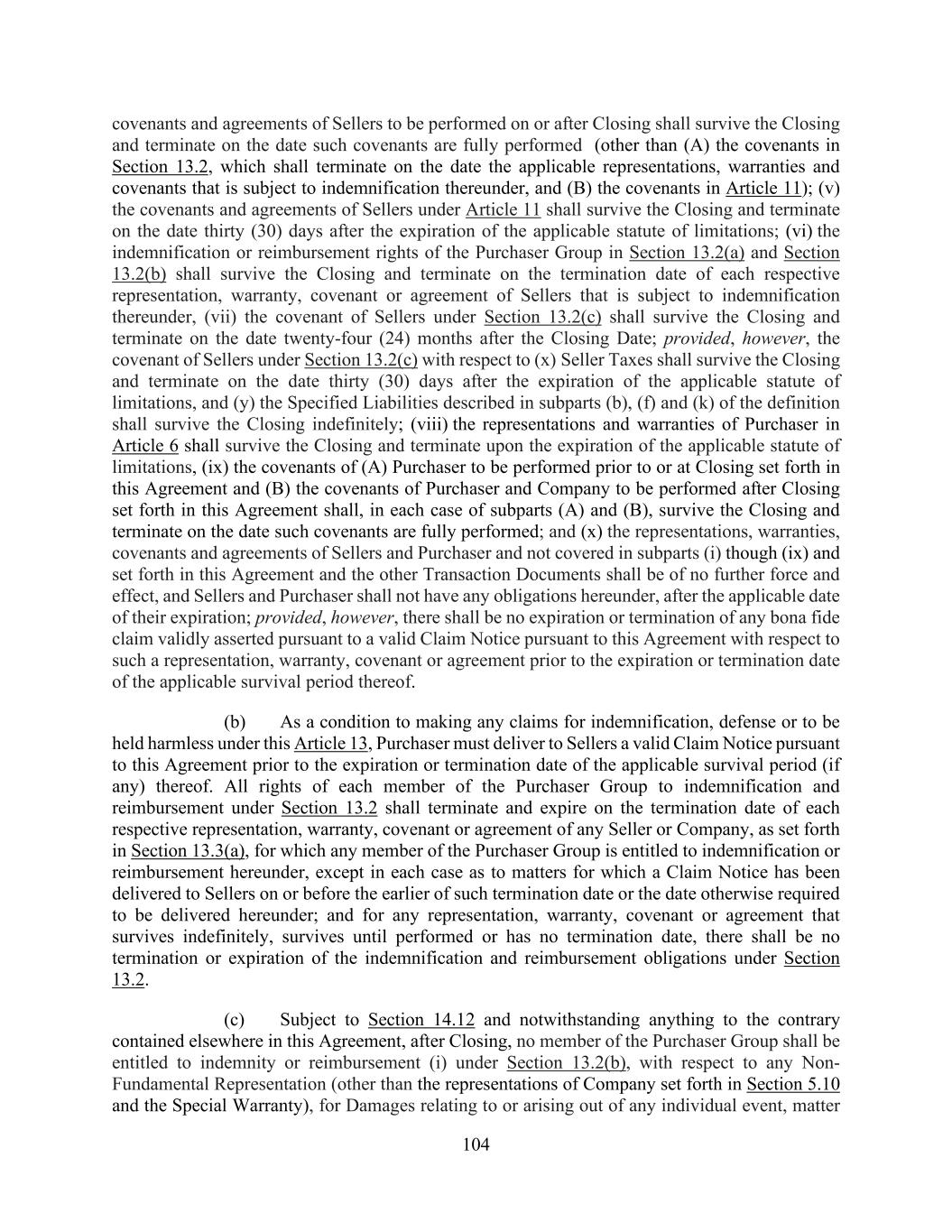 104 covenants and agreements of Sellers to be performed on or after Closing shall survive the Closing and terminate on the date such covenants are fully performed (other than (A) the covenants in Section 13.2, which shall terminate on the date the applicable representations, warranties and covenants that is subject to indemnification thereunder, and (B) the covenants in Article 11); (v) the covenants and agreements of Sellers under Article 11 shall survive the Closing and terminate on the date thirty (30) days after the expiration of the applicable statute of limitations; (vi) the indemnification or reimbursement rights of the Purchaser Group in Section 13.2(a) and Section 13.2(b) shall survive the Closing and terminate on the termination date of each respective representation, warranty, covenant or agreement of Sellers that is subject to indemnification thereunder, (vii) the covenant of Sellers under Section 13.2(c) shall survive the Closing and terminate on the date twenty-four (24) months after the Closing Date; provided, however, the covenant of Sellers under Section 13.2(c) with respect to (x) Seller Taxes shall survive the Closing and terminate on the date thirty (30) days after the expiration of the applicable statute of limitations, and (y) the Specified Liabilities described in subparts (b), (f) and (k) of the definition shall survive the Closing indefinitely; (viii) the representations and warranties of Purchaser in Article 6 shall survive the Closing and terminate upon the expiration of the applicable statute of limitations, (ix) the covenants of (A) Purchaser to be performed prior to or at Closing set forth in this Agreement and (B) the covenants of Purchaser and Company to be performed after Closing set forth in this Agreement shall, in each case of subparts (A) and (B), survive the Closing and terminate on the date such covenants are fully performed; and (x) the representations, warranties, covenants and agreements of Sellers and Purchaser and not covered in subparts (i) though (ix) and set forth in this Agreement and the other Transaction Documents shall be of no further force and effect, and Sellers and Purchaser shall not have any obligations hereunder, after the applicable date of their expiration; provided, however, there shall be no expiration or termination of any bona fide claim validly asserted pursuant to a valid Claim Notice pursuant to this Agreement with respect to such a representation, warranty, covenant or agreement prior to the expiration or termination date of the applicable survival period thereof. (b) As a condition to making any claims for indemnification, defense or to be held harmless under this Article 13, Purchaser must deliver to Sellers a valid Claim Notice pursuant to this Agreement prior to the expiration or termination date of the applicable survival period (if any) thereof. All rights of each member of the Purchaser Group to indemnification and reimbursement under Section 13.2 shall terminate and expire on the termination date of each respective representation, warranty, covenant or agreement of any Seller or Company, as set forth in Section 13.3(a), for which any member of the Purchaser Group is entitled to indemnification or reimbursement hereunder, except in each case as to matters for which a Claim Notice has been delivered to Sellers on or before the earlier of such termination date or the date otherwise required to be delivered hereunder; and for any representation, warranty, covenant or agreement that survives indefinitely, survives until performed or has no termination date, there shall be no termination or expiration of the indemnification and reimbursement obligations under Section 13.2. (c) Subject to Section 14.12 and notwithstanding anything to the contrary contained elsewhere in this Agreement, after Closing, no member of the Purchaser Group shall be entitled to indemnity or reimbursement (i) under Section 13.2(b), with respect to any Non- Fundamental Representation (other than the representations of Company set forth in Section 5.10 and the Special Warranty), for Damages relating to or arising out of any individual event, matter
