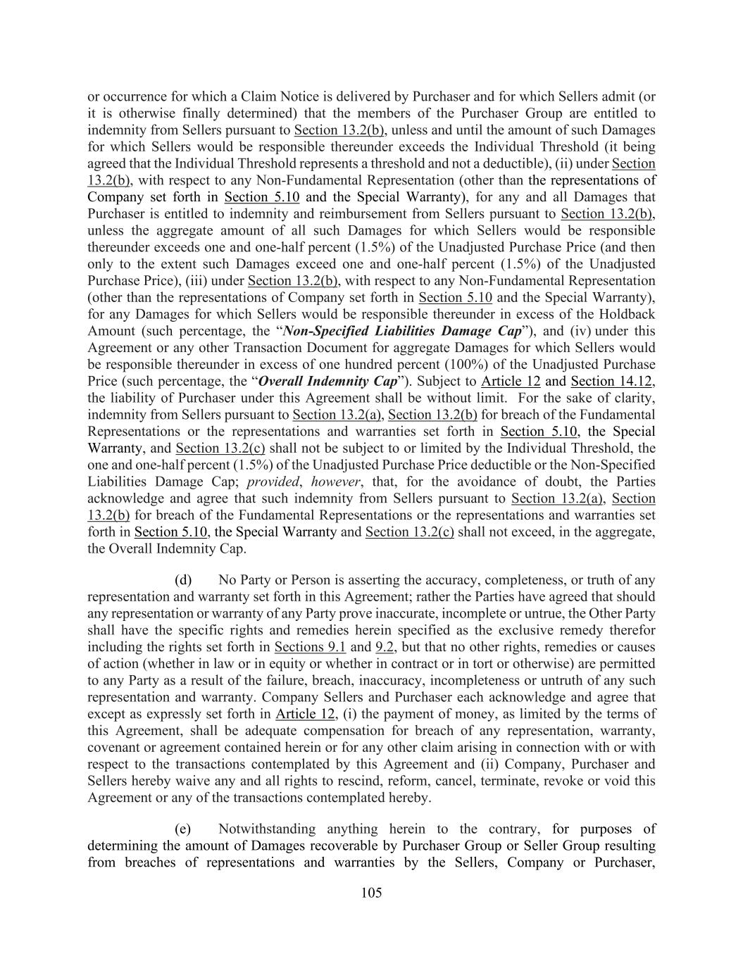 105 or occurrence for which a Claim Notice is delivered by Purchaser and for which Sellers admit (or it is otherwise finally determined) that the members of the Purchaser Group are entitled to indemnity from Sellers pursuant to Section 13.2(b), unless and until the amount of such Damages for which Sellers would be responsible thereunder exceeds the Individual Threshold (it being agreed that the Individual Threshold represents a threshold and not a deductible), (ii) under Section 13.2(b), with respect to any Non-Fundamental Representation (other than the representations of Company set forth in Section 5.10 and the Special Warranty), for any and all Damages that Purchaser is entitled to indemnity and reimbursement from Sellers pursuant to Section 13.2(b), unless the aggregate amount of all such Damages for which Sellers would be responsible thereunder exceeds one and one-half percent (1.5%) of the Unadjusted Purchase Price (and then only to the extent such Damages exceed one and one-half percent (1.5%) of the Unadjusted Purchase Price), (iii) under Section 13.2(b), with respect to any Non-Fundamental Representation (other than the representations of Company set forth in Section 5.10 and the Special Warranty), for any Damages for which Sellers would be responsible thereunder in excess of the Holdback Amount (such percentage, the “Non-Specified Liabilities Damage Cap”), and (iv) under this Agreement or any other Transaction Document for aggregate Damages for which Sellers would be responsible thereunder in excess of one hundred percent (100%) of the Unadjusted Purchase Price (such percentage, the “Overall Indemnity Cap”). Subject to Article 12 and Section 14.12, the liability of Purchaser under this Agreement shall be without limit. For the sake of clarity, indemnity from Sellers pursuant to Section 13.2(a), Section 13.2(b) for breach of the Fundamental Representations or the representations and warranties set forth in Section 5.10, the Special Warranty, and Section 13.2(c) shall not be subject to or limited by the Individual Threshold, the one and one-half percent (1.5%) of the Unadjusted Purchase Price deductible or the Non-Specified Liabilities Damage Cap; provided, however, that, for the avoidance of doubt, the Parties acknowledge and agree that such indemnity from Sellers pursuant to Section 13.2(a), Section 13.2(b) for breach of the Fundamental Representations or the representations and warranties set forth in Section 5.10, the Special Warranty and Section 13.2(c) shall not exceed, in the aggregate, the Overall Indemnity Cap. (d) No Party or Person is asserting the accuracy, completeness, or truth of any representation and warranty set forth in this Agreement; rather the Parties have agreed that should any representation or warranty of any Party prove inaccurate, incomplete or untrue, the Other Party shall have the specific rights and remedies herein specified as the exclusive remedy therefor including the rights set forth in Sections 9.1 and 9.2, but that no other rights, remedies or causes of action (whether in law or in equity or whether in contract or in tort or otherwise) are permitted to any Party as a result of the failure, breach, inaccuracy, incompleteness or untruth of any such representation and warranty. Company Sellers and Purchaser each acknowledge and agree that except as expressly set forth in Article 12, (i) the payment of money, as limited by the terms of this Agreement, shall be adequate compensation for breach of any representation, warranty, covenant or agreement contained herein or for any other claim arising in connection with or with respect to the transactions contemplated by this Agreement and (ii) Company, Purchaser and Sellers hereby waive any and all rights to rescind, reform, cancel, terminate, revoke or void this Agreement or any of the transactions contemplated hereby. (e) Notwithstanding anything herein to the contrary, for purposes of determining the amount of Damages recoverable by Purchaser Group or Seller Group resulting from breaches of representations and warranties by the Sellers, Company or Purchaser,