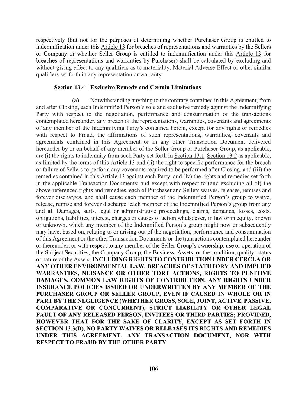 106 respectively (but not for the purposes of determining whether Purchaser Group is entitled to indemnification under this Article 13 for breaches of representations and warranties by the Sellers or Company or whether Seller Group is entitled to indemnification under this Article 13 for breaches of representations and warranties by Purchaser) shall be calculated by excluding and without giving effect to any qualifiers as to materiality, Material Adverse Effect or other similar qualifiers set forth in any representation or warranty. Section 13.4 Exclusive Remedy and Certain Limitations. (a) Notwithstanding anything to the contrary contained in this Agreement, from and after Closing, each Indemnified Person’s sole and exclusive remedy against the Indemnifying Party with respect to the negotiation, performance and consummation of the transactions contemplated hereunder, any breach of the representations, warranties, covenants and agreements of any member of the Indemnifying Party’s contained herein, except for any rights or remedies with respect to Fraud, the affirmations of such representations, warranties, covenants and agreements contained in this Agreement or in any other Transaction Document delivered hereunder by or on behalf of any member of the Seller Group or Purchaser Group, as applicable, are (i) the rights to indemnity from such Party set forth in Section 13.1, Section 13.2 as applicable, as limited by the terms of this Article 13 and (ii) the right to specific performance for the breach or failure of Sellers to perform any covenants required to be performed after Closing, and (iii) the remedies contained in this Article 13 against each Party, and (iv) the rights and remedies set forth in the applicable Transaction Documents; and except with respect to (and excluding all of) the above-referenced rights and remedies, each of Purchaser and Sellers waives, releases, remises and forever discharges, and shall cause each member of the Indemnified Person’s group to waive, release, remise and forever discharge, each member of the Indemnified Person’s group from any and all Damages, suits, legal or administrative proceedings, claims, demands, losses, costs, obligations, liabilities, interest, charges or causes of action whatsoever, in law or in equity, known or unknown, which any member of the Indemnified Person’s group might now or subsequently may have, based on, relating to or arising out of the negotiation, performance and consummation of this Agreement or the other Transaction Documents or the transactions contemplated hereunder or thereunder, or with respect to any member of the Seller Group’s ownership, use or operation of the Subject Securities, the Company Group, the Business, Assets, or the condition, quality, status or nature of the Assets, INCLUDING RIGHTS TO CONTRIBUTION UNDER CERCLA OR ANY OTHER ENVIRONMENTAL LAW, BREACHES OF STATUTORY AND IMPLIED WARRANTIES, NUISANCE OR OTHER TORT ACTIONS, RIGHTS TO PUNITIVE DAMAGES, COMMON LAW RIGHTS OF CONTRIBUTION, ANY RIGHTS UNDER INSURANCE POLICIES ISSUED OR UNDERWRITTEN BY ANY MEMBER OF THE PURCHASER GROUP OR SELLER GROUP, EVEN IF CAUSED IN WHOLE OR IN PART BY THE NEGLIGENCE (WHETHER GROSS, SOLE, JOINT, ACTIVE, PASSIVE, COMPARATIVE OR CONCURRENT), STRICT LIABILITY OR OTHER LEGAL FAULT OF ANY RELEASED PERSON, INVITEES OR THIRD PARTIES; PROVIDED, HOWEVER THAT FOR THE SAKE OF CLARITY, EXCEPT AS SET FORTH IN SECTION 13.3(D), NO PARTY WAIVES OR RELEASES ITS RIGHTS AND REMEDIES UNDER THIS AGREEMENT, ANY TRANSACTION DOCUMENT, NOR WITH RESPECT TO FRAUD BY THE OTHER PARTY.