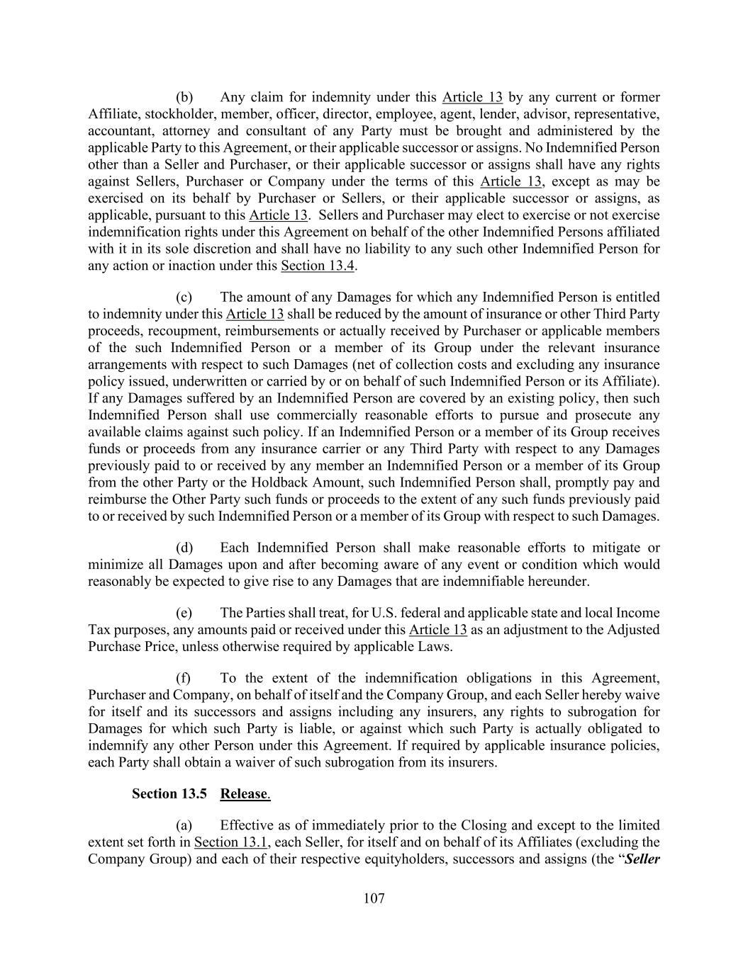 107 (b) Any claim for indemnity under this Article 13 by any current or former Affiliate, stockholder, member, officer, director, employee, agent, lender, advisor, representative, accountant, attorney and consultant of any Party must be brought and administered by the applicable Party to this Agreement, or their applicable successor or assigns. No Indemnified Person other than a Seller and Purchaser, or their applicable successor or assigns shall have any rights against Sellers, Purchaser or Company under the terms of this Article 13, except as may be exercised on its behalf by Purchaser or Sellers, or their applicable successor or assigns, as applicable, pursuant to this Article 13. Sellers and Purchaser may elect to exercise or not exercise indemnification rights under this Agreement on behalf of the other Indemnified Persons affiliated with it in its sole discretion and shall have no liability to any such other Indemnified Person for any action or inaction under this Section 13.4. (c) The amount of any Damages for which any Indemnified Person is entitled to indemnity under this Article 13 shall be reduced by the amount of insurance or other Third Party proceeds, recoupment, reimbursements or actually received by Purchaser or applicable members of the such Indemnified Person or a member of its Group under the relevant insurance arrangements with respect to such Damages (net of collection costs and excluding any insurance policy issued, underwritten or carried by or on behalf of such Indemnified Person or its Affiliate). If any Damages suffered by an Indemnified Person are covered by an existing policy, then such Indemnified Person shall use commercially reasonable efforts to pursue and prosecute any available claims against such policy. If an Indemnified Person or a member of its Group receives funds or proceeds from any insurance carrier or any Third Party with respect to any Damages previously paid to or received by any member an Indemnified Person or a member of its Group from the other Party or the Holdback Amount, such Indemnified Person shall, promptly pay and reimburse the Other Party such funds or proceeds to the extent of any such funds previously paid to or received by such Indemnified Person or a member of its Group with respect to such Damages. (d) Each Indemnified Person shall make reasonable efforts to mitigate or minimize all Damages upon and after becoming aware of any event or condition which would reasonably be expected to give rise to any Damages that are indemnifiable hereunder. (e) The Parties shall treat, for U.S. federal and applicable state and local Income Tax purposes, any amounts paid or received under this Article 13 as an adjustment to the Adjusted Purchase Price, unless otherwise required by applicable Laws. (f) To the extent of the indemnification obligations in this Agreement, Purchaser and Company, on behalf of itself and the Company Group, and each Seller hereby waive for itself and its successors and assigns including any insurers, any rights to subrogation for Damages for which such Party is liable, or against which such Party is actually obligated to indemnify any other Person under this Agreement. If required by applicable insurance policies, each Party shall obtain a waiver of such subrogation from its insurers. Section 13.5 Release. (a) Effective as of immediately prior to the Closing and except to the limited extent set forth in Section 13.1, each Seller, for itself and on behalf of its Affiliates (excluding the Company Group) and each of their respective equityholders, successors and assigns (the “Seller