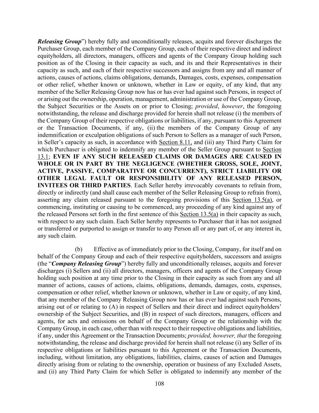 108 Releasing Group”) hereby fully and unconditionally releases, acquits and forever discharges the Purchaser Group, each member of the Company Group, each of their respective direct and indirect equityholders, all directors, managers, officers and agents of the Company Group holding such position as of the Closing in their capacity as such, and its and their Representatives in their capacity as such, and each of their respective successors and assigns from any and all manner of actions, causes of actions, claims obligations, demands, Damages, costs, expenses, compensation or other relief, whether known or unknown, whether in Law or equity, of any kind, that any member of the Seller Releasing Group now has or has ever had against such Persons, in respect of or arising out the ownership, operation, management, administration or use of the Company Group, the Subject Securities or the Assets on or prior to Closing; provided, however, the foregoing notwithstanding, the release and discharge provided for herein shall not release (i) the members of the Company Group of their respective obligations or liabilities, if any, pursuant to this Agreement or the Transaction Documents, if any, (ii) the members of the Company Group of any indemnification or exculpation obligations of such Person to Sellers as a manager of such Person, in Seller’s capacity as such, in accordance with Section 8.11, and (iii) any Third Party Claim for which Purchaser is obligated to indemnify any member of the Seller Group pursuant to Section 13.1; EVEN IF ANY SUCH RELEASED CLAIMS OR DAMAGES ARE CAUSED IN WHOLE OR IN PART BY THE NEGLIGENCE (WHETHER GROSS, SOLE, JOINT, ACTIVE, PASSIVE, COMPARATIVE OR CONCURRENT), STRICT LIABILITY OR OTHER LEGAL FAULT OR RESPONSIBILITY OF ANY RELEASED PERSON, INVITEES OR THIRD PARTIES. Each Seller hereby irrevocably covenants to refrain from, directly or indirectly (and shall cause each member of the Seller Releasing Group to refrain from), asserting any claim released pursuant to the foregoing provisions of this Section 13.5(a), or commencing, instituting or causing to be commenced, any proceeding of any kind against any of the released Persons set forth in the first sentence of this Section 13.5(a) in their capacity as such, with respect to any such claim. Each Seller hereby represents to Purchaser that it has not assigned or transferred or purported to assign or transfer to any Person all or any part of, or any interest in, any such claim. (b) Effective as of immediately prior to the Closing, Company, for itself and on behalf of the Company Group and each of their respective equityholders, successors and assigns (the “Company Releasing Group”) hereby fully and unconditionally releases, acquits and forever discharges (i) Sellers and (ii) all directors, managers, officers and agents of the Company Group holding such position at any time prior to the Closing in their capacity as such from any and all manner of actions, causes of actions, claims, obligations, demands, damages, costs, expenses, compensation or other relief, whether known or unknown, whether in Law or equity, of any kind, that any member of the Company Releasing Group now has or has ever had against such Persons, arising out of or relating to (A) in respect of Sellers and their direct and indirect equityholders’ ownership of the Subject Securities, and (B) in respect of such directors, managers, officers and agents, for acts and omissions on behalf of the Company Group or the relationship with the Company Group, in each case, other than with respect to their respective obligations and liabilities, if any, under this Agreement or the Transaction Documents; provided, however, that the foregoing notwithstanding, the release and discharge provided for herein shall not release (i) any Seller of its respective obligations or liabilities pursuant to this Agreement or the Transaction Documents, including, without limitation, any obligations, liabilities, claims, causes of action and Damages directly arising from or relating to the ownership, operation or business of any Excluded Assets, and (ii) any Third Party Claim for which Seller is obligated to indemnify any member of the