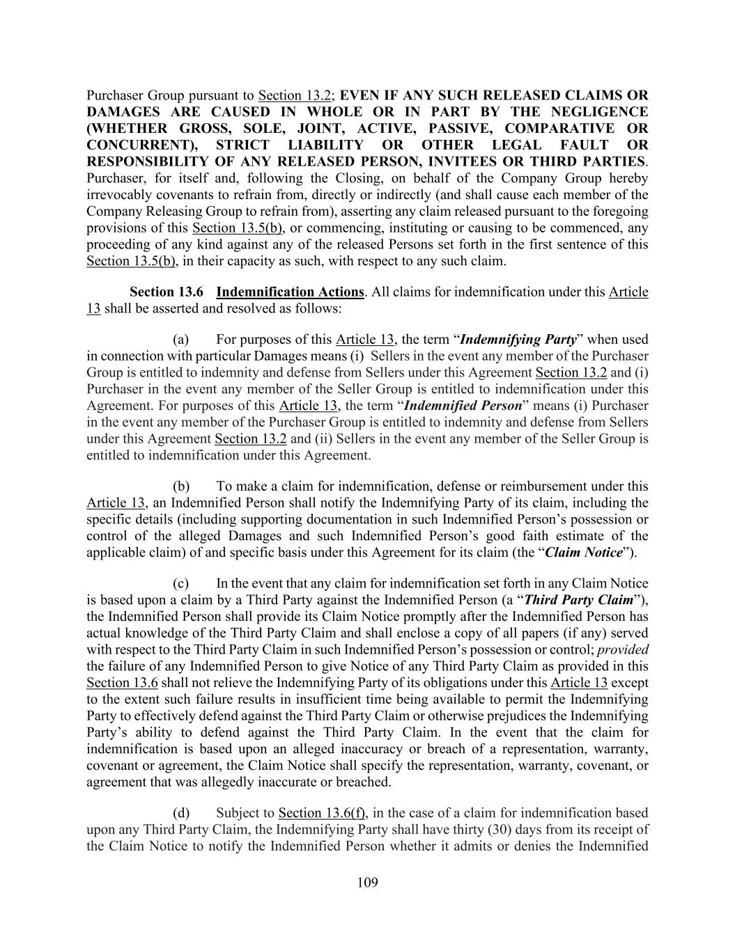 109 Purchaser Group pursuant to Section 13.2; EVEN IF ANY SUCH RELEASED CLAIMS OR DAMAGES ARE CAUSED IN WHOLE OR IN PART BY THE NEGLIGENCE (WHETHER GROSS, SOLE, JOINT, ACTIVE, PASSIVE, COMPARATIVE OR CONCURRENT), STRICT LIABILITY OR OTHER LEGAL FAULT OR RESPONSIBILITY OF ANY RELEASED PERSON, INVITEES OR THIRD PARTIES. Purchaser, for itself and, following the Closing, on behalf of the Company Group hereby irrevocably covenants to refrain from, directly or indirectly (and shall cause each member of the Company Releasing Group to refrain from), asserting any claim released pursuant to the foregoing provisions of this Section 13.5(b), or commencing, instituting or causing to be commenced, any proceeding of any kind against any of the released Persons set forth in the first sentence of this Section 13.5(b), in their capacity as such, with respect to any such claim. Section 13.6 Indemnification Actions. All claims for indemnification under this Article 13 shall be asserted and resolved as follows: (a) For purposes of this Article 13, the term “Indemnifying Party” when used in connection with particular Damages means (i) Sellers in the event any member of the Purchaser Group is entitled to indemnity and defense from Sellers under this Agreement Section 13.2 and (i) Purchaser in the event any member of the Seller Group is entitled to indemnification under this Agreement. For purposes of this Article 13, the term “Indemnified Person” means (i) Purchaser in the event any member of the Purchaser Group is entitled to indemnity and defense from Sellers under this Agreement Section 13.2 and (ii) Sellers in the event any member of the Seller Group is entitled to indemnification under this Agreement. (b) To make a claim for indemnification, defense or reimbursement under this Article 13, an Indemnified Person shall notify the Indemnifying Party of its claim, including the specific details (including supporting documentation in such Indemnified Person’s possession or control of the alleged Damages and such Indemnified Person’s good faith estimate of the applicable claim) of and specific basis under this Agreement for its claim (the “Claim Notice”). (c) In the event that any claim for indemnification set forth in any Claim Notice is based upon a claim by a Third Party against the Indemnified Person (a “Third Party Claim”), the Indemnified Person shall provide its Claim Notice promptly after the Indemnified Person has actual knowledge of the Third Party Claim and shall enclose a copy of all papers (if any) served with respect to the Third Party Claim in such Indemnified Person’s possession or control; provided the failure of any Indemnified Person to give Notice of any Third Party Claim as provided in this Section 13.6 shall not relieve the Indemnifying Party of its obligations under this Article 13 except to the extent such failure results in insufficient time being available to permit the Indemnifying Party to effectively defend against the Third Party Claim or otherwise prejudices the Indemnifying Party’s ability to defend against the Third Party Claim. In the event that the claim for indemnification is based upon an alleged inaccuracy or breach of a representation, warranty, covenant or agreement, the Claim Notice shall specify the representation, warranty, covenant, or agreement that was allegedly inaccurate or breached. (d) Subject to Section 13.6(f), in the case of a claim for indemnification based upon any Third Party Claim, the Indemnifying Party shall have thirty (30) days from its receipt of the Claim Notice to notify the Indemnified Person whether it admits or denies the Indemnified