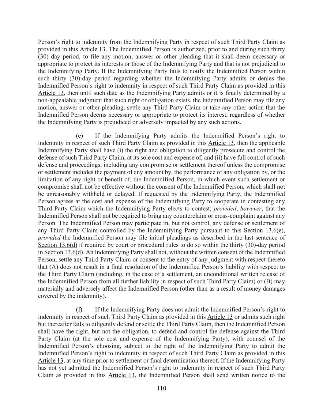 110 Person’s right to indemnity from the Indemnifying Party in respect of such Third Party Claim as provided in this Article 13. The Indemnified Person is authorized, prior to and during such thirty (30) day period, to file any motion, answer or other pleading that it shall deem necessary or appropriate to protect its interests or those of the Indemnifying Party and that is not prejudicial to the Indemnifying Party. If the Indemnifying Party fails to notify the Indemnified Person within such thirty (30)-day period regarding whether the Indemnifying Party admits or denies the Indemnified Person’s right to indemnity in respect of such Third Party Claim as provided in this Article 13, then until such date as the Indemnifying Party admits or it is finally determined by a non-appealable judgment that such right or obligation exists, the Indemnified Person may file any motion, answer or other pleading, settle any Third Party Claim or take any other action that the Indemnified Person deems necessary or appropriate to protect its interest, regardless of whether the Indemnifying Party is prejudiced or adversely impacted by any such actions. (e) If the Indemnifying Party admits the Indemnified Person’s right to indemnity in respect of such Third Party Claim as provided in this Article 13, then the applicable Indemnifying Party shall have (i) the right and obligation to diligently prosecute and control the defense of such Third Party Claim, at its sole cost and expense of, and (ii) have full control of such defense and proceedings, including any compromise or settlement thereof unless the compromise or settlement includes the payment of any amount by, the performance of any obligation by, or the limitation of any right or benefit of, the Indemnified Person, in which event such settlement or compromise shall not be effective without the consent of the Indemnified Person, which shall not be unreasonably withheld or delayed. If requested by the Indemnifying Party, the Indemnified Person agrees at the cost and expense of the Indemnifying Party to cooperate in contesting any Third Party Claim which the Indemnifying Party elects to contest; provided, however, that the Indemnified Person shall not be required to bring any counterclaim or cross-complaint against any Person. The Indemnified Person may participate in, but not control, any defense or settlement of any Third Party Claim controlled by the Indemnifying Party pursuant to this Section 13.6(e), provided the Indemnified Person may file initial pleadings as described in the last sentence of Section 13.6(d) if required by court or procedural rules to do so within the thirty (30)-day period in Section 13.6(d). An Indemnifying Party shall not, without the written consent of the Indemnified Person, settle any Third Party Claim or consent to the entry of any judgment with respect thereto that (A) does not result in a final resolution of the Indemnified Person’s liability with respect to the Third Party Claim (including, in the case of a settlement, an unconditional written release of the Indemnified Person from all further liability in respect of such Third Party Claim) or (B) may materially and adversely affect the Indemnified Person (other than as a result of money damages covered by the indemnity). (f) If the Indemnifying Party does not admit the Indemnified Person’s right to indemnity in respect of such Third Party Claim as provided in this Article 13 or admits such right but thereafter fails to diligently defend or settle the Third Party Claim, then the Indemnified Person shall have the right, but not the obligation, to defend and control the defense against the Third Party Claim (at the sole cost and expense of the Indemnifying Party), with counsel of the Indemnified Person’s choosing, subject to the right of the Indemnifying Party to admit the Indemnified Person’s right to indemnity in respect of such Third Party Claim as provided in this Article 13, at any time prior to settlement or final determination thereof. If the Indemnifying Party has not yet admitted the Indemnified Person’s right to indemnity in respect of such Third Party Claim as provided in this Article 13, the Indemnified Person shall send written notice to the