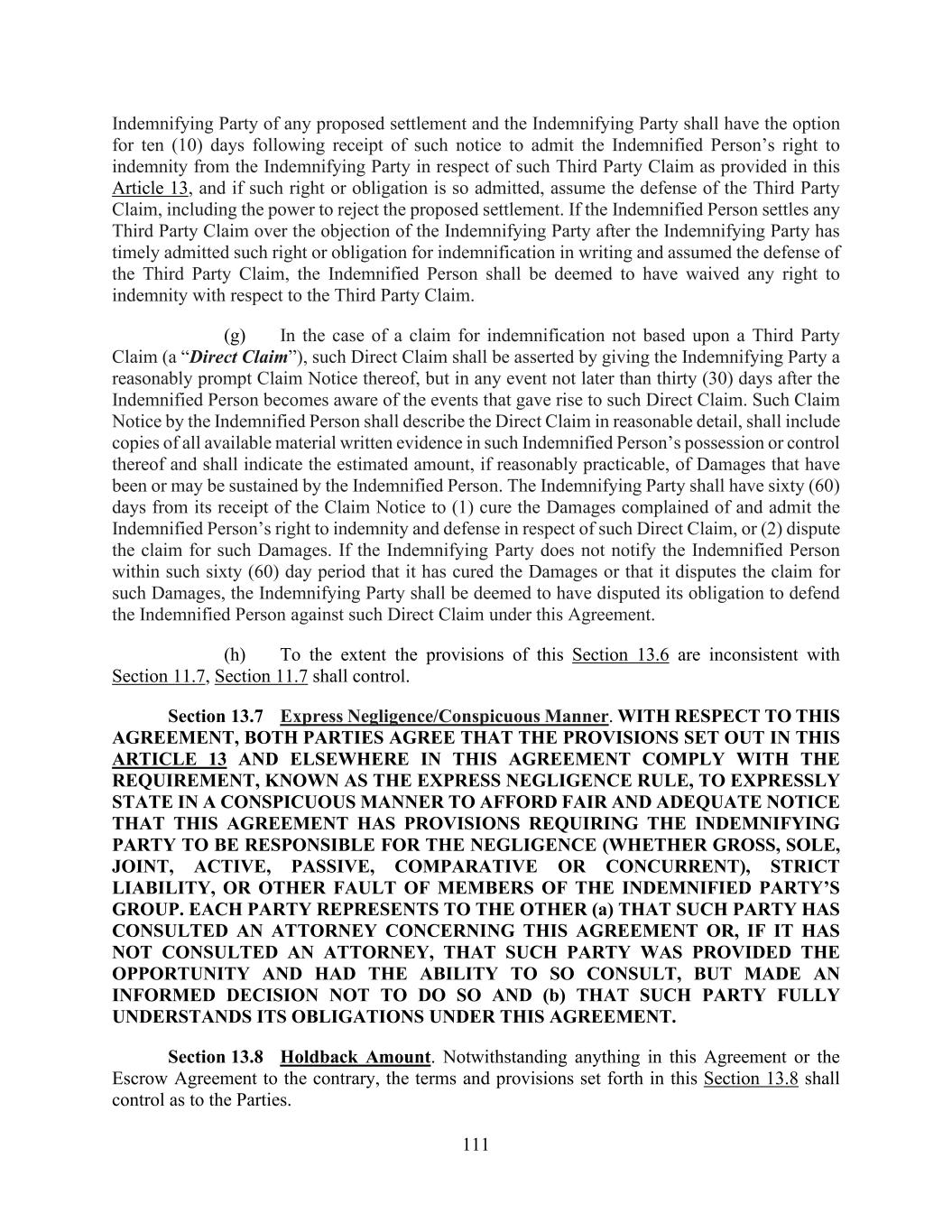 111 Indemnifying Party of any proposed settlement and the Indemnifying Party shall have the option for ten (10) days following receipt of such notice to admit the Indemnified Person’s right to indemnity from the Indemnifying Party in respect of such Third Party Claim as provided in this Article 13, and if such right or obligation is so admitted, assume the defense of the Third Party Claim, including the power to reject the proposed settlement. If the Indemnified Person settles any Third Party Claim over the objection of the Indemnifying Party after the Indemnifying Party has timely admitted such right or obligation for indemnification in writing and assumed the defense of the Third Party Claim, the Indemnified Person shall be deemed to have waived any right to indemnity with respect to the Third Party Claim. (g) In the case of a claim for indemnification not based upon a Third Party Claim (a “Direct Claim”), such Direct Claim shall be asserted by giving the Indemnifying Party a reasonably prompt Claim Notice thereof, but in any event not later than thirty (30) days after the Indemnified Person becomes aware of the events that gave rise to such Direct Claim. Such Claim Notice by the Indemnified Person shall describe the Direct Claim in reasonable detail, shall include copies of all available material written evidence in such Indemnified Person’s possession or control thereof and shall indicate the estimated amount, if reasonably practicable, of Damages that have been or may be sustained by the Indemnified Person. The Indemnifying Party shall have sixty (60) days from its receipt of the Claim Notice to (1) cure the Damages complained of and admit the Indemnified Person’s right to indemnity and defense in respect of such Direct Claim, or (2) dispute the claim for such Damages. If the Indemnifying Party does not notify the Indemnified Person within such sixty (60) day period that it has cured the Damages or that it disputes the claim for such Damages, the Indemnifying Party shall be deemed to have disputed its obligation to defend the Indemnified Person against such Direct Claim under this Agreement. (h) To the extent the provisions of this Section 13.6 are inconsistent with Section 11.7, Section 11.7 shall control. Section 13.7 Express Negligence/Conspicuous Manner. WITH RESPECT TO THIS AGREEMENT, BOTH PARTIES AGREE THAT THE PROVISIONS SET OUT IN THIS ARTICLE 13 AND ELSEWHERE IN THIS AGREEMENT COMPLY WITH THE REQUIREMENT, KNOWN AS THE EXPRESS NEGLIGENCE RULE, TO EXPRESSLY STATE IN A CONSPICUOUS MANNER TO AFFORD FAIR AND ADEQUATE NOTICE THAT THIS AGREEMENT HAS PROVISIONS REQUIRING THE INDEMNIFYING PARTY TO BE RESPONSIBLE FOR THE NEGLIGENCE (WHETHER GROSS, SOLE, JOINT, ACTIVE, PASSIVE, COMPARATIVE OR CONCURRENT), STRICT LIABILITY, OR OTHER FAULT OF MEMBERS OF THE INDEMNIFIED PARTY’S GROUP. EACH PARTY REPRESENTS TO THE OTHER (a) THAT SUCH PARTY HAS CONSULTED AN ATTORNEY CONCERNING THIS AGREEMENT OR, IF IT HAS NOT CONSULTED AN ATTORNEY, THAT SUCH PARTY WAS PROVIDED THE OPPORTUNITY AND HAD THE ABILITY TO SO CONSULT, BUT MADE AN INFORMED DECISION NOT TO DO SO AND (b) THAT SUCH PARTY FULLY UNDERSTANDS ITS OBLIGATIONS UNDER THIS AGREEMENT. Section 13.8 Holdback Amount. Notwithstanding anything in this Agreement or the Escrow Agreement to the contrary, the terms and provisions set forth in this Section 13.8 shall control as to the Parties.