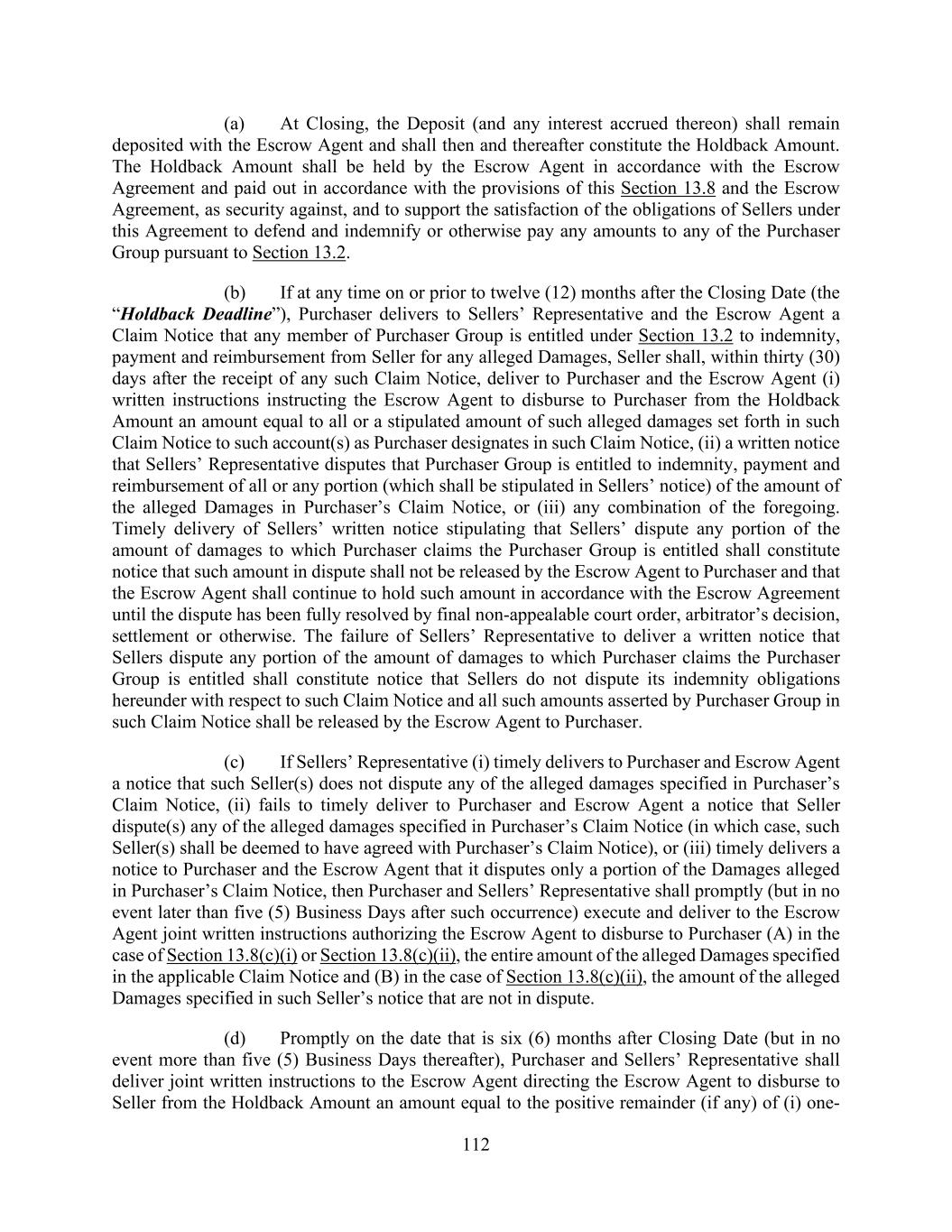 112 (a) At Closing, the Deposit (and any interest accrued thereon) shall remain deposited with the Escrow Agent and shall then and thereafter constitute the Holdback Amount. The Holdback Amount shall be held by the Escrow Agent in accordance with the Escrow Agreement and paid out in accordance with the provisions of this Section 13.8 and the Escrow Agreement, as security against, and to support the satisfaction of the obligations of Sellers under this Agreement to defend and indemnify or otherwise pay any amounts to any of the Purchaser Group pursuant to Section 13.2. (b) If at any time on or prior to twelve (12) months after the Closing Date (the “Holdback Deadline”), Purchaser delivers to Sellers’ Representative and the Escrow Agent a Claim Notice that any member of Purchaser Group is entitled under Section 13.2 to indemnity, payment and reimbursement from Seller for any alleged Damages, Seller shall, within thirty (30) days after the receipt of any such Claim Notice, deliver to Purchaser and the Escrow Agent (i) written instructions instructing the Escrow Agent to disburse to Purchaser from the Holdback Amount an amount equal to all or a stipulated amount of such alleged damages set forth in such Claim Notice to such account(s) as Purchaser designates in such Claim Notice, (ii) a written notice that Sellers’ Representative disputes that Purchaser Group is entitled to indemnity, payment and reimbursement of all or any portion (which shall be stipulated in Sellers’ notice) of the amount of the alleged Damages in Purchaser’s Claim Notice, or (iii) any combination of the foregoing. Timely delivery of Sellers’ written notice stipulating that Sellers’ dispute any portion of the amount of damages to which Purchaser claims the Purchaser Group is entitled shall constitute notice that such amount in dispute shall not be released by the Escrow Agent to Purchaser and that the Escrow Agent shall continue to hold such amount in accordance with the Escrow Agreement until the dispute has been fully resolved by final non-appealable court order, arbitrator’s decision, settlement or otherwise. The failure of Sellers’ Representative to deliver a written notice that Sellers dispute any portion of the amount of damages to which Purchaser claims the Purchaser Group is entitled shall constitute notice that Sellers do not dispute its indemnity obligations hereunder with respect to such Claim Notice and all such amounts asserted by Purchaser Group in such Claim Notice shall be released by the Escrow Agent to Purchaser. (c) If Sellers’ Representative (i) timely delivers to Purchaser and Escrow Agent a notice that such Seller(s) does not dispute any of the alleged damages specified in Purchaser’s Claim Notice, (ii) fails to timely deliver to Purchaser and Escrow Agent a notice that Seller dispute(s) any of the alleged damages specified in Purchaser’s Claim Notice (in which case, such Seller(s) shall be deemed to have agreed with Purchaser’s Claim Notice), or (iii) timely delivers a notice to Purchaser and the Escrow Agent that it disputes only a portion of the Damages alleged in Purchaser’s Claim Notice, then Purchaser and Sellers’ Representative shall promptly (but in no event later than five (5) Business Days after such occurrence) execute and deliver to the Escrow Agent joint written instructions authorizing the Escrow Agent to disburse to Purchaser (A) in the case of Section 13.8(c)(i) or Section 13.8(c)(ii), the entire amount of the alleged Damages specified in the applicable Claim Notice and (B) in the case of Section 13.8(c)(ii), the amount of the alleged Damages specified in such Seller’s notice that are not in dispute. (d) Promptly on the date that is six (6) months after Closing Date (but in no event more than five (5) Business Days thereafter), Purchaser and Sellers’ Representative shall deliver joint written instructions to the Escrow Agent directing the Escrow Agent to disburse to Seller from the Holdback Amount an amount equal to the positive remainder (if any) of (i) one-