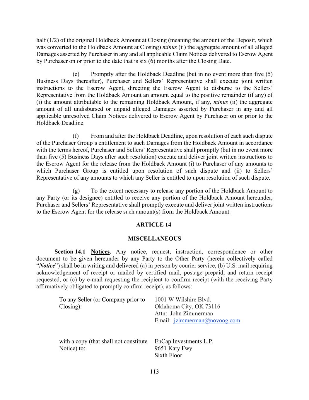 113 half (1/2) of the original Holdback Amount at Closing (meaning the amount of the Deposit, which was converted to the Holdback Amount at Closing) minus (ii) the aggregate amount of all alleged Damages asserted by Purchaser in any and all applicable Claim Notices delivered to Escrow Agent by Purchaser on or prior to the date that is six (6) months after the Closing Date. (e) Promptly after the Holdback Deadline (but in no event more than five (5) Business Days thereafter), Purchaser and Sellers’ Representative shall execute joint written instructions to the Escrow Agent, directing the Escrow Agent to disburse to the Sellers’ Representative from the Holdback Amount an amount equal to the positive remainder (if any) of (i) the amount attributable to the remaining Holdback Amount, if any, minus (ii) the aggregate amount of all undisbursed or unpaid alleged Damages asserted by Purchaser in any and all applicable unresolved Claim Notices delivered to Escrow Agent by Purchaser on or prior to the Holdback Deadline. (f) From and after the Holdback Deadline, upon resolution of each such dispute of the Purchaser Group’s entitlement to such Damages from the Holdback Amount in accordance with the terms hereof, Purchaser and Sellers’ Representative shall promptly (but in no event more than five (5) Business Days after such resolution) execute and deliver joint written instructions to the Escrow Agent for the release from the Holdback Amount (i) to Purchaser of any amounts to which Purchaser Group is entitled upon resolution of such dispute and (ii) to Sellers’ Representative of any amounts to which any Seller is entitled to upon resolution of such dispute. (g) To the extent necessary to release any portion of the Holdback Amount to any Party (or its designee) entitled to receive any portion of the Holdback Amount hereunder, Purchaser and Sellers’ Representative shall promptly execute and deliver joint written instructions to the Escrow Agent for the release such amount(s) from the Holdback Amount. ARTICLE 14 MISCELLANEOUS Section 14.1 Notices. Any notice, request, instruction, correspondence or other document to be given hereunder by any Party to the Other Party (herein collectively called “Notice”) shall be in writing and delivered (a) in person by courier service, (b) U.S. mail requiring acknowledgement of receipt or mailed by certified mail, postage prepaid, and return receipt requested, or (c) by e-mail requesting the recipient to confirm receipt (with the receiving Party affirmatively obligated to promptly confirm receipt), as follows: To any Seller (or Company prior to Closing): 1001 W Wilshire Blvd. Oklahoma City, OK 73116 Attn: John Zimmerman Email: jzimmerman@novoog.com with a copy (that shall not constitute Notice) to: EnCap Investments L.P. 9651 Katy Fwy Sixth Floor