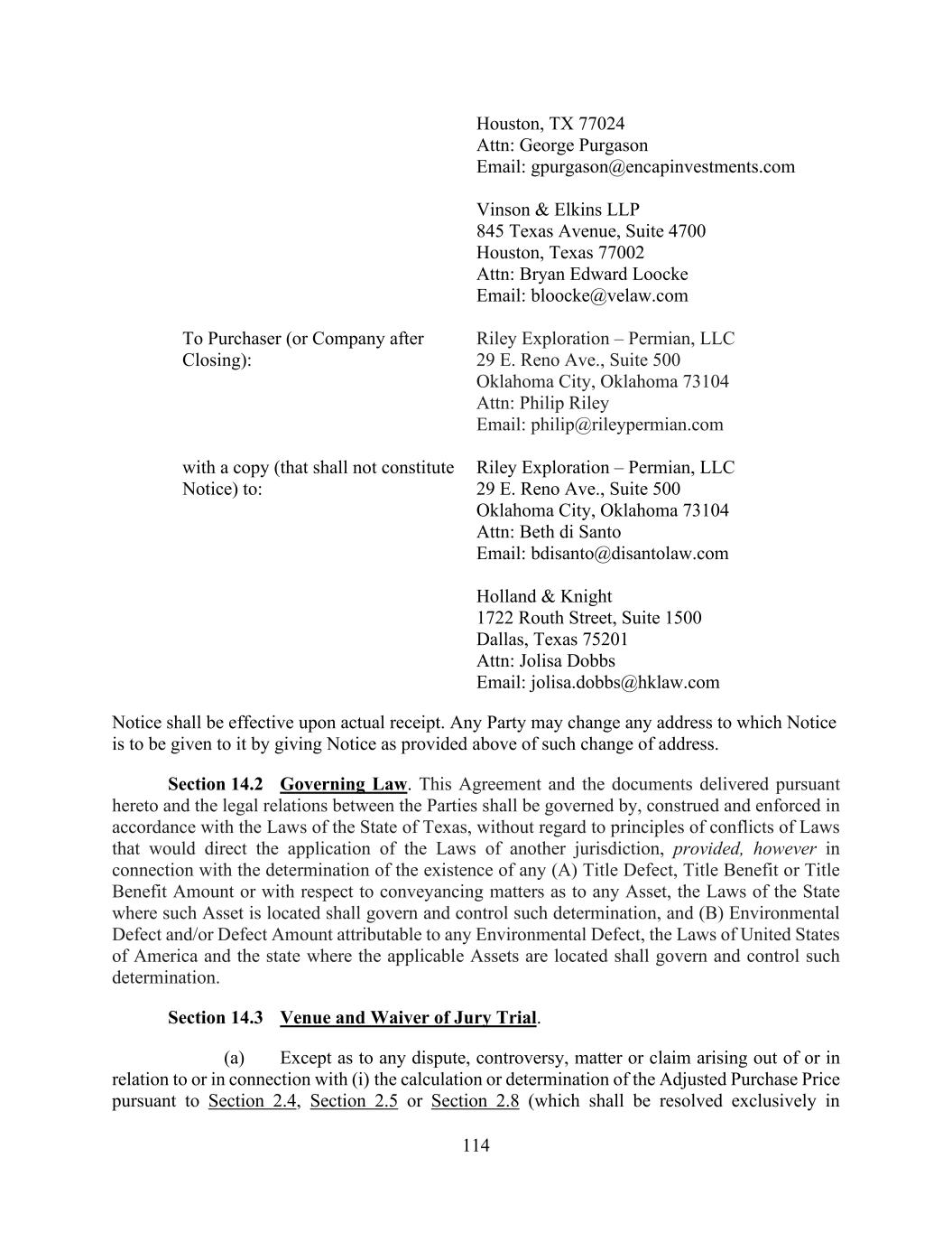 114 Houston, TX 77024 Attn: George Purgason Email: gpurgason@encapinvestments.com Vinson & Elkins LLP 845 Texas Avenue, Suite 4700 Houston, Texas 77002 Attn: Bryan Edward Loocke Email: bloocke@velaw.com To Purchaser (or Company after Closing): Riley Exploration – Permian, LLC 29 E. Reno Ave., Suite 500 Oklahoma City, Oklahoma 73104 Attn: Philip Riley Email: philip@rileypermian.com with a copy (that shall not constitute Notice) to: Riley Exploration – Permian, LLC 29 E. Reno Ave., Suite 500 Oklahoma City, Oklahoma 73104 Attn: Beth di Santo Email: bdisanto@disantolaw.com Holland & Knight 1722 Routh Street, Suite 1500 Dallas, Texas 75201 Attn: Jolisa Dobbs Email: jolisa.dobbs@hklaw.com Notice shall be effective upon actual receipt. Any Party may change any address to which Notice is to be given to it by giving Notice as provided above of such change of address. Section 14.2 Governing Law. This Agreement and the documents delivered pursuant hereto and the legal relations between the Parties shall be governed by, construed and enforced in accordance with the Laws of the State of Texas, without regard to principles of conflicts of Laws that would direct the application of the Laws of another jurisdiction, provided, however in connection with the determination of the existence of any (A) Title Defect, Title Benefit or Title Benefit Amount or with respect to conveyancing matters as to any Asset, the Laws of the State where such Asset is located shall govern and control such determination, and (B) Environmental Defect and/or Defect Amount attributable to any Environmental Defect, the Laws of United States of America and the state where the applicable Assets are located shall govern and control such determination. Section 14.3 Venue and Waiver of Jury Trial. (a) Except as to any dispute, controversy, matter or claim arising out of or in relation to or in connection with (i) the calculation or determination of the Adjusted Purchase Price pursuant to Section 2.4, Section 2.5 or Section 2.8 (which shall be resolved exclusively in