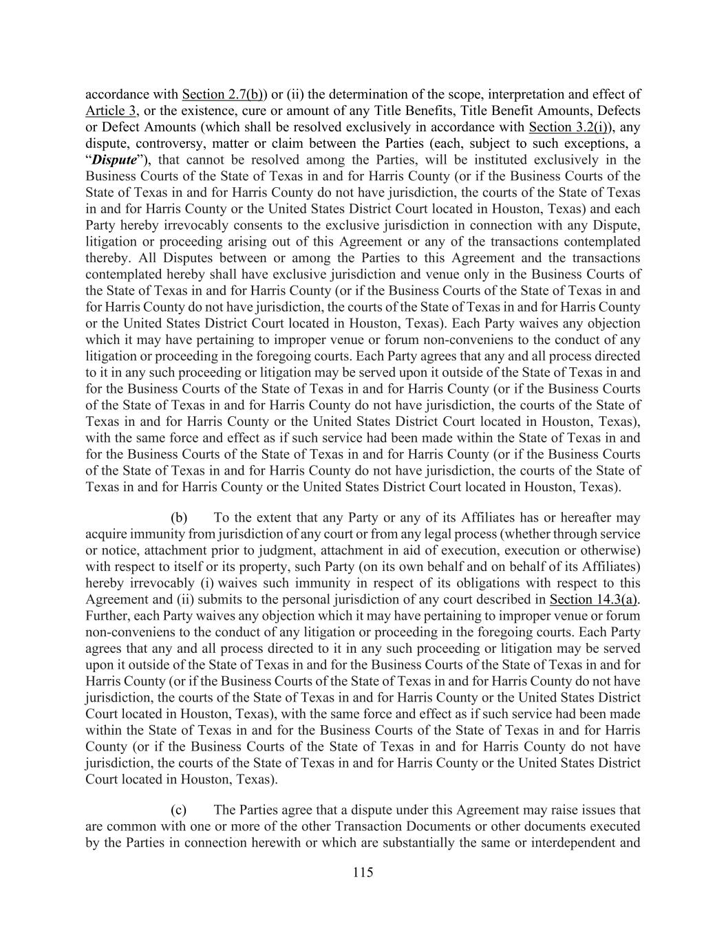 115 accordance with Section 2.7(b)) or (ii) the determination of the scope, interpretation and effect of Article 3, or the existence, cure or amount of any Title Benefits, Title Benefit Amounts, Defects or Defect Amounts (which shall be resolved exclusively in accordance with Section 3.2(i)), any dispute, controversy, matter or claim between the Parties (each, subject to such exceptions, a “Dispute”), that cannot be resolved among the Parties, will be instituted exclusively in the Business Courts of the State of Texas in and for Harris County (or if the Business Courts of the State of Texas in and for Harris County do not have jurisdiction, the courts of the State of Texas in and for Harris County or the United States District Court located in Houston, Texas) and each Party hereby irrevocably consents to the exclusive jurisdiction in connection with any Dispute, litigation or proceeding arising out of this Agreement or any of the transactions contemplated thereby. All Disputes between or among the Parties to this Agreement and the transactions contemplated hereby shall have exclusive jurisdiction and venue only in the Business Courts of the State of Texas in and for Harris County (or if the Business Courts of the State of Texas in and for Harris County do not have jurisdiction, the courts of the State of Texas in and for Harris County or the United States District Court located in Houston, Texas). Each Party waives any objection which it may have pertaining to improper venue or forum non-conveniens to the conduct of any litigation or proceeding in the foregoing courts. Each Party agrees that any and all process directed to it in any such proceeding or litigation may be served upon it outside of the State of Texas in and for the Business Courts of the State of Texas in and for Harris County (or if the Business Courts of the State of Texas in and for Harris County do not have jurisdiction, the courts of the State of Texas in and for Harris County or the United States District Court located in Houston, Texas), with the same force and effect as if such service had been made within the State of Texas in and for the Business Courts of the State of Texas in and for Harris County (or if the Business Courts of the State of Texas in and for Harris County do not have jurisdiction, the courts of the State of Texas in and for Harris County or the United States District Court located in Houston, Texas). (b) To the extent that any Party or any of its Affiliates has or hereafter may acquire immunity from jurisdiction of any court or from any legal process (whether through service or notice, attachment prior to judgment, attachment in aid of execution, execution or otherwise) with respect to itself or its property, such Party (on its own behalf and on behalf of its Affiliates) hereby irrevocably (i) waives such immunity in respect of its obligations with respect to this Agreement and (ii) submits to the personal jurisdiction of any court described in Section 14.3(a). Further, each Party waives any objection which it may have pertaining to improper venue or forum non-conveniens to the conduct of any litigation or proceeding in the foregoing courts. Each Party agrees that any and all process directed to it in any such proceeding or litigation may be served upon it outside of the State of Texas in and for the Business Courts of the State of Texas in and for Harris County (or if the Business Courts of the State of Texas in and for Harris County do not have jurisdiction, the courts of the State of Texas in and for Harris County or the United States District Court located in Houston, Texas), with the same force and effect as if such service had been made within the State of Texas in and for the Business Courts of the State of Texas in and for Harris County (or if the Business Courts of the State of Texas in and for Harris County do not have jurisdiction, the courts of the State of Texas in and for Harris County or the United States District Court located in Houston, Texas). (c) The Parties agree that a dispute under this Agreement may raise issues that are common with one or more of the other Transaction Documents or other documents executed by the Parties in connection herewith or which are substantially the same or interdependent and