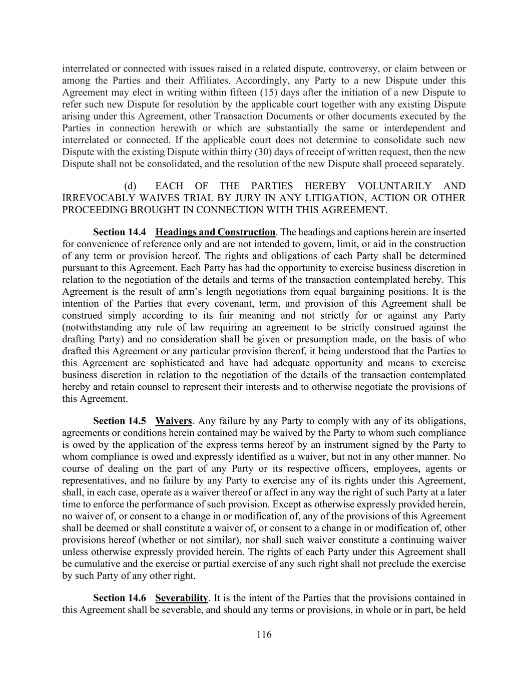 116 interrelated or connected with issues raised in a related dispute, controversy, or claim between or among the Parties and their Affiliates. Accordingly, any Party to a new Dispute under this Agreement may elect in writing within fifteen (15) days after the initiation of a new Dispute to refer such new Dispute for resolution by the applicable court together with any existing Dispute arising under this Agreement, other Transaction Documents or other documents executed by the Parties in connection herewith or which are substantially the same or interdependent and interrelated or connected. If the applicable court does not determine to consolidate such new Dispute with the existing Dispute within thirty (30) days of receipt of written request, then the new Dispute shall not be consolidated, and the resolution of the new Dispute shall proceed separately. (d) EACH OF THE PARTIES HEREBY VOLUNTARILY AND IRREVOCABLY WAIVES TRIAL BY JURY IN ANY LITIGATION, ACTION OR OTHER PROCEEDING BROUGHT IN CONNECTION WITH THIS AGREEMENT. Section 14.4 Headings and Construction. The headings and captions herein are inserted for convenience of reference only and are not intended to govern, limit, or aid in the construction of any term or provision hereof. The rights and obligations of each Party shall be determined pursuant to this Agreement. Each Party has had the opportunity to exercise business discretion in relation to the negotiation of the details and terms of the transaction contemplated hereby. This Agreement is the result of arm’s length negotiations from equal bargaining positions. It is the intention of the Parties that every covenant, term, and provision of this Agreement shall be construed simply according to its fair meaning and not strictly for or against any Party (notwithstanding any rule of law requiring an agreement to be strictly construed against the drafting Party) and no consideration shall be given or presumption made, on the basis of who drafted this Agreement or any particular provision thereof, it being understood that the Parties to this Agreement are sophisticated and have had adequate opportunity and means to exercise business discretion in relation to the negotiation of the details of the transaction contemplated hereby and retain counsel to represent their interests and to otherwise negotiate the provisions of this Agreement. Section 14.5 Waivers. Any failure by any Party to comply with any of its obligations, agreements or conditions herein contained may be waived by the Party to whom such compliance is owed by the application of the express terms hereof by an instrument signed by the Party to whom compliance is owed and expressly identified as a waiver, but not in any other manner. No course of dealing on the part of any Party or its respective officers, employees, agents or representatives, and no failure by any Party to exercise any of its rights under this Agreement, shall, in each case, operate as a waiver thereof or affect in any way the right of such Party at a later time to enforce the performance of such provision. Except as otherwise expressly provided herein, no waiver of, or consent to a change in or modification of, any of the provisions of this Agreement shall be deemed or shall constitute a waiver of, or consent to a change in or modification of, other provisions hereof (whether or not similar), nor shall such waiver constitute a continuing waiver unless otherwise expressly provided herein. The rights of each Party under this Agreement shall be cumulative and the exercise or partial exercise of any such right shall not preclude the exercise by such Party of any other right. Section 14.6 Severability. It is the intent of the Parties that the provisions contained in this Agreement shall be severable, and should any terms or provisions, in whole or in part, be held