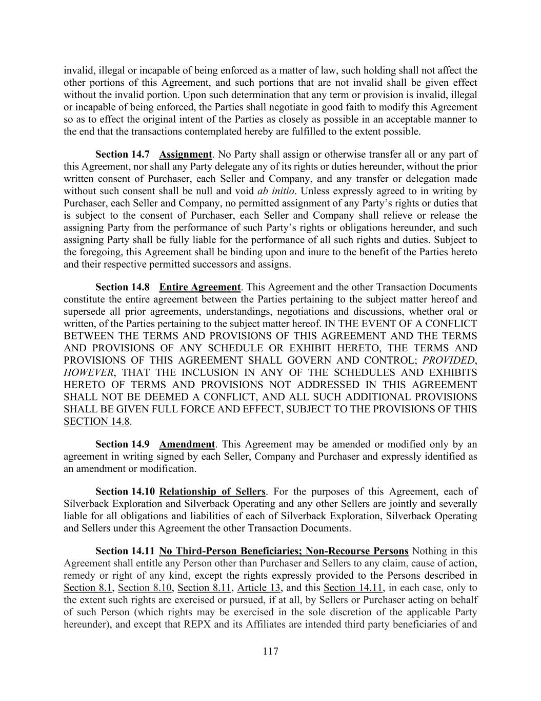 117 invalid, illegal or incapable of being enforced as a matter of law, such holding shall not affect the other portions of this Agreement, and such portions that are not invalid shall be given effect without the invalid portion. Upon such determination that any term or provision is invalid, illegal or incapable of being enforced, the Parties shall negotiate in good faith to modify this Agreement so as to effect the original intent of the Parties as closely as possible in an acceptable manner to the end that the transactions contemplated hereby are fulfilled to the extent possible. Section 14.7 Assignment. No Party shall assign or otherwise transfer all or any part of this Agreement, nor shall any Party delegate any of its rights or duties hereunder, without the prior written consent of Purchaser, each Seller and Company, and any transfer or delegation made without such consent shall be null and void ab initio. Unless expressly agreed to in writing by Purchaser, each Seller and Company, no permitted assignment of any Party’s rights or duties that is subject to the consent of Purchaser, each Seller and Company shall relieve or release the assigning Party from the performance of such Party’s rights or obligations hereunder, and such assigning Party shall be fully liable for the performance of all such rights and duties. Subject to the foregoing, this Agreement shall be binding upon and inure to the benefit of the Parties hereto and their respective permitted successors and assigns. Section 14.8 Entire Agreement. This Agreement and the other Transaction Documents constitute the entire agreement between the Parties pertaining to the subject matter hereof and supersede all prior agreements, understandings, negotiations and discussions, whether oral or written, of the Parties pertaining to the subject matter hereof. IN THE EVENT OF A CONFLICT BETWEEN THE TERMS AND PROVISIONS OF THIS AGREEMENT AND THE TERMS AND PROVISIONS OF ANY SCHEDULE OR EXHIBIT HERETO, THE TERMS AND PROVISIONS OF THIS AGREEMENT SHALL GOVERN AND CONTROL; PROVIDED, HOWEVER, THAT THE INCLUSION IN ANY OF THE SCHEDULES AND EXHIBITS HERETO OF TERMS AND PROVISIONS NOT ADDRESSED IN THIS AGREEMENT SHALL NOT BE DEEMED A CONFLICT, AND ALL SUCH ADDITIONAL PROVISIONS SHALL BE GIVEN FULL FORCE AND EFFECT, SUBJECT TO THE PROVISIONS OF THIS SECTION 14.8. Section 14.9 Amendment. This Agreement may be amended or modified only by an agreement in writing signed by each Seller, Company and Purchaser and expressly identified as an amendment or modification. Section 14.10 Relationship of Sellers. For the purposes of this Agreement, each of Silverback Exploration and Silverback Operating and any other Sellers are jointly and severally liable for all obligations and liabilities of each of Silverback Exploration, Silverback Operating and Sellers under this Agreement the other Transaction Documents. Section 14.11 No Third-Person Beneficiaries; Non-Recourse Persons Nothing in this Agreement shall entitle any Person other than Purchaser and Sellers to any claim, cause of action, remedy or right of any kind, except the rights expressly provided to the Persons described in Section 8.1, Section 8.10, Section 8.11, Article 13, and this Section 14.11, in each case, only to the extent such rights are exercised or pursued, if at all, by Sellers or Purchaser acting on behalf of such Person (which rights may be exercised in the sole discretion of the applicable Party hereunder), and except that REPX and its Affiliates are intended third party beneficiaries of and