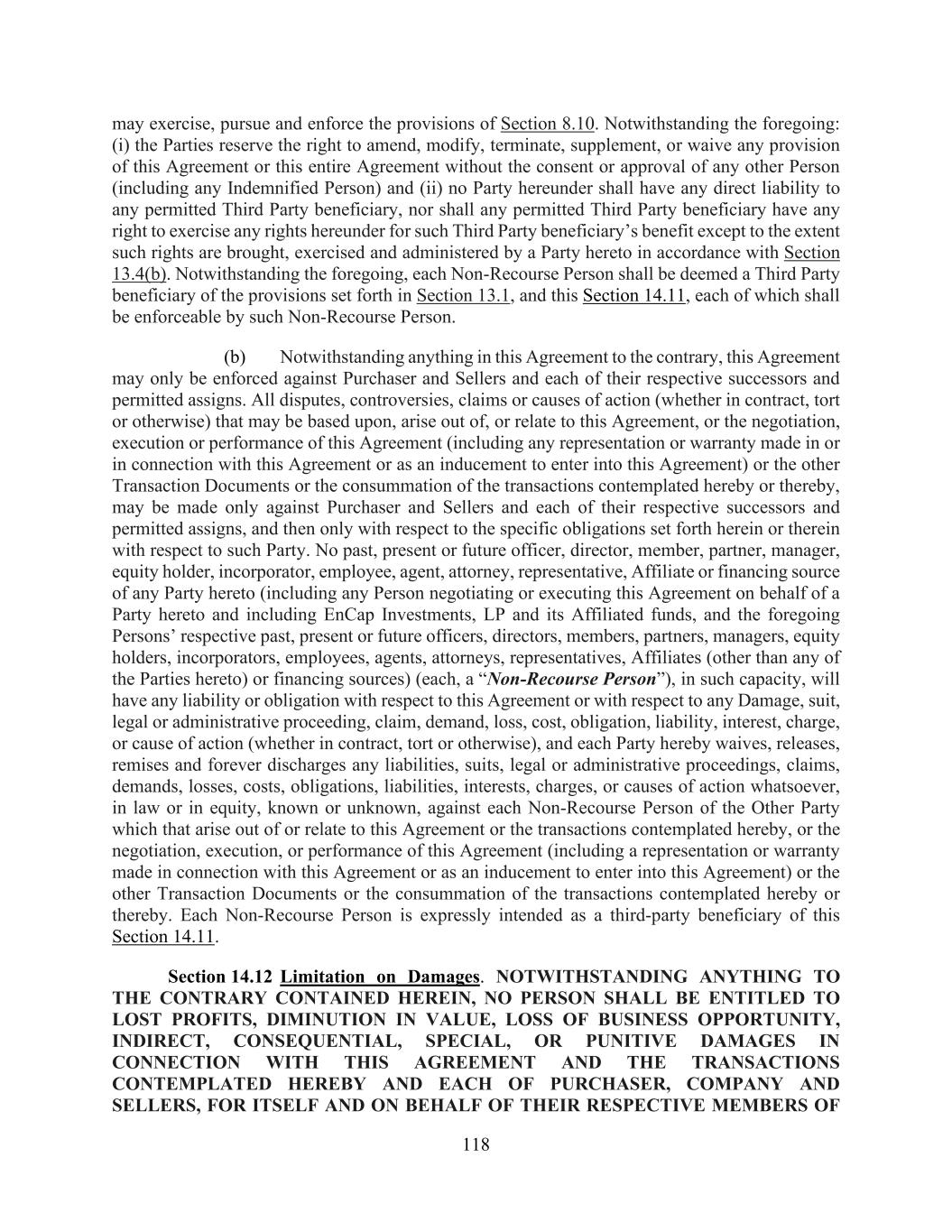 118 may exercise, pursue and enforce the provisions of Section 8.10. Notwithstanding the foregoing: (i) the Parties reserve the right to amend, modify, terminate, supplement, or waive any provision of this Agreement or this entire Agreement without the consent or approval of any other Person (including any Indemnified Person) and (ii) no Party hereunder shall have any direct liability to any permitted Third Party beneficiary, nor shall any permitted Third Party beneficiary have any right to exercise any rights hereunder for such Third Party beneficiary’s benefit except to the extent such rights are brought, exercised and administered by a Party hereto in accordance with Section 13.4(b). Notwithstanding the foregoing, each Non-Recourse Person shall be deemed a Third Party beneficiary of the provisions set forth in Section 13.1, and this Section 14.11, each of which shall be enforceable by such Non-Recourse Person. (b) Notwithstanding anything in this Agreement to the contrary, this Agreement may only be enforced against Purchaser and Sellers and each of their respective successors and permitted assigns. All disputes, controversies, claims or causes of action (whether in contract, tort or otherwise) that may be based upon, arise out of, or relate to this Agreement, or the negotiation, execution or performance of this Agreement (including any representation or warranty made in or in connection with this Agreement or as an inducement to enter into this Agreement) or the other Transaction Documents or the consummation of the transactions contemplated hereby or thereby, may be made only against Purchaser and Sellers and each of their respective successors and permitted assigns, and then only with respect to the specific obligations set forth herein or therein with respect to such Party. No past, present or future officer, director, member, partner, manager, equity holder, incorporator, employee, agent, attorney, representative, Affiliate or financing source of any Party hereto (including any Person negotiating or executing this Agreement on behalf of a Party hereto and including EnCap Investments, LP and its Affiliated funds, and the foregoing Persons’ respective past, present or future officers, directors, members, partners, managers, equity holders, incorporators, employees, agents, attorneys, representatives, Affiliates (other than any of the Parties hereto) or financing sources) (each, a “Non-Recourse Person”), in such capacity, will have any liability or obligation with respect to this Agreement or with respect to any Damage, suit, legal or administrative proceeding, claim, demand, loss, cost, obligation, liability, interest, charge, or cause of action (whether in contract, tort or otherwise), and each Party hereby waives, releases, remises and forever discharges any liabilities, suits, legal or administrative proceedings, claims, demands, losses, costs, obligations, liabilities, interests, charges, or causes of action whatsoever, in law or in equity, known or unknown, against each Non-Recourse Person of the Other Party which that arise out of or relate to this Agreement or the transactions contemplated hereby, or the negotiation, execution, or performance of this Agreement (including a representation or warranty made in connection with this Agreement or as an inducement to enter into this Agreement) or the other Transaction Documents or the consummation of the transactions contemplated hereby or thereby. Each Non-Recourse Person is expressly intended as a third-party beneficiary of this Section 14.11. Section 14.12 Limitation on Damages. NOTWITHSTANDING ANYTHING TO THE CONTRARY CONTAINED HEREIN, NO PERSON SHALL BE ENTITLED TO LOST PROFITS, DIMINUTION IN VALUE, LOSS OF BUSINESS OPPORTUNITY, INDIRECT, CONSEQUENTIAL, SPECIAL, OR PUNITIVE DAMAGES IN CONNECTION WITH THIS AGREEMENT AND THE TRANSACTIONS CONTEMPLATED HEREBY AND EACH OF PURCHASER, COMPANY AND SELLERS, FOR ITSELF AND ON BEHALF OF THEIR RESPECTIVE MEMBERS OF
