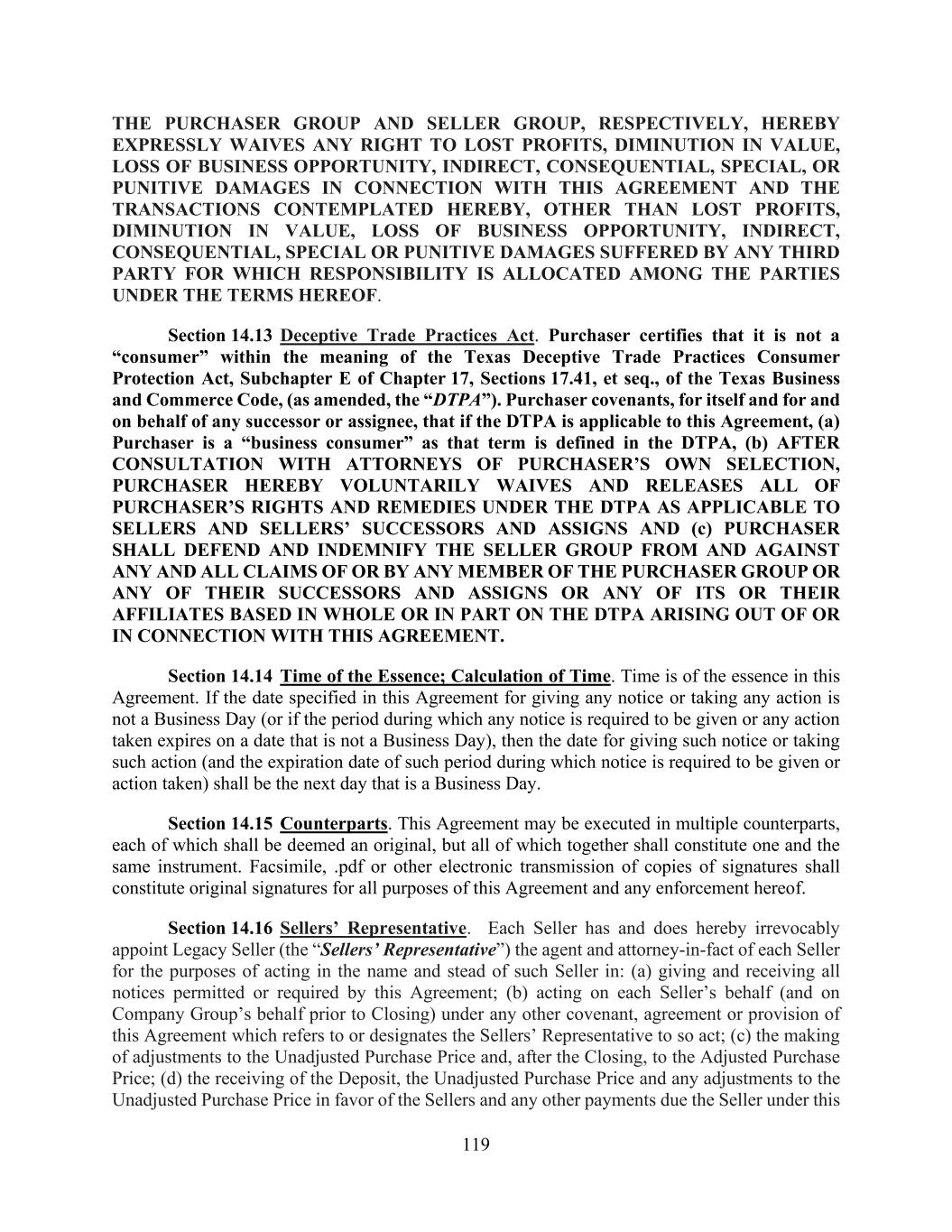 119 THE PURCHASER GROUP AND SELLER GROUP, RESPECTIVELY, HEREBY EXPRESSLY WAIVES ANY RIGHT TO LOST PROFITS, DIMINUTION IN VALUE, LOSS OF BUSINESS OPPORTUNITY, INDIRECT, CONSEQUENTIAL, SPECIAL, OR PUNITIVE DAMAGES IN CONNECTION WITH THIS AGREEMENT AND THE TRANSACTIONS CONTEMPLATED HEREBY, OTHER THAN LOST PROFITS, DIMINUTION IN VALUE, LOSS OF BUSINESS OPPORTUNITY, INDIRECT, CONSEQUENTIAL, SPECIAL OR PUNITIVE DAMAGES SUFFERED BY ANY THIRD PARTY FOR WHICH RESPONSIBILITY IS ALLOCATED AMONG THE PARTIES UNDER THE TERMS HEREOF. Section 14.13 Deceptive Trade Practices Act. Purchaser certifies that it is not a “consumer” within the meaning of the Texas Deceptive Trade Practices Consumer Protection Act, Subchapter E of Chapter 17, Sections 17.41, et seq., of the Texas Business and Commerce Code, (as amended, the “DTPA”). Purchaser covenants, for itself and for and on behalf of any successor or assignee, that if the DTPA is applicable to this Agreement, (a) Purchaser is a “business consumer” as that term is defined in the DTPA, (b) AFTER CONSULTATION WITH ATTORNEYS OF PURCHASER’S OWN SELECTION, PURCHASER HEREBY VOLUNTARILY WAIVES AND RELEASES ALL OF PURCHASER’S RIGHTS AND REMEDIES UNDER THE DTPA AS APPLICABLE TO SELLERS AND SELLERS’ SUCCESSORS AND ASSIGNS AND (c) PURCHASER SHALL DEFEND AND INDEMNIFY THE SELLER GROUP FROM AND AGAINST ANY AND ALL CLAIMS OF OR BY ANY MEMBER OF THE PURCHASER GROUP OR ANY OF THEIR SUCCESSORS AND ASSIGNS OR ANY OF ITS OR THEIR AFFILIATES BASED IN WHOLE OR IN PART ON THE DTPA ARISING OUT OF OR IN CONNECTION WITH THIS AGREEMENT. Section 14.14 Time of the Essence; Calculation of Time. Time is of the essence in this Agreement. If the date specified in this Agreement for giving any notice or taking any action is not a Business Day (or if the period during which any notice is required to be given or any action taken expires on a date that is not a Business Day), then the date for giving such notice or taking such action (and the expiration date of such period during which notice is required to be given or action taken) shall be the next day that is a Business Day. Section 14.15 Counterparts. This Agreement may be executed in multiple counterparts, each of which shall be deemed an original, but all of which together shall constitute one and the same instrument. Facsimile, .pdf or other electronic transmission of copies of signatures shall constitute original signatures for all purposes of this Agreement and any enforcement hereof. Section 14.16 Sellers’ Representative. Each Seller has and does hereby irrevocably appoint Legacy Seller (the “Sellers’ Representative”) the agent and attorney-in-fact of each Seller for the purposes of acting in the name and stead of such Seller in: (a) giving and receiving all notices permitted or required by this Agreement; (b) acting on each Seller’s behalf (and on Company Group’s behalf prior to Closing) under any other covenant, agreement or provision of this Agreement which refers to or designates the Sellers’ Representative to so act; (c) the making of adjustments to the Unadjusted Purchase Price and, after the Closing, to the Adjusted Purchase Price; (d) the receiving of the Deposit, the Unadjusted Purchase Price and any adjustments to the Unadjusted Purchase Price in favor of the Sellers and any other payments due the Seller under this