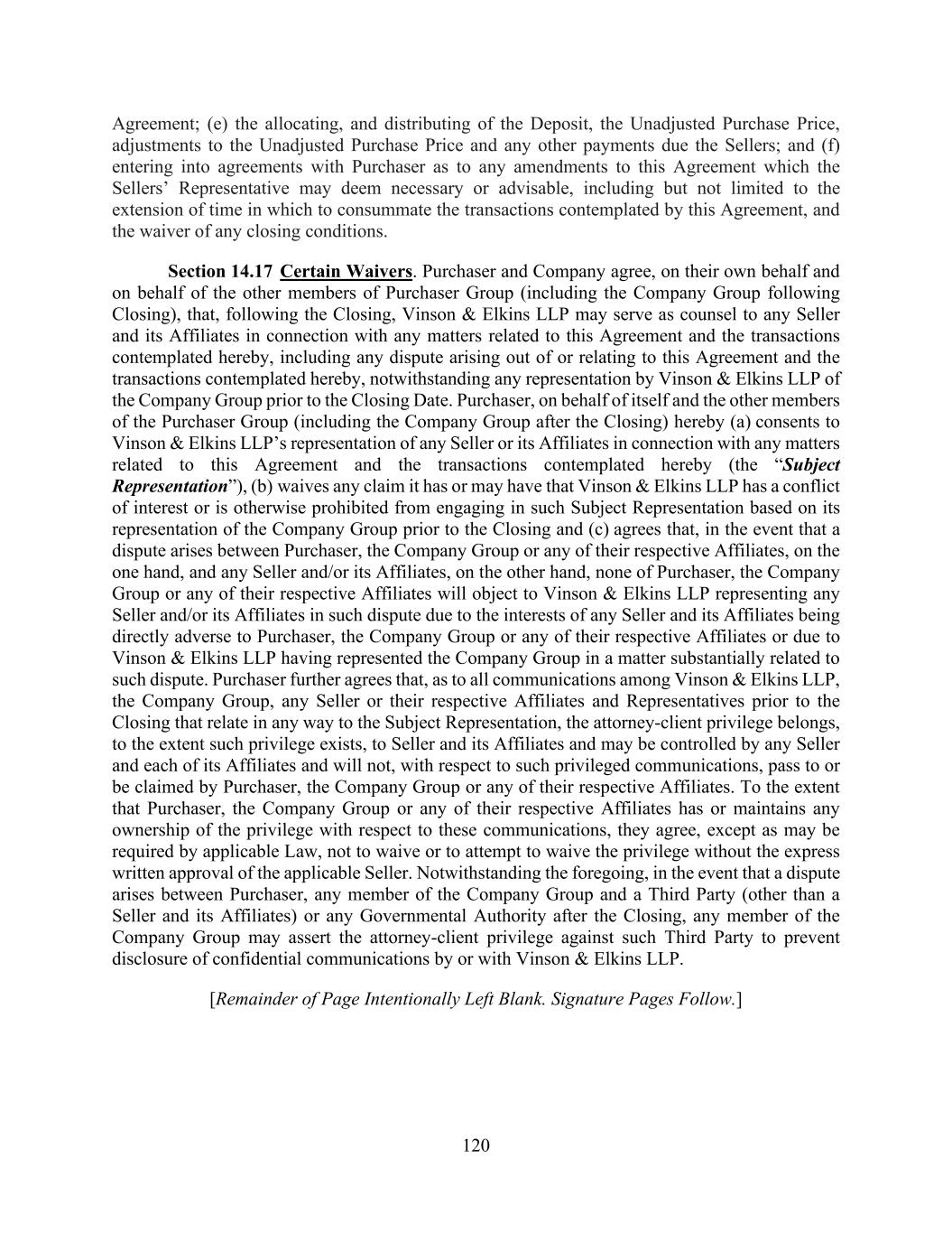 120 Agreement; (e) the allocating, and distributing of the Deposit, the Unadjusted Purchase Price, adjustments to the Unadjusted Purchase Price and any other payments due the Sellers; and (f) entering into agreements with Purchaser as to any amendments to this Agreement which the Sellers’ Representative may deem necessary or advisable, including but not limited to the extension of time in which to consummate the transactions contemplated by this Agreement, and the waiver of any closing conditions. Section 14.17 Certain Waivers. Purchaser and Company agree, on their own behalf and on behalf of the other members of Purchaser Group (including the Company Group following Closing), that, following the Closing, Vinson & Elkins LLP may serve as counsel to any Seller and its Affiliates in connection with any matters related to this Agreement and the transactions contemplated hereby, including any dispute arising out of or relating to this Agreement and the transactions contemplated hereby, notwithstanding any representation by Vinson & Elkins LLP of the Company Group prior to the Closing Date. Purchaser, on behalf of itself and the other members of the Purchaser Group (including the Company Group after the Closing) hereby (a) consents to Vinson & Elkins LLP’s representation of any Seller or its Affiliates in connection with any matters related to this Agreement and the transactions contemplated hereby (the “Subject Representation”), (b) waives any claim it has or may have that Vinson & Elkins LLP has a conflict of interest or is otherwise prohibited from engaging in such Subject Representation based on its representation of the Company Group prior to the Closing and (c) agrees that, in the event that a dispute arises between Purchaser, the Company Group or any of their respective Affiliates, on the one hand, and any Seller and/or its Affiliates, on the other hand, none of Purchaser, the Company Group or any of their respective Affiliates will object to Vinson & Elkins LLP representing any Seller and/or its Affiliates in such dispute due to the interests of any Seller and its Affiliates being directly adverse to Purchaser, the Company Group or any of their respective Affiliates or due to Vinson & Elkins LLP having represented the Company Group in a matter substantially related to such dispute. Purchaser further agrees that, as to all communications among Vinson & Elkins LLP, the Company Group, any Seller or their respective Affiliates and Representatives prior to the Closing that relate in any way to the Subject Representation, the attorney-client privilege belongs, to the extent such privilege exists, to Seller and its Affiliates and may be controlled by any Seller and each of its Affiliates and will not, with respect to such privileged communications, pass to or be claimed by Purchaser, the Company Group or any of their respective Affiliates. To the extent that Purchaser, the Company Group or any of their respective Affiliates has or maintains any ownership of the privilege with respect to these communications, they agree, except as may be required by applicable Law, not to waive or to attempt to waive the privilege without the express written approval of the applicable Seller. Notwithstanding the foregoing, in the event that a dispute arises between Purchaser, any member of the Company Group and a Third Party (other than a Seller and its Affiliates) or any Governmental Authority after the Closing, any member of the Company Group may assert the attorney-client privilege against such Third Party to prevent disclosure of confidential communications by or with Vinson & Elkins LLP. [Remainder of Page Intentionally Left Blank. Signature Pages Follow.]