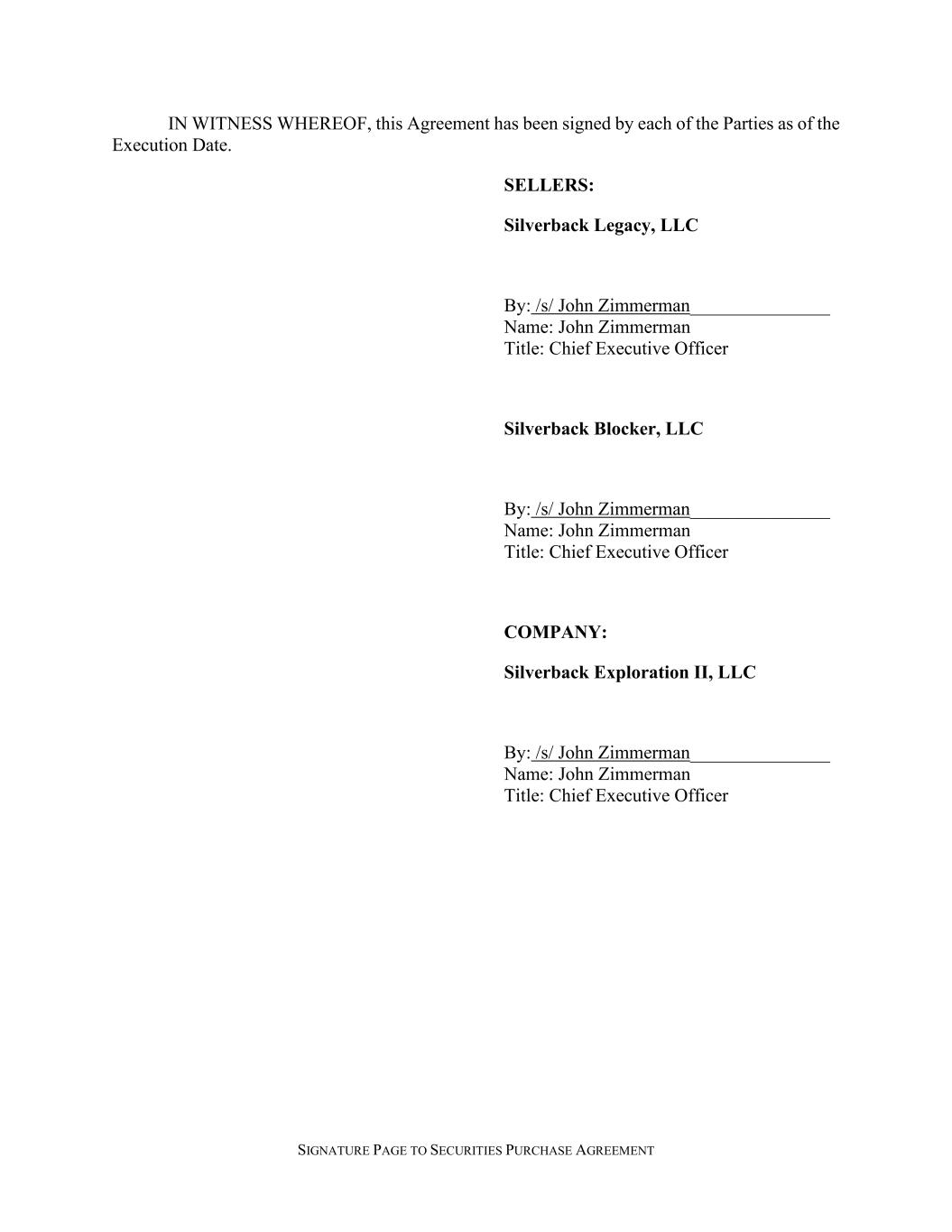 SIGNATURE PAGE TO SECURITIES PURCHASE AGREEMENT IN WITNESS WHEREOF, this Agreement has been signed by each of the Parties as of the Execution Date. SELLERS: Silverback Legacy, LLC By: /s/ John Zimmerman_______________ Name: John Zimmerman Title: Chief Executive Officer Silverback Blocker, LLC By: /s/ John Zimmerman_______________ Name: John Zimmerman Title: Chief Executive Officer COMPANY: Silverback Exploration II, LLC By: /s/ John Zimmerman_______________ Name: John Zimmerman Title: Chief Executive Officer