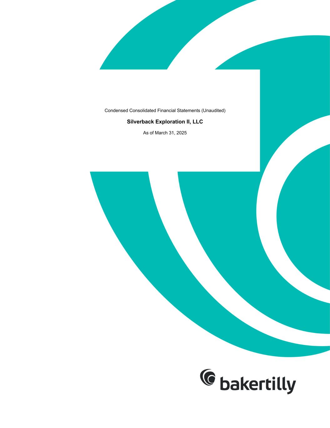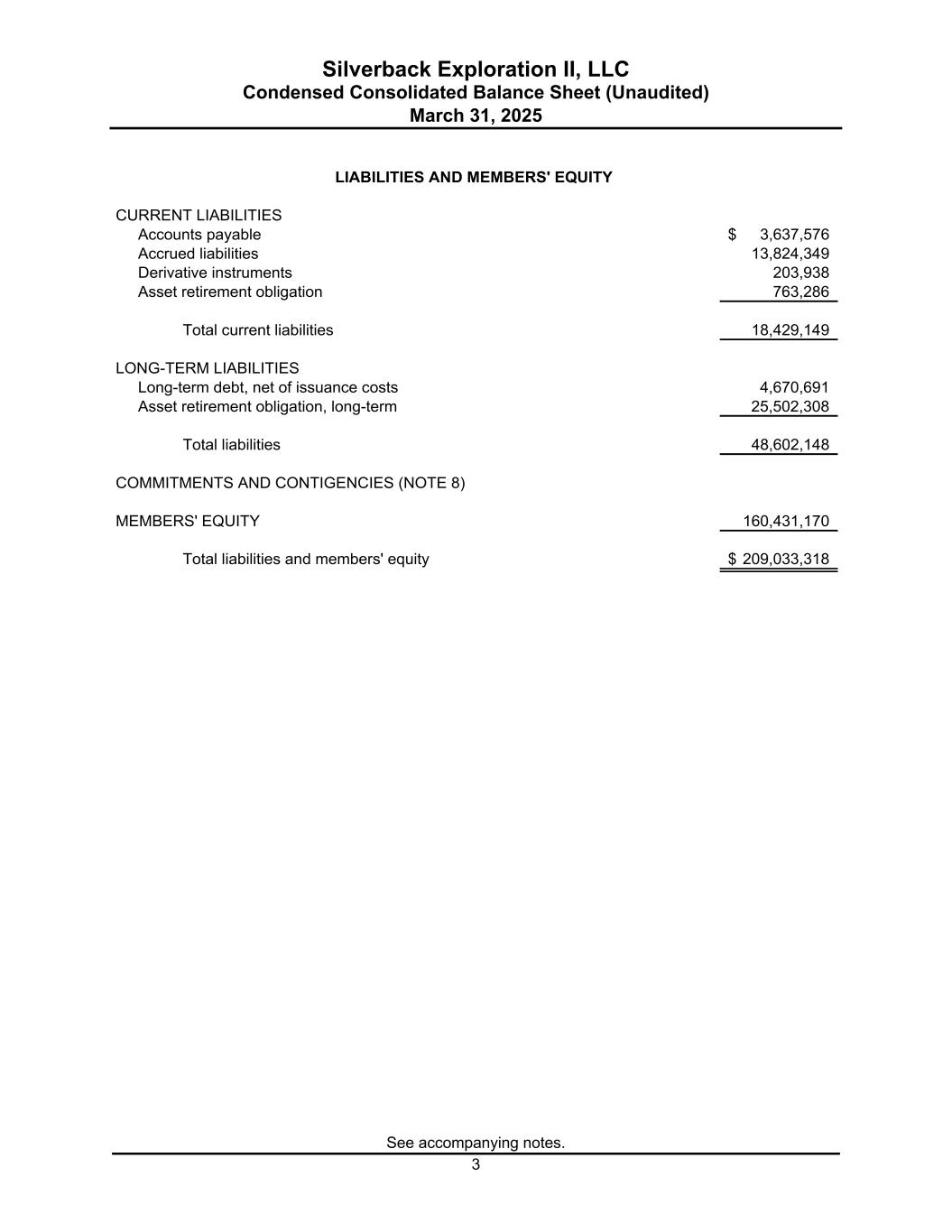 Silverback Exploration II, LLC Condensed Consolidated Balance Sheet (Unaudited) March 31, 2025 See accompanying notes. 3 CURRENT LIABILITIES Accounts payable 3,637,576$ Accrued liabilities 13,824,349 Derivative instruments 203,938 Asset retirement obligation 763,286 Total current liabilities 18,429,149 LONG-TERM LIABILITIES Long-term debt, net of issuance costs 4,670,691 Asset retirement obligation, long-term 25,502,308 Total liabilities 48,602,148 COMMITMENTS AND CONTIGENCIES (NOTE 8) MEMBERS' EQUITY 160,431,170 Total liabilities and members' equity 209,033,318$ LIABILITIES AND MEMBERS' EQUITY