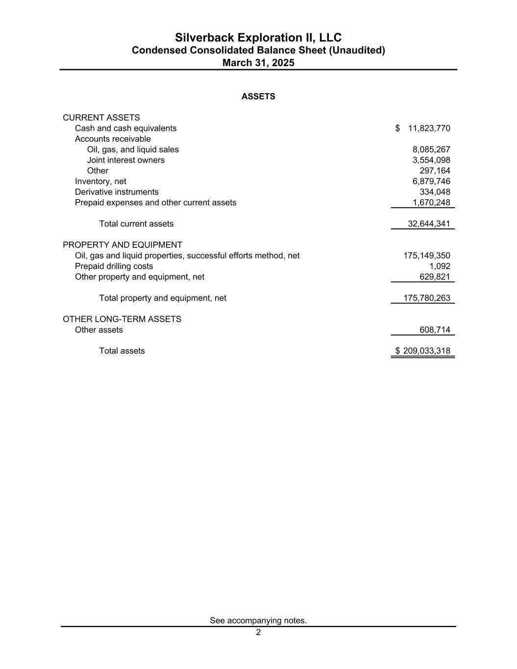 Silverback Exploration II, LLC See accompanying notes. 2 Condensed Consolidated Balance Sheet (Unaudited) March 31, 2025 CURRENT ASSETS Cash and cash equivalents 11,823,770$ Accounts receivable Oil, gas, and liquid sales 8,085,267 Joint interest owners 3,554,098 Other 297,164 Inventory, net 6,879,746 Derivative instruments 334,048 Prepaid expenses and other current assets 1,670,248 Total current assets 32,644,341 PROPERTY AND EQUIPMENT Oil, gas and liquid properties, successful efforts method, net 175,149,350 Prepaid drilling costs 1,092 Other property and equipment, net 629,821 Total property and equipment, net 175,780,263 OTHER LONG-TERM ASSETS Other assets 608,714 Total assets 209,033,318$ ASSETS