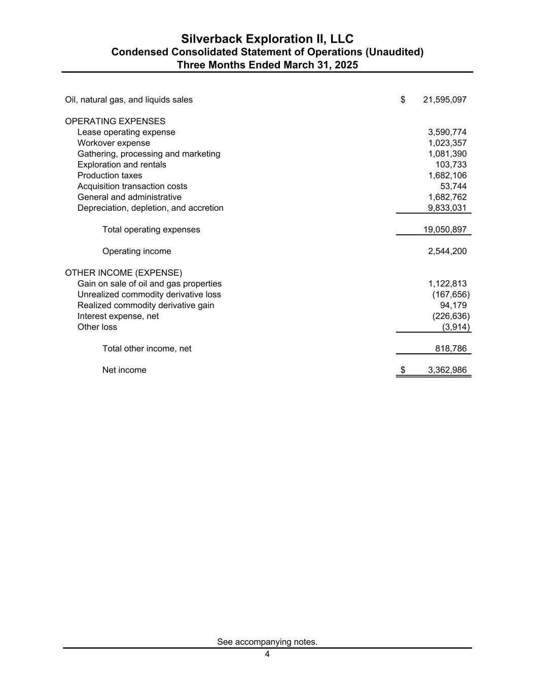 Silverback Exploration II, LLC See accompanying notes. 4 Condensed Consolidated Statement of Operations (Unaudited) Three Months Ended March 31, 2025 Oil, natural gas, and liquids sales 21,595,097$ OPERATING EXPENSES Lease operating expense 3,590,774 Workover expense 1,023,357 Gathering, processing and marketing 1,081,390 Exploration and rentals 103,733 Production taxes 1,682,106 Acquisition transaction costs 53,744 General and administrative 1,682,762 Depreciation, depletion, and accretion 9,833,031 Total operating expenses 19,050,897 Operating income 2,544,200 OTHER INCOME (EXPENSE) Gain on sale of oil and gas properties 1,122,813 Unrealized commodity derivative loss (167,656) Realized commodity derivative gain 94,179 Interest expense, net (226,636) Other loss (3,914) Total other income, net 818,786 Net income 3,362,986$