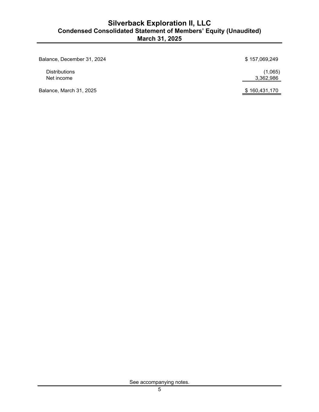 Silverback Exploration II, LLC See accompanying notes. 5 Condensed Consolidated Statement of Members’ Equity (Unaudited) March 31, 2025 Balance, December 31, 2024 $ 157,069,249 Distributions (1,065) Net income 3,362,986 Balance, March 31, 2025 160,431,170$