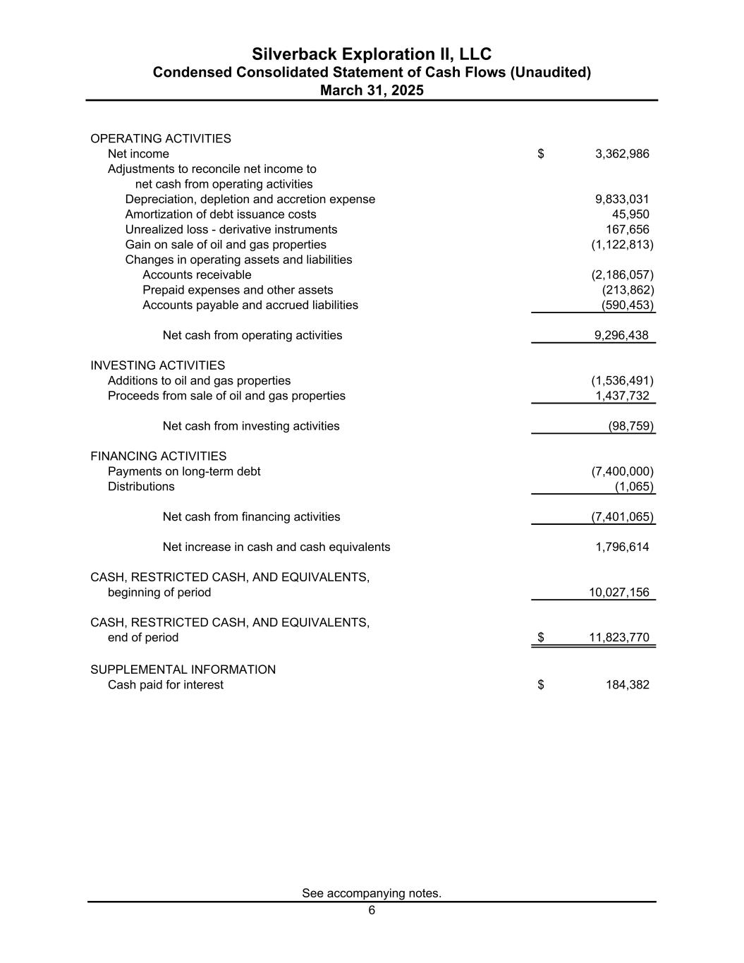 Silverback Exploration II, LLC See accompanying notes. 6 Condensed Consolidated Statement of Cash Flows (Unaudited) March 31, 2025 OPERATING ACTIVITIES Net income 3,362,986$ Adjustments to reconcile net income to net cash from operating activities Depreciation, depletion and accretion expense 9,833,031 Amortization of debt issuance costs 45,950 Unrealized loss - derivative instruments 167,656 Gain on sale of oil and gas properties (1,122,813) Changes in operating assets and liabilities Accounts receivable (2,186,057) Prepaid expenses and other assets (213,862) Accounts payable and accrued liabilities (590,453) Net cash from operating activities 9,296,438 INVESTING ACTIVITIES Additions to oil and gas properties (1,536,491) Proceeds from sale of oil and gas properties 1,437,732 Net cash from investing activities (98,759) FINANCING ACTIVITIES Payments on long-term debt (7,400,000) Distributions (1,065) Net cash from financing activities (7,401,065) Net increase in cash and cash equivalents 1,796,614 CASH, RESTRICTED CASH, AND EQUIVALENTS, beginning of period 10,027,156 CASH, RESTRICTED CASH, AND EQUIVALENTS, end of period 11,823,770$ SUPPLEMENTAL INFORMATION Cash paid for interest 184,382$