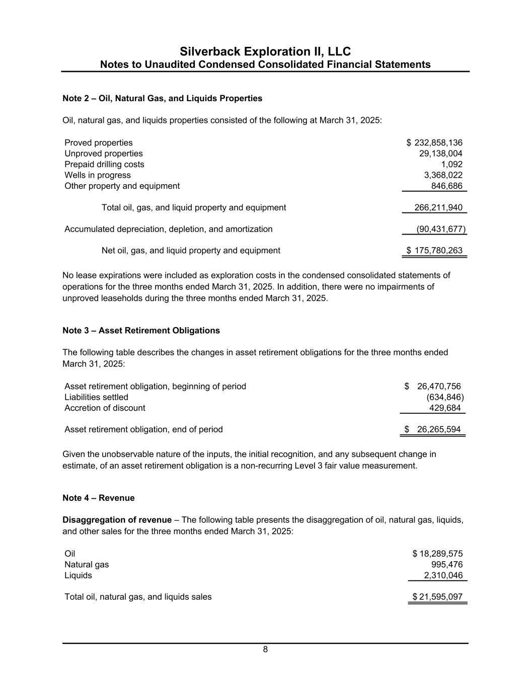 Silverback Exploration II, LLC Notes to Unaudited Condensed Consolidated Financial Statements 8 Note 2 – Oil, Natural Gas, and Liquids Properties Oil, natural gas, and liquids properties consisted of the following at March 31, 2025: Proved properties 232,858,136$ Unproved properties 29,138,004 Prepaid drilling costs 1,092 Wells in progress 3,368,022 Other property and equipment 846,686 Total oil, gas, and liquid property and equipment 266,211,940 Accumulated depreciation, depletion, and amortization (90,431,677) Net oil, gas, and liquid property and equipment 175,780,263$ No lease expirations were included as exploration costs in the condensed consolidated statements of operations for the three months ended March 31, 2025. In addition, there were no impairments of unproved leaseholds during the three months ended March 31, 2025. Note 3 – Asset Retirement Obligations The following table describes the changes in asset retirement obligations for the three months ended March 31, 2025: Asset retirement obligation, beginning of period 26,470,756$ Liabilities settled (634,846) Accretion of discount 429,684 Asset retirement obligation, end of period 26,265,594$ Given the unobservable nature of the inputs, the initial recognition, and any subsequent change in estimate, of an asset retirement obligation is a non-recurring Level 3 fair value measurement. Note 4 – Revenue Disaggregation of revenue – The following table presents the disaggregation of oil, natural gas, liquids, and other sales for the three months ended March 31, 2025: Oil 18,289,575$ Natural gas 995,476 Liquids 2,310,046 Total oil, natural gas, and liquids sales 21,595,097$