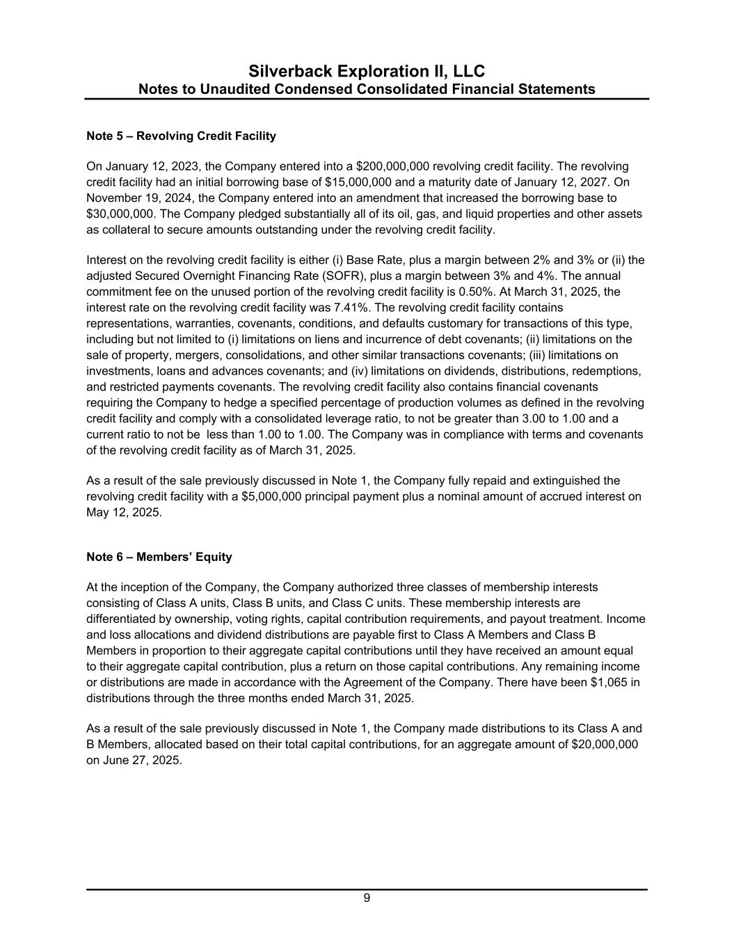 Silverback Exploration II, LLC Notes to Unaudited Condensed Consolidated Financial Statements 9 Note 5 – Revolving Credit Facility On January 12, 2023, the Company entered into a $200,000,000 revolving credit facility. The revolving credit facility had an initial borrowing base of $15,000,000 and a maturity date of January 12, 2027. On November 19, 2024, the Company entered into an amendment that increased the borrowing base to $30,000,000. The Company pledged substantially all of its oil, gas, and liquid properties and other assets as collateral to secure amounts outstanding under the revolving credit facility. Interest on the revolving credit facility is either (i) Base Rate, plus a margin between 2% and 3% or (ii) the adjusted Secured Overnight Financing Rate (SOFR), plus a margin between 3% and 4%. The annual commitment fee on the unused portion of the revolving credit facility is 0.50%. At March 31, 2025, the interest rate on the revolving credit facility was 7.41%. The revolving credit facility contains representations, warranties, covenants, conditions, and defaults customary for transactions of this type, including but not limited to (i) limitations on liens and incurrence of debt covenants; (ii) limitations on the sale of property, mergers, consolidations, and other similar transactions covenants; (iii) limitations on investments, loans and advances covenants; and (iv) limitations on dividends, distributions, redemptions, and restricted payments covenants. The revolving credit facility also contains financial covenants requiring the Company to hedge a specified percentage of production volumes as defined in the revolving credit facility and comply with a consolidated leverage ratio, to not be greater than 3.00 to 1.00 and a current ratio to not be less than 1.00 to 1.00. The Company was in compliance with terms and covenants of the revolving credit facility as of March 31, 2025. As a result of the sale previously discussed in Note 1, the Company fully repaid and extinguished the revolving credit facility with a $5,000,000 principal payment plus a nominal amount of accrued interest on May 12, 2025. Note 6 – Members’ Equity At the inception of the Company, the Company authorized three classes of membership interests consisting of Class A units, Class B units, and Class C units. These membership interests are differentiated by ownership, voting rights, capital contribution requirements, and payout treatment. Income and loss allocations and dividend distributions are payable first to Class A Members and Class B Members in proportion to their aggregate capital contributions until they have received an amount equal to their aggregate capital contribution, plus a return on those capital contributions. Any remaining income or distributions are made in accordance with the Agreement of the Company. There have been $1,065 in distributions through the three months ended March 31, 2025. As a result of the sale previously discussed in Note 1, the Company made distributions to its Class A and B Members, allocated based on their total capital contributions, for an aggregate amount of $20,000,000 on June 27, 2025.