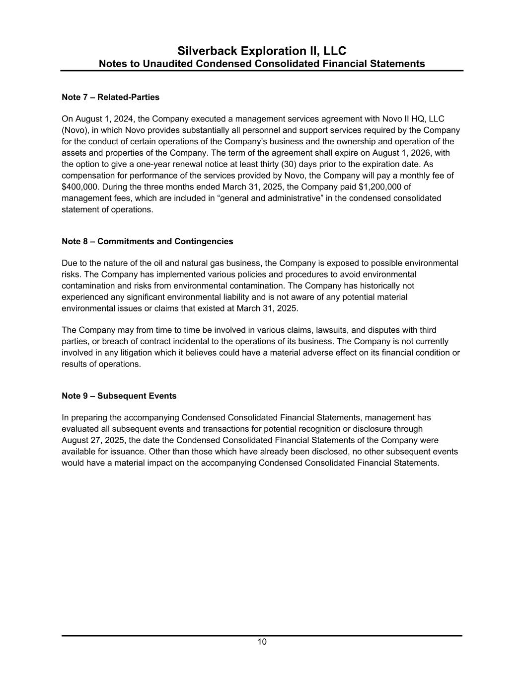 Silverback Exploration II, LLC Notes to Unaudited Condensed Consolidated Financial Statements 10 Note 7 – Related-Parties On August 1, 2024, the Company executed a management services agreement with Novo II HQ, LLC (Novo), in which Novo provides substantially all personnel and support services required by the Company for the conduct of certain operations of the Company’s business and the ownership and operation of the assets and properties of the Company. The term of the agreement shall expire on August 1, 2026, with the option to give a one-year renewal notice at least thirty (30) days prior to the expiration date. As compensation for performance of the services provided by Novo, the Company will pay a monthly fee of $400,000. During the three months ended March 31, 2025, the Company paid $1,200,000 of management fees, which are included in “general and administrative” in the condensed consolidated statement of operations. Note 8 – Commitments and Contingencies Due to the nature of the oil and natural gas business, the Company is exposed to possible environmental risks. The Company has implemented various policies and procedures to avoid environmental contamination and risks from environmental contamination. The Company has historically not experienced any significant environmental liability and is not aware of any potential material environmental issues or claims that existed at March 31, 2025. The Company may from time to time be involved in various claims, lawsuits, and disputes with third parties, or breach of contract incidental to the operations of its business. The Company is not currently involved in any litigation which it believes could have a material adverse effect on its financial condition or results of operations. Note 9 – Subsequent Events In preparing the accompanying Condensed Consolidated Financial Statements, management has evaluated all subsequent events and transactions for potential recognition or disclosure through August 27, 2025, the date the Condensed Consolidated Financial Statements of the Company were available for issuance. Other than those which have already been disclosed, no other subsequent events would have a material impact on the accompanying Condensed Consolidated Financial Statements.