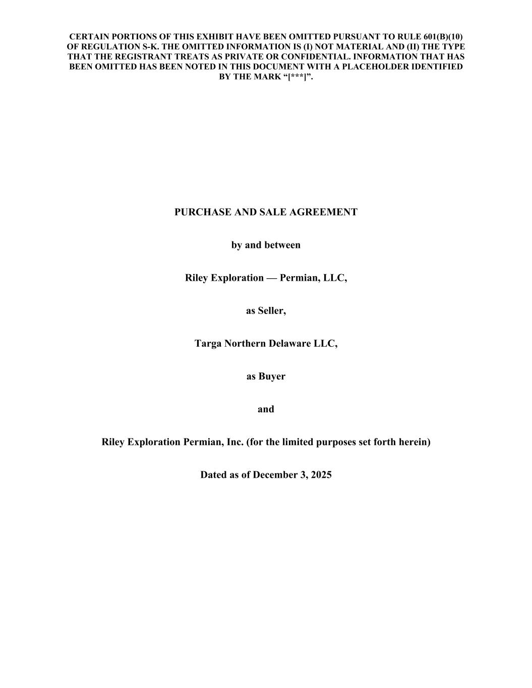 CERTAIN PORTIONS OF THIS EXHIBIT HAVE BEEN OMITTED PURSUANT TO RULE 601(B)(10) OF REGULATION S-K. THE OMITTED INFORMATION IS (I) NOT MATERIAL AND (II) THE TYPE THAT THE REGISTRANT TREATS AS PRIVATE OR CONFIDENTIAL. INFORMATION THAT HAS BEEN OMITTED HAS BEEN NOTED IN THIS DOCUMENT WITH A PLACEHOLDER IDENTIFIED BY THE MARK “[***]”. PURCHASE AND SALE AGREEMENT by and between Riley Exploration — Permian, LLC, as Seller, Targa Northern Delaware LLC, as Buyer and Riley Exploration Permian, Inc. (for the limited purposes set forth herein) Dated as of December 3, 2025