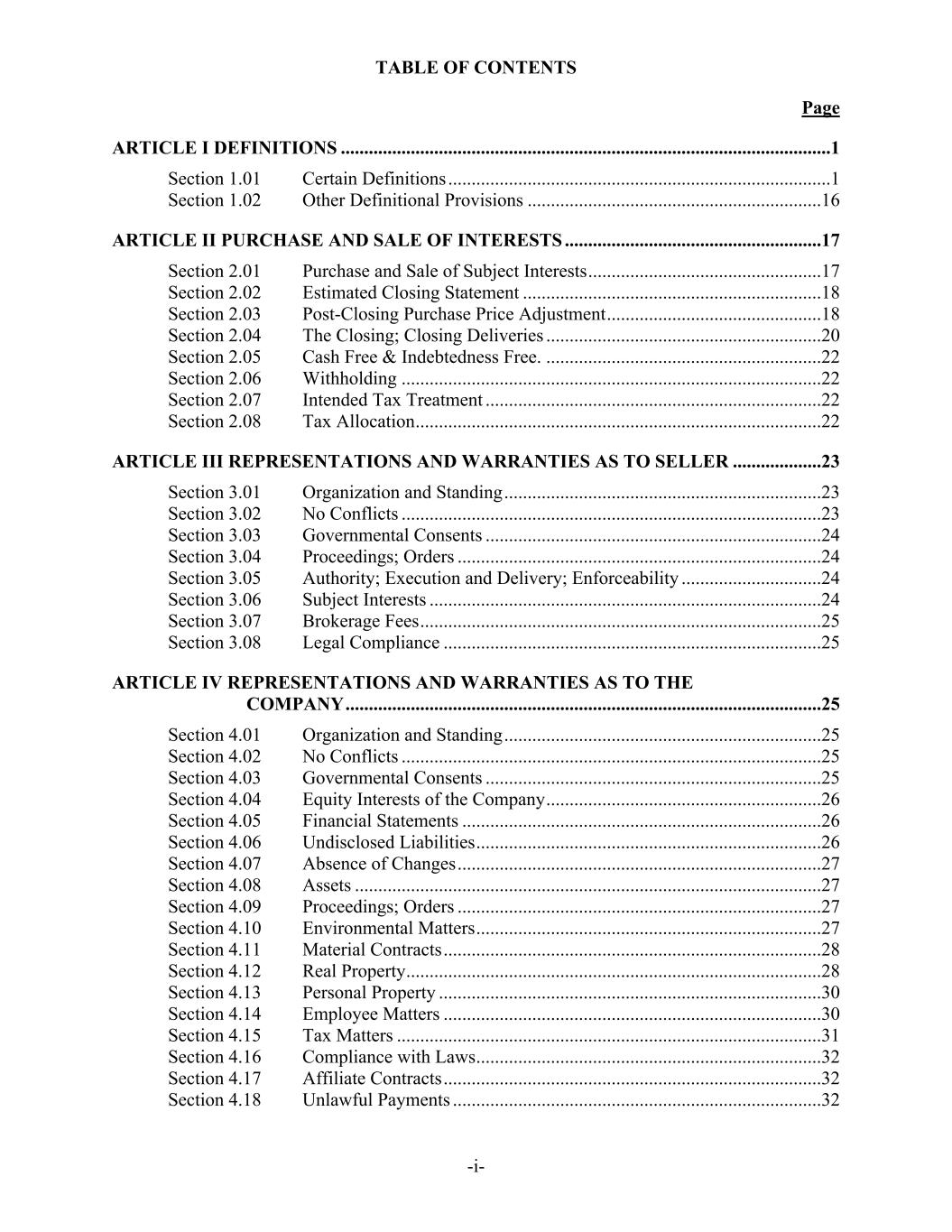 TABLE OF CONTENTS Page -i- ARTICLE I DEFINITIONS .........................................................................................................1 Section 1.01 Certain Definitions ..................................................................................1 Section 1.02 Other Definitional Provisions ...............................................................16 ARTICLE II PURCHASE AND SALE OF INTERESTS .......................................................17 Section 2.01 Purchase and Sale of Subject Interests..................................................17 Section 2.02 Estimated Closing Statement ................................................................18 Section 2.03 Post-Closing Purchase Price Adjustment..............................................18 Section 2.04 The Closing; Closing Deliveries ...........................................................20 Section 2.05 Cash Free & Indebtedness Free. ...........................................................22 Section 2.06 Withholding ..........................................................................................22 Section 2.07 Intended Tax Treatment ........................................................................22 Section 2.08 Tax Allocation.......................................................................................22 ARTICLE III REPRESENTATIONS AND WARRANTIES AS TO SELLER ...................23 Section 3.01 Organization and Standing....................................................................23 Section 3.02 No Conflicts ..........................................................................................23 Section 3.03 Governmental Consents ........................................................................24 Section 3.04 Proceedings; Orders ..............................................................................24 Section 3.05 Authority; Execution and Delivery; Enforceability ..............................24 Section 3.06 Subject Interests ....................................................................................24 Section 3.07 Brokerage Fees......................................................................................25 Section 3.08 Legal Compliance .................................................................................25 ARTICLE IV REPRESENTATIONS AND WARRANTIES AS TO THE COMPANY......................................................................................................25 Section 4.01 Organization and Standing....................................................................25 Section 4.02 No Conflicts ..........................................................................................25 Section 4.03 Governmental Consents ........................................................................25 Section 4.04 Equity Interests of the Company...........................................................26 Section 4.05 Financial Statements .............................................................................26 Section 4.06 Undisclosed Liabilities..........................................................................26 Section 4.07 Absence of Changes..............................................................................27 Section 4.08 Assets ....................................................................................................27 Section 4.09 Proceedings; Orders ..............................................................................27 Section 4.10 Environmental Matters..........................................................................27 Section 4.11 Material Contracts.................................................................................28 Section 4.12 Real Property.........................................................................................28 Section 4.13 Personal Property ..................................................................................30 Section 4.14 Employee Matters .................................................................................30 Section 4.15 Tax Matters ...........................................................................................31 Section 4.16 Compliance with Laws..........................................................................32 Section 4.17 Affiliate Contracts.................................................................................32 Section 4.18 Unlawful Payments ...............................................................................32