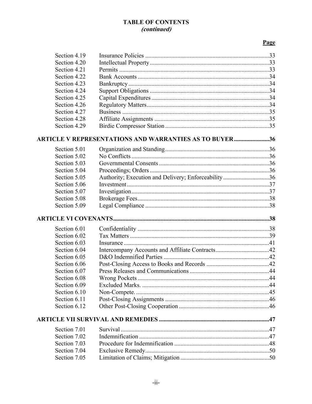 TABLE OF CONTENTS (continued) Page -ii- Section 4.19 Insurance Policies .................................................................................33 Section 4.20 Intellectual Property ..............................................................................33 Section 4.21 Permits ..................................................................................................33 Section 4.22 Bank Accounts ......................................................................................34 Section 4.23 Bankruptcy ............................................................................................34 Section 4.24 Support Obligations ..............................................................................34 Section 4.25 Capital Expenditures .............................................................................34 Section 4.26 Regulatory Matters................................................................................34 Section 4.27 Business ................................................................................................35 Section 4.28 Affiliate Assignments ...........................................................................35 Section 4.29 Birdie Compressor Station ....................................................................35 ARTICLE V REPRESENTATIONS AND WARRANTIES AS TO BUYER.......................36 Section 5.01 Organization and Standing....................................................................36 Section 5.02 No Conflicts ..........................................................................................36 Section 5.03 Governmental Consents ........................................................................36 Section 5.04 Proceedings; Orders ..............................................................................36 Section 5.05 Authority; Execution and Delivery; Enforceability ..............................36 Section 5.06 Investment .............................................................................................37 Section 5.07 Investigation..........................................................................................37 Section 5.08 Brokerage Fees......................................................................................38 Section 5.09 Legal Compliance .................................................................................38 ARTICLE VI COVENANTS......................................................................................................38 Section 6.01 Confidentiality ......................................................................................38 Section 6.02 Tax Matters ...........................................................................................39 Section 6.03 Insurance ...............................................................................................41 Section 6.04 Intercompany Accounts and Affiliate Contracts...................................42 Section 6.05 D&O Indemnified Parties .....................................................................42 Section 6.06 Post-Closing Access to Books and Records .........................................42 Section 6.07 Press Releases and Communications ....................................................44 Section 6.08 Wrong Pockets ......................................................................................44 Section 6.09 Excluded Marks. ...................................................................................44 Section 6.10 Non-Compete. .......................................................................................45 Section 6.11 Post-Closing Assignments ....................................................................46 Section 6.12 Other Post-Closing Cooperation ...........................................................46 ARTICLE VII SURVIVAL AND REMEDIES ........................................................................47 Section 7.01 Survival .................................................................................................47 Section 7.02 Indemnification .....................................................................................47 Section 7.03 Procedure for Indemnification ..............................................................48 Section 7.04 Exclusive Remedy.................................................................................50 Section 7.05 Limitation of Claims; Mitigation ..........................................................50