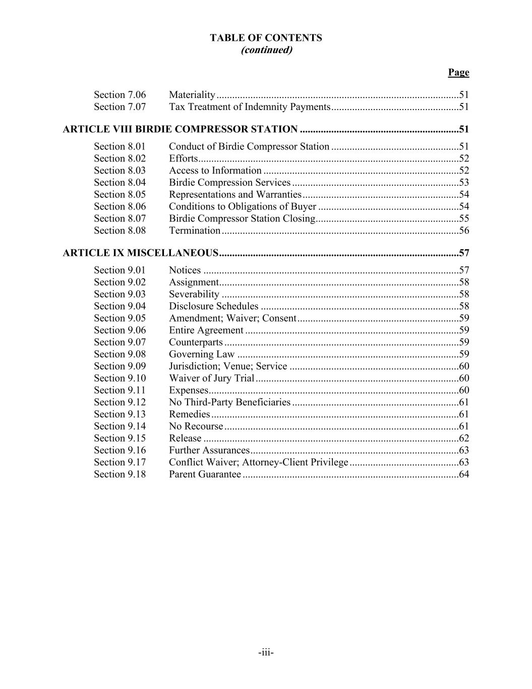TABLE OF CONTENTS (continued) Page -iii- Section 7.06 Materiality .............................................................................................51 Section 7.07 Tax Treatment of Indemnity Payments.................................................51 ARTICLE VIII BIRDIE COMPRESSOR STATION .............................................................51 Section 8.01 Conduct of Birdie Compressor Station .................................................51 Section 8.02 Efforts....................................................................................................52 Section 8.03 Access to Information ...........................................................................52 Section 8.04 Birdie Compression Services ................................................................53 Section 8.05 Representations and Warranties............................................................54 Section 8.06 Conditions to Obligations of Buyer ......................................................54 Section 8.07 Birdie Compressor Station Closing.......................................................55 Section 8.08 Termination ...........................................................................................56 ARTICLE IX MISCELLANEOUS............................................................................................57 Section 9.01 Notices ..................................................................................................57 Section 9.02 Assignment............................................................................................58 Section 9.03 Severability ...........................................................................................58 Section 9.04 Disclosure Schedules ............................................................................58 Section 9.05 Amendment; Waiver; Consent..............................................................59 Section 9.06 Entire Agreement ..................................................................................59 Section 9.07 Counterparts ..........................................................................................59 Section 9.08 Governing Law .....................................................................................59 Section 9.09 Jurisdiction; Venue; Service .................................................................60 Section 9.10 Waiver of Jury Trial ..............................................................................60 Section 9.11 Expenses................................................................................................60 Section 9.12 No Third-Party Beneficiaries ................................................................61 Section 9.13 Remedies ...............................................................................................61 Section 9.14 No Recourse ..........................................................................................61 Section 9.15 Release ..................................................................................................62 Section 9.16 Further Assurances................................................................................63 Section 9.17 Conflict Waiver; Attorney-Client Privilege ..........................................63 Section 9.18 Parent Guarantee ...................................................................................64