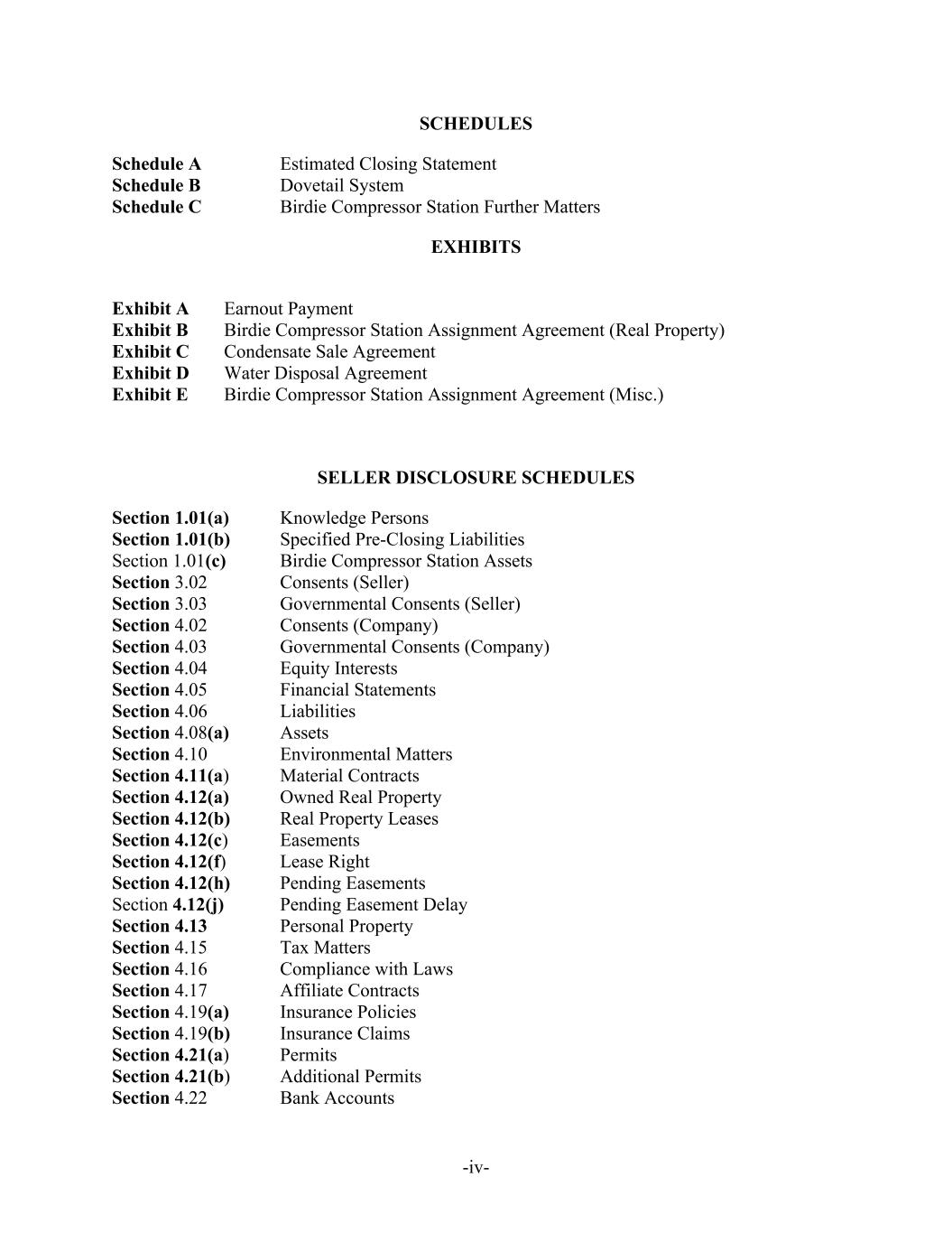 -iv- SCHEDULES Schedule A Estimated Closing Statement Schedule B Dovetail System Schedule C Birdie Compressor Station Further Matters EXHIBITS Exhibit A Earnout Payment Exhibit B Birdie Compressor Station Assignment Agreement (Real Property) Exhibit C Condensate Sale Agreement Exhibit D Water Disposal Agreement Exhibit E Birdie Compressor Station Assignment Agreement (Misc.) SELLER DISCLOSURE SCHEDULES Section 1.01(a) Knowledge Persons Section 1.01(b) Specified Pre-Closing Liabilities Section 1.01(c) Birdie Compressor Station Assets Section 3.02 Consents (Seller) Section 3.03 Governmental Consents (Seller) Section 4.02 Consents (Company) Section 4.03 Governmental Consents (Company) Section 4.04 Equity Interests Section 4.05 Financial Statements Section 4.06 Liabilities Section 4.08(a) Assets Section 4.10 Environmental Matters Section 4.11(a) Material Contracts Section 4.12(a) Owned Real Property Section 4.12(b) Real Property Leases Section 4.12(c) Easements Section 4.12(f) Lease Right Section 4.12(h) Pending Easements Section 4.12(j) Pending Easement Delay Section 4.13 Personal Property Section 4.15 Tax Matters Section 4.16 Compliance with Laws Section 4.17 Affiliate Contracts Section 4.19(a) Insurance Policies Section 4.19(b) Insurance Claims Section 4.21(a) Permits Section 4.21(b) Additional Permits Section 4.22 Bank Accounts
