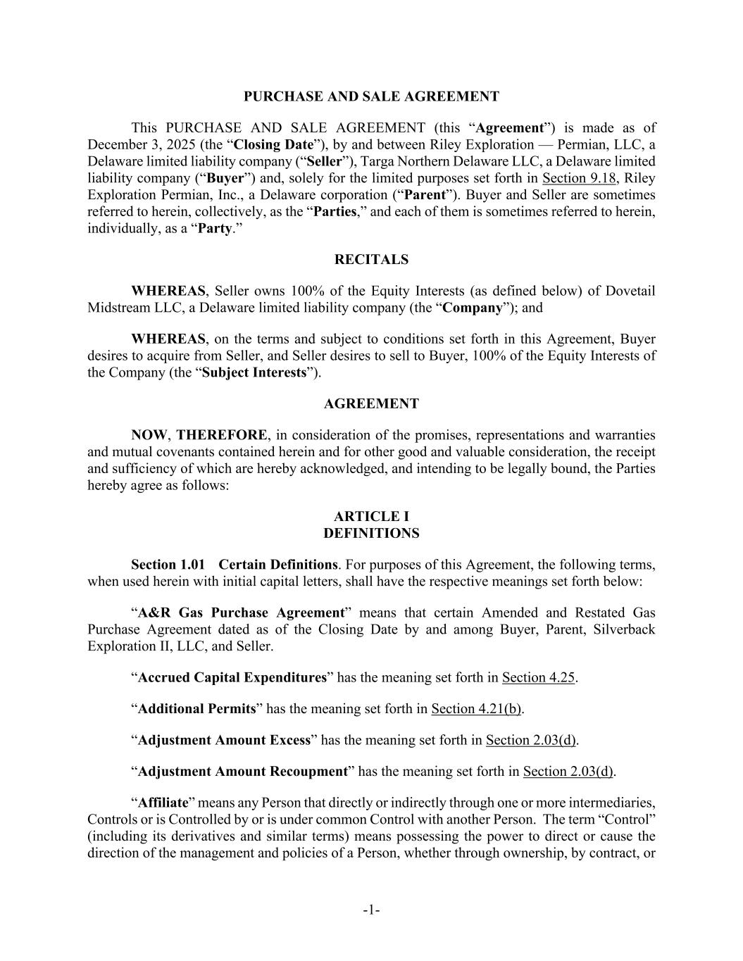 -1- PURCHASE AND SALE AGREEMENT This PURCHASE AND SALE AGREEMENT (this “Agreement”) is made as of December 3, 2025 (the “Closing Date”), by and between Riley Exploration — Permian, LLC, a Delaware limited liability company (“Seller”), Targa Northern Delaware LLC, a Delaware limited liability company (“Buyer”) and, solely for the limited purposes set forth in Section 9.18, Riley Exploration Permian, Inc., a Delaware corporation (“Parent”). Buyer and Seller are sometimes referred to herein, collectively, as the “Parties,” and each of them is sometimes referred to herein, individually, as a “Party.” RECITALS WHEREAS, Seller owns 100% of the Equity Interests (as defined below) of Dovetail Midstream LLC, a Delaware limited liability company (the “Company”); and WHEREAS, on the terms and subject to conditions set forth in this Agreement, Buyer desires to acquire from Seller, and Seller desires to sell to Buyer, 100% of the Equity Interests of the Company (the “Subject Interests”). AGREEMENT NOW, THEREFORE, in consideration of the promises, representations and warranties and mutual covenants contained herein and for other good and valuable consideration, the receipt and sufficiency of which are hereby acknowledged, and intending to be legally bound, the Parties hereby agree as follows: ARTICLE I DEFINITIONS Section 1.01 Certain Definitions. For purposes of this Agreement, the following terms, when used herein with initial capital letters, shall have the respective meanings set forth below: “A&R Gas Purchase Agreement” means that certain Amended and Restated Gas Purchase Agreement dated as of the Closing Date by and among Buyer, Parent, Silverback Exploration II, LLC, and Seller. “Accrued Capital Expenditures” has the meaning set forth in Section 4.25. “Additional Permits” has the meaning set forth in Section 4.21(b). “Adjustment Amount Excess” has the meaning set forth in Section 2.03(d). “Adjustment Amount Recoupment” has the meaning set forth in Section 2.03(d). “Affiliate” means any Person that directly or indirectly through one or more intermediaries, Controls or is Controlled by or is under common Control with another Person. The term “Control” (including its derivatives and similar terms) means possessing the power to direct or cause the direction of the management and policies of a Person, whether through ownership, by contract, or
