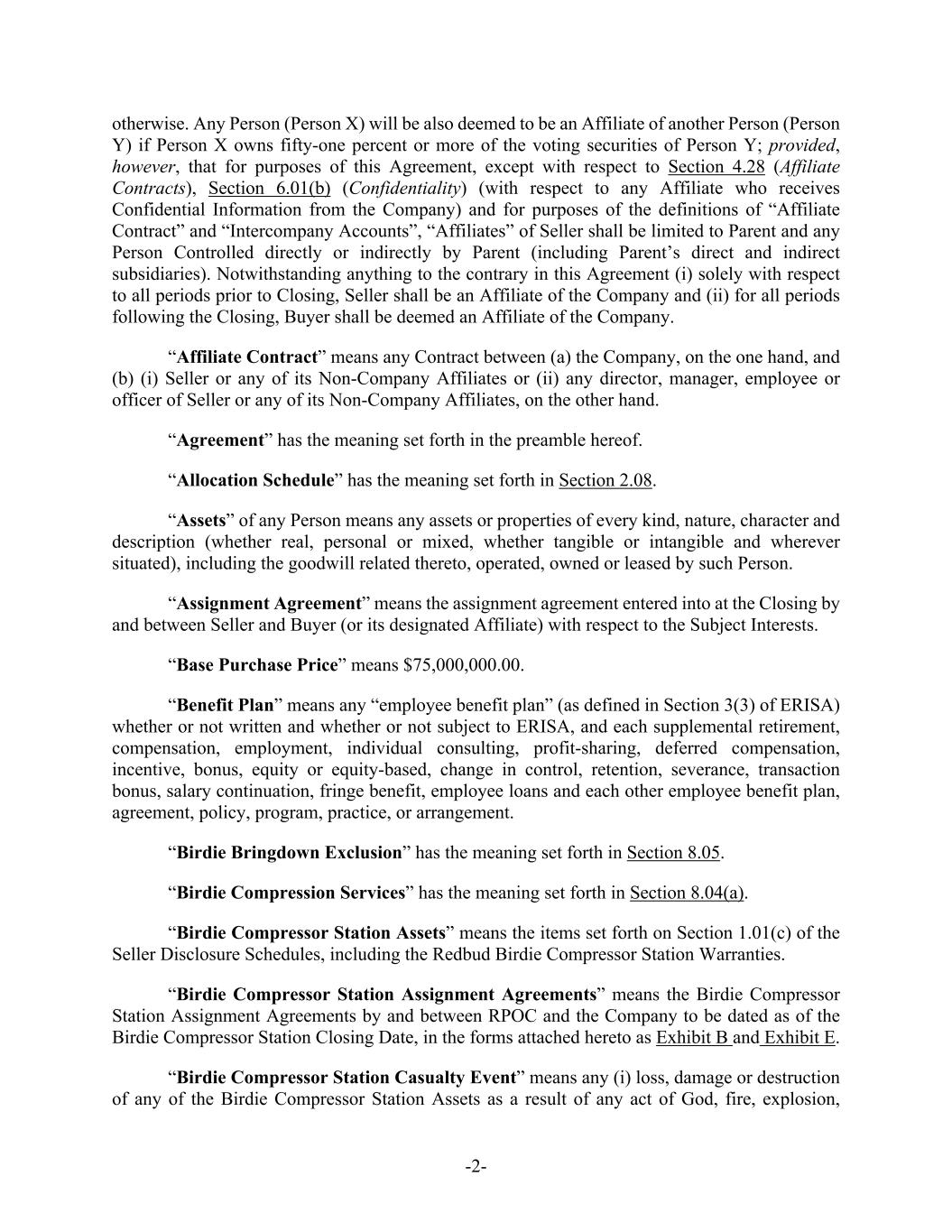 -2- otherwise. Any Person (Person X) will be also deemed to be an Affiliate of another Person (Person Y) if Person X owns fifty-one percent or more of the voting securities of Person Y; provided, however, that for purposes of this Agreement, except with respect to Section 4.28 (Affiliate Contracts), Section 6.01(b) (Confidentiality) (with respect to any Affiliate who receives Confidential Information from the Company) and for purposes of the definitions of “Affiliate Contract” and “Intercompany Accounts”, “Affiliates” of Seller shall be limited to Parent and any Person Controlled directly or indirectly by Parent (including Parent’s direct and indirect subsidiaries). Notwithstanding anything to the contrary in this Agreement (i) solely with respect to all periods prior to Closing, Seller shall be an Affiliate of the Company and (ii) for all periods following the Closing, Buyer shall be deemed an Affiliate of the Company. “Affiliate Contract” means any Contract between (a) the Company, on the one hand, and (b) (i) Seller or any of its Non-Company Affiliates or (ii) any director, manager, employee or officer of Seller or any of its Non-Company Affiliates, on the other hand. “Agreement” has the meaning set forth in the preamble hereof. “Allocation Schedule” has the meaning set forth in Section 2.08. “Assets” of any Person means any assets or properties of every kind, nature, character and description (whether real, personal or mixed, whether tangible or intangible and wherever situated), including the goodwill related thereto, operated, owned or leased by such Person. “Assignment Agreement” means the assignment agreement entered into at the Closing by and between Seller and Buyer (or its designated Affiliate) with respect to the Subject Interests. “Base Purchase Price” means $75,000,000.00. “Benefit Plan” means any “employee benefit plan” (as defined in Section 3(3) of ERISA) whether or not written and whether or not subject to ERISA, and each supplemental retirement, compensation, employment, individual consulting, profit-sharing, deferred compensation, incentive, bonus, equity or equity-based, change in control, retention, severance, transaction bonus, salary continuation, fringe benefit, employee loans and each other employee benefit plan, agreement, policy, program, practice, or arrangement. “Birdie Bringdown Exclusion” has the meaning set forth in Section 8.05. “Birdie Compression Services” has the meaning set forth in Section 8.04(a). “Birdie Compressor Station Assets” means the items set forth on Section 1.01(c) of the Seller Disclosure Schedules, including the Redbud Birdie Compressor Station Warranties. “Birdie Compressor Station Assignment Agreements” means the Birdie Compressor Station Assignment Agreements by and between RPOC and the Company to be dated as of the Birdie Compressor Station Closing Date, in the forms attached hereto as Exhibit B and Exhibit E. “Birdie Compressor Station Casualty Event” means any (i) loss, damage or destruction of any of the Birdie Compressor Station Assets as a result of any act of God, fire, explosion,