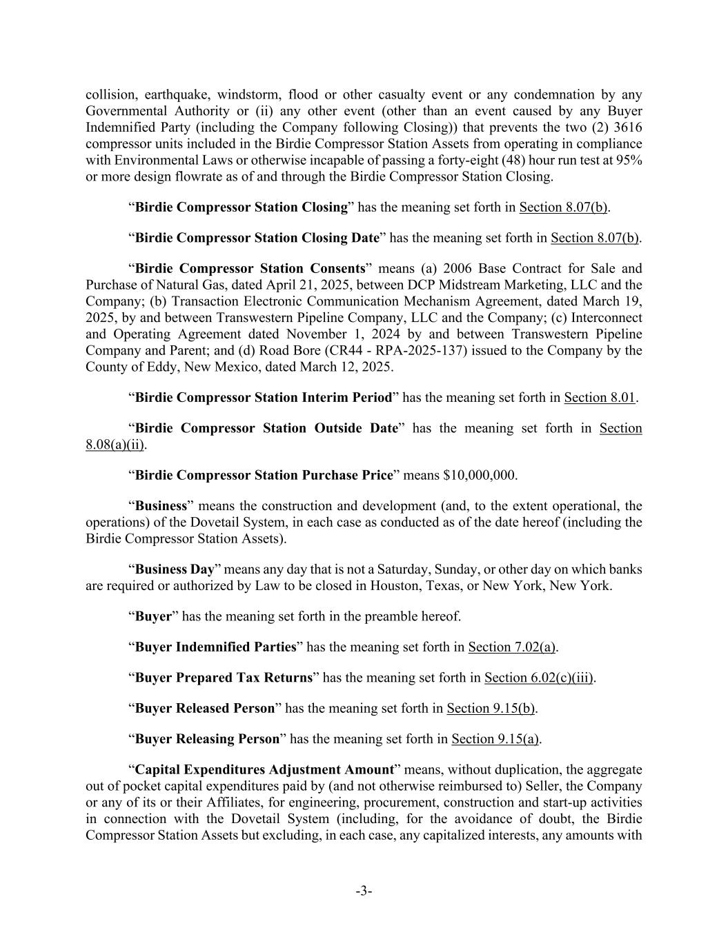-3- collision, earthquake, windstorm, flood or other casualty event or any condemnation by any Governmental Authority or (ii) any other event (other than an event caused by any Buyer Indemnified Party (including the Company following Closing)) that prevents the two (2) 3616 compressor units included in the Birdie Compressor Station Assets from operating in compliance with Environmental Laws or otherwise incapable of passing a forty-eight (48) hour run test at 95% or more design flowrate as of and through the Birdie Compressor Station Closing. “Birdie Compressor Station Closing” has the meaning set forth in Section 8.07(b). “Birdie Compressor Station Closing Date” has the meaning set forth in Section 8.07(b). “Birdie Compressor Station Consents” means (a) 2006 Base Contract for Sale and Purchase of Natural Gas, dated April 21, 2025, between DCP Midstream Marketing, LLC and the Company; (b) Transaction Electronic Communication Mechanism Agreement, dated March 19, 2025, by and between Transwestern Pipeline Company, LLC and the Company; (c) Interconnect and Operating Agreement dated November 1, 2024 by and between Transwestern Pipeline Company and Parent; and (d) Road Bore (CR44 - RPA-2025-137) issued to the Company by the County of Eddy, New Mexico, dated March 12, 2025. “Birdie Compressor Station Interim Period” has the meaning set forth in Section 8.01. “Birdie Compressor Station Outside Date” has the meaning set forth in Section 8.08(a)(ii). “Birdie Compressor Station Purchase Price” means $10,000,000. “Business” means the construction and development (and, to the extent operational, the operations) of the Dovetail System, in each case as conducted as of the date hereof (including the Birdie Compressor Station Assets). “Business Day” means any day that is not a Saturday, Sunday, or other day on which banks are required or authorized by Law to be closed in Houston, Texas, or New York, New York. “Buyer” has the meaning set forth in the preamble hereof. “Buyer Indemnified Parties” has the meaning set forth in Section 7.02(a). “Buyer Prepared Tax Returns” has the meaning set forth in Section 6.02(c)(iii). “Buyer Released Person” has the meaning set forth in Section 9.15(b). “Buyer Releasing Person” has the meaning set forth in Section 9.15(a). “Capital Expenditures Adjustment Amount” means, without duplication, the aggregate out of pocket capital expenditures paid by (and not otherwise reimbursed to) Seller, the Company or any of its or their Affiliates, for engineering, procurement, construction and start-up activities in connection with the Dovetail System (including, for the avoidance of doubt, the Birdie Compressor Station Assets but excluding, in each case, any capitalized interests, any amounts with