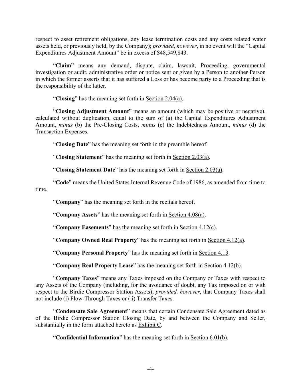 -4- respect to asset retirement obligations, any lease termination costs and any costs related water assets held, or previously held, by the Company); provided, however, in no event will the “Capital Expenditures Adjustment Amount” be in excess of $48,549,843. “Claim” means any demand, dispute, claim, lawsuit, Proceeding, governmental investigation or audit, administrative order or notice sent or given by a Person to another Person in which the former asserts that it has suffered a Loss or has become party to a Proceeding that is the responsibility of the latter. “Closing” has the meaning set forth in Section 2.04(a). “Closing Adjustment Amount” means an amount (which may be positive or negative), calculated without duplication, equal to the sum of (a) the Capital Expenditures Adjustment Amount, minus (b) the Pre-Closing Costs, minus (c) the Indebtedness Amount, minus (d) the Transaction Expenses. “Closing Date” has the meaning set forth in the preamble hereof. “Closing Statement” has the meaning set forth in Section 2.03(a). “Closing Statement Date” has the meaning set forth in Section 2.03(a). “Code” means the United States Internal Revenue Code of 1986, as amended from time to time. “Company” has the meaning set forth in the recitals hereof. “Company Assets” has the meaning set forth in Section 4.08(a). “Company Easements” has the meaning set forth in Section 4.12(c). “Company Owned Real Property” has the meaning set forth in Section 4.12(a). “Company Personal Property” has the meaning set forth in Section 4.13. “Company Real Property Lease” has the meaning set forth in Section 4.12(b). “Company Taxes” means any Taxes imposed on the Company or Taxes with respect to any Assets of the Company (including, for the avoidance of doubt, any Tax imposed on or with respect to the Birdie Compressor Station Assets); provided, however, that Company Taxes shall not include (i) Flow-Through Taxes or (ii) Transfer Taxes. “Condensate Sale Agreement” means that certain Condensate Sale Agreement dated as of the Birdie Compressor Station Closing Date, by and between the Company and Seller, substantially in the form attached hereto as Exhibit C. “Confidential Information” has the meaning set forth in Section 6.01(b).