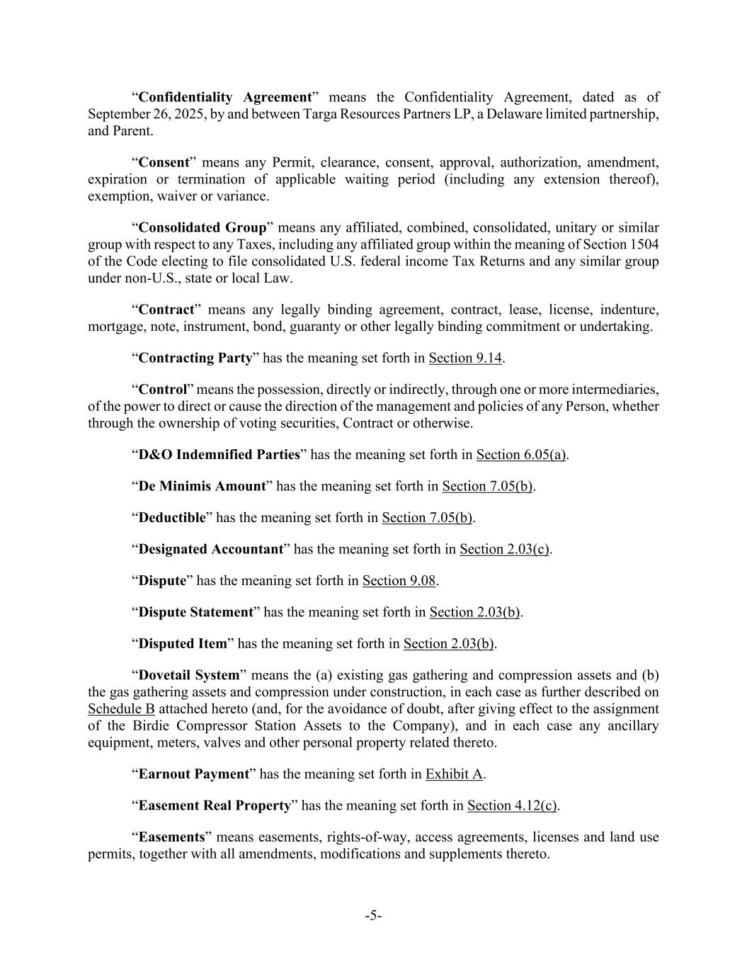 -5- “Confidentiality Agreement” means the Confidentiality Agreement, dated as of September 26, 2025, by and between Targa Resources Partners LP, a Delaware limited partnership, and Parent. “Consent” means any Permit, clearance, consent, approval, authorization, amendment, expiration or termination of applicable waiting period (including any extension thereof), exemption, waiver or variance. “Consolidated Group” means any affiliated, combined, consolidated, unitary or similar group with respect to any Taxes, including any affiliated group within the meaning of Section 1504 of the Code electing to file consolidated U.S. federal income Tax Returns and any similar group under non-U.S., state or local Law. “Contract” means any legally binding agreement, contract, lease, license, indenture, mortgage, note, instrument, bond, guaranty or other legally binding commitment or undertaking. “Contracting Party” has the meaning set forth in Section 9.14. “Control” means the possession, directly or indirectly, through one or more intermediaries, of the power to direct or cause the direction of the management and policies of any Person, whether through the ownership of voting securities, Contract or otherwise. “D&O Indemnified Parties” has the meaning set forth in Section 6.05(a). “De Minimis Amount” has the meaning set forth in Section 7.05(b). “Deductible” has the meaning set forth in Section 7.05(b). “Designated Accountant” has the meaning set forth in Section 2.03(c). “Dispute” has the meaning set forth in Section 9.08. “Dispute Statement” has the meaning set forth in Section 2.03(b). “Disputed Item” has the meaning set forth in Section 2.03(b). “Dovetail System” means the (a) existing gas gathering and compression assets and (b) the gas gathering assets and compression under construction, in each case as further described on Schedule B attached hereto (and, for the avoidance of doubt, after giving effect to the assignment of the Birdie Compressor Station Assets to the Company), and in each case any ancillary equipment, meters, valves and other personal property related thereto. “Earnout Payment” has the meaning set forth in Exhibit A. “Easement Real Property” has the meaning set forth in Section 4.12(c). “Easements” means easements, rights-of-way, access agreements, licenses and land use permits, together with all amendments, modifications and supplements thereto.