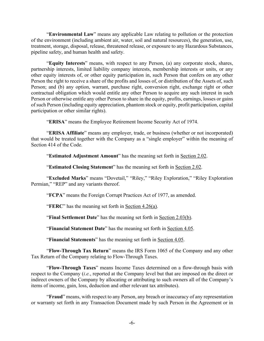-6- “Environmental Law” means any applicable Law relating to pollution or the protection of the environment (including ambient air, water, soil and natural resources), the generation, use, treatment, storage, disposal, release, threatened release, or exposure to any Hazardous Substances, pipeline safety, and human health and safety. “Equity Interests” means, with respect to any Person, (a) any corporate stock, shares, partnership interests, limited liability company interests, membership interests or units, or any other equity interests of, or other equity participation in, such Person that confers on any other Person the right to receive a share of the profits and losses of, or distribution of the Assets of, such Person; and (b) any option, warrant, purchase right, conversion right, exchange right or other contractual obligation which would entitle any other Person to acquire any such interest in such Person or otherwise entitle any other Person to share in the equity, profits, earnings, losses or gains of such Person (including equity appreciation, phantom stock or equity, profit participation, capital participation or other similar rights). “ERISA” means the Employee Retirement Income Security Act of 1974. “ERISA Affiliate” means any employer, trade, or business (whether or not incorporated) that would be treated together with the Company as a “single employer” within the meaning of Section 414 of the Code. “Estimated Adjustment Amount” has the meaning set forth in Section 2.02. “Estimated Closing Statement” has the meaning set forth in Section 2.02. “Excluded Marks” means “Dovetail,” “Riley,” “Riley Exploration,” “Riley Exploration Permian,” “REP” and any variants thereof. “FCPA” means the Foreign Corrupt Practices Act of 1977, as amended. “FERC” has the meaning set forth in Section 4.26(a). “Final Settlement Date” has the meaning set forth in Section 2.03(b). “Financial Statement Date” has the meaning set forth in Section 4.05. “Financial Statements” has the meaning set forth in Section 4.05. “Flow-Through Tax Return” means the IRS Form 1065 of the Company and any other Tax Return of the Company relating to Flow-Through Taxes. “Flow-Through Taxes” means Income Taxes determined on a flow-through basis with respect to the Company (i.e., reported at the Company level but that are imposed on the direct or indirect owners of the Company by allocating or attributing to such owners all of the Company’s items of income, gain, loss, deduction and other relevant tax attributes). “Fraud” means, with respect to any Person, any breach or inaccuracy of any representation or warranty set forth in any Transaction Document made by such Person in the Agreement or in