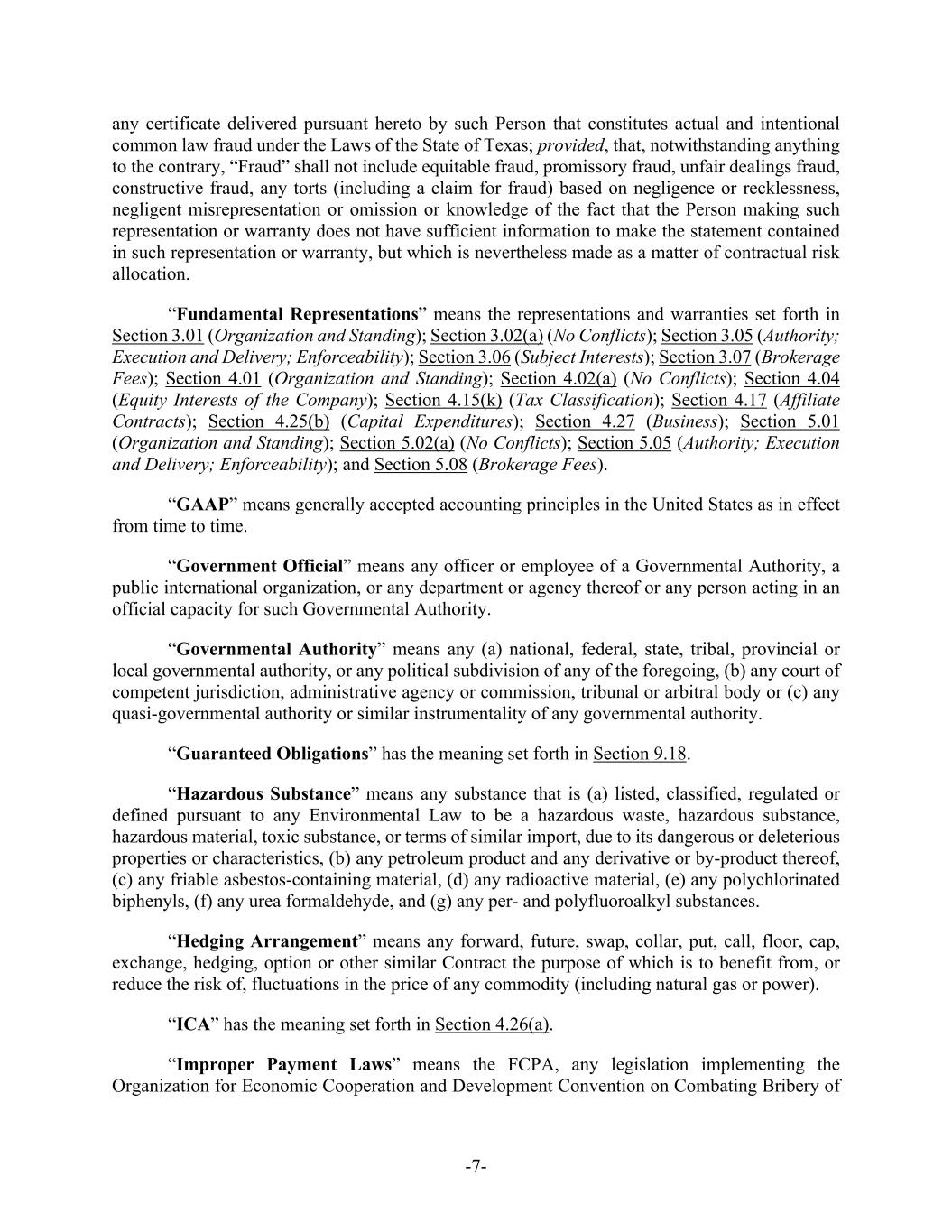-7- any certificate delivered pursuant hereto by such Person that constitutes actual and intentional common law fraud under the Laws of the State of Texas; provided, that, notwithstanding anything to the contrary, “Fraud” shall not include equitable fraud, promissory fraud, unfair dealings fraud, constructive fraud, any torts (including a claim for fraud) based on negligence or recklessness, negligent misrepresentation or omission or knowledge of the fact that the Person making such representation or warranty does not have sufficient information to make the statement contained in such representation or warranty, but which is nevertheless made as a matter of contractual risk allocation. “Fundamental Representations” means the representations and warranties set forth in Section 3.01 (Organization and Standing); Section 3.02(a) (No Conflicts); Section 3.05 (Authority; Execution and Delivery; Enforceability); Section 3.06 (Subject Interests); Section 3.07 (Brokerage Fees); Section 4.01 (Organization and Standing); Section 4.02(a) (No Conflicts); Section 4.04 (Equity Interests of the Company); Section 4.15(k) (Tax Classification); Section 4.17 (Affiliate Contracts); Section 4.25(b) (Capital Expenditures); Section 4.27 (Business); Section 5.01 (Organization and Standing); Section 5.02(a) (No Conflicts); Section 5.05 (Authority; Execution and Delivery; Enforceability); and Section 5.08 (Brokerage Fees). “GAAP” means generally accepted accounting principles in the United States as in effect from time to time. “Government Official” means any officer or employee of a Governmental Authority, a public international organization, or any department or agency thereof or any person acting in an official capacity for such Governmental Authority. “Governmental Authority” means any (a) national, federal, state, tribal, provincial or local governmental authority, or any political subdivision of any of the foregoing, (b) any court of competent jurisdiction, administrative agency or commission, tribunal or arbitral body or (c) any quasi-governmental authority or similar instrumentality of any governmental authority. “Guaranteed Obligations” has the meaning set forth in Section 9.18. “Hazardous Substance” means any substance that is (a) listed, classified, regulated or defined pursuant to any Environmental Law to be a hazardous waste, hazardous substance, hazardous material, toxic substance, or terms of similar import, due to its dangerous or deleterious properties or characteristics, (b) any petroleum product and any derivative or by-product thereof, (c) any friable asbestos-containing material, (d) any radioactive material, (e) any polychlorinated biphenyls, (f) any urea formaldehyde, and (g) any per- and polyfluoroalkyl substances. “Hedging Arrangement” means any forward, future, swap, collar, put, call, floor, cap, exchange, hedging, option or other similar Contract the purpose of which is to benefit from, or reduce the risk of, fluctuations in the price of any commodity (including natural gas or power). “ICA” has the meaning set forth in Section 4.26(a). “Improper Payment Laws” means the FCPA, any legislation implementing the Organization for Economic Cooperation and Development Convention on Combating Bribery of