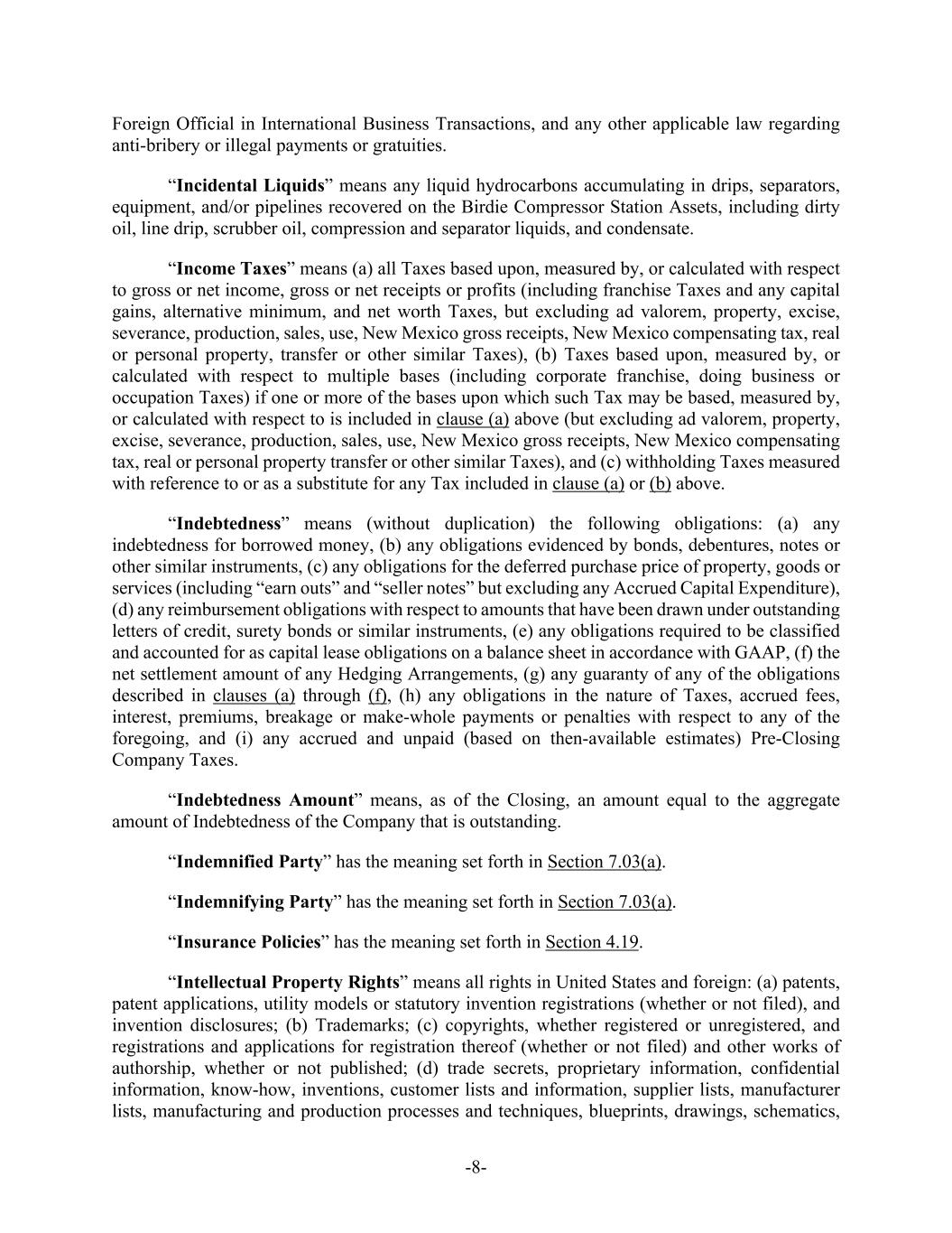 -8- Foreign Official in International Business Transactions, and any other applicable law regarding anti-bribery or illegal payments or gratuities. “Incidental Liquids” means any liquid hydrocarbons accumulating in drips, separators, equipment, and/or pipelines recovered on the Birdie Compressor Station Assets, including dirty oil, line drip, scrubber oil, compression and separator liquids, and condensate. “Income Taxes” means (a) all Taxes based upon, measured by, or calculated with respect to gross or net income, gross or net receipts or profits (including franchise Taxes and any capital gains, alternative minimum, and net worth Taxes, but excluding ad valorem, property, excise, severance, production, sales, use, New Mexico gross receipts, New Mexico compensating tax, real or personal property, transfer or other similar Taxes), (b) Taxes based upon, measured by, or calculated with respect to multiple bases (including corporate franchise, doing business or occupation Taxes) if one or more of the bases upon which such Tax may be based, measured by, or calculated with respect to is included in clause (a) above (but excluding ad valorem, property, excise, severance, production, sales, use, New Mexico gross receipts, New Mexico compensating tax, real or personal property transfer or other similar Taxes), and (c) withholding Taxes measured with reference to or as a substitute for any Tax included in clause (a) or (b) above. “Indebtedness” means (without duplication) the following obligations: (a) any indebtedness for borrowed money, (b) any obligations evidenced by bonds, debentures, notes or other similar instruments, (c) any obligations for the deferred purchase price of property, goods or services (including “earn outs” and “seller notes” but excluding any Accrued Capital Expenditure), (d) any reimbursement obligations with respect to amounts that have been drawn under outstanding letters of credit, surety bonds or similar instruments, (e) any obligations required to be classified and accounted for as capital lease obligations on a balance sheet in accordance with GAAP, (f) the net settlement amount of any Hedging Arrangements, (g) any guaranty of any of the obligations described in clauses (a) through (f), (h) any obligations in the nature of Taxes, accrued fees, interest, premiums, breakage or make-whole payments or penalties with respect to any of the foregoing, and (i) any accrued and unpaid (based on then-available estimates) Pre-Closing Company Taxes. “Indebtedness Amount” means, as of the Closing, an amount equal to the aggregate amount of Indebtedness of the Company that is outstanding. “Indemnified Party” has the meaning set forth in Section 7.03(a). “Indemnifying Party” has the meaning set forth in Section 7.03(a). “Insurance Policies” has the meaning set forth in Section 4.19. “Intellectual Property Rights” means all rights in United States and foreign: (a) patents, patent applications, utility models or statutory invention registrations (whether or not filed), and invention disclosures; (b) Trademarks; (c) copyrights, whether registered or unregistered, and registrations and applications for registration thereof (whether or not filed) and other works of authorship, whether or not published; (d) trade secrets, proprietary information, confidential information, know-how, inventions, customer lists and information, supplier lists, manufacturer lists, manufacturing and production processes and techniques, blueprints, drawings, schematics,