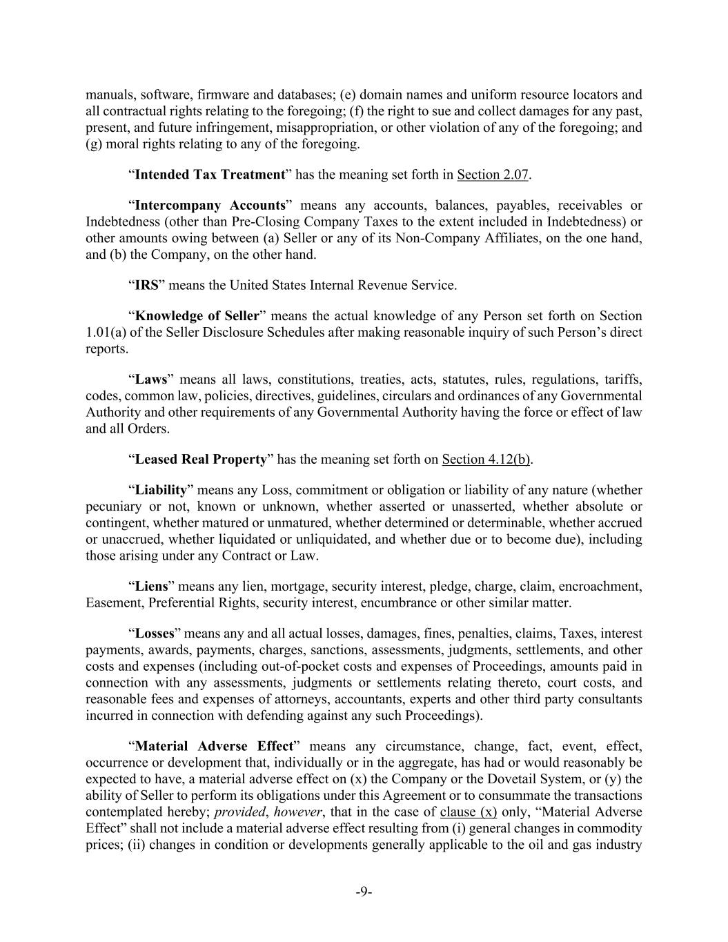 -9- manuals, software, firmware and databases; (e) domain names and uniform resource locators and all contractual rights relating to the foregoing; (f) the right to sue and collect damages for any past, present, and future infringement, misappropriation, or other violation of any of the foregoing; and (g) moral rights relating to any of the foregoing. “Intended Tax Treatment” has the meaning set forth in Section 2.07. “Intercompany Accounts” means any accounts, balances, payables, receivables or Indebtedness (other than Pre-Closing Company Taxes to the extent included in Indebtedness) or other amounts owing between (a) Seller or any of its Non-Company Affiliates, on the one hand, and (b) the Company, on the other hand. “IRS” means the United States Internal Revenue Service. “Knowledge of Seller” means the actual knowledge of any Person set forth on Section 1.01(a) of the Seller Disclosure Schedules after making reasonable inquiry of such Person’s direct reports. “Laws” means all laws, constitutions, treaties, acts, statutes, rules, regulations, tariffs, codes, common law, policies, directives, guidelines, circulars and ordinances of any Governmental Authority and other requirements of any Governmental Authority having the force or effect of law and all Orders. “Leased Real Property” has the meaning set forth on Section 4.12(b). “Liability” means any Loss, commitment or obligation or liability of any nature (whether pecuniary or not, known or unknown, whether asserted or unasserted, whether absolute or contingent, whether matured or unmatured, whether determined or determinable, whether accrued or unaccrued, whether liquidated or unliquidated, and whether due or to become due), including those arising under any Contract or Law. “Liens” means any lien, mortgage, security interest, pledge, charge, claim, encroachment, Easement, Preferential Rights, security interest, encumbrance or other similar matter. “Losses” means any and all actual losses, damages, fines, penalties, claims, Taxes, interest payments, awards, payments, charges, sanctions, assessments, judgments, settlements, and other costs and expenses (including out-of-pocket costs and expenses of Proceedings, amounts paid in connection with any assessments, judgments or settlements relating thereto, court costs, and reasonable fees and expenses of attorneys, accountants, experts and other third party consultants incurred in connection with defending against any such Proceedings). “Material Adverse Effect” means any circumstance, change, fact, event, effect, occurrence or development that, individually or in the aggregate, has had or would reasonably be expected to have, a material adverse effect on (x) the Company or the Dovetail System, or (y) the ability of Seller to perform its obligations under this Agreement or to consummate the transactions contemplated hereby; provided, however, that in the case of clause (x) only, “Material Adverse Effect” shall not include a material adverse effect resulting from (i) general changes in commodity prices; (ii) changes in condition or developments generally applicable to the oil and gas industry