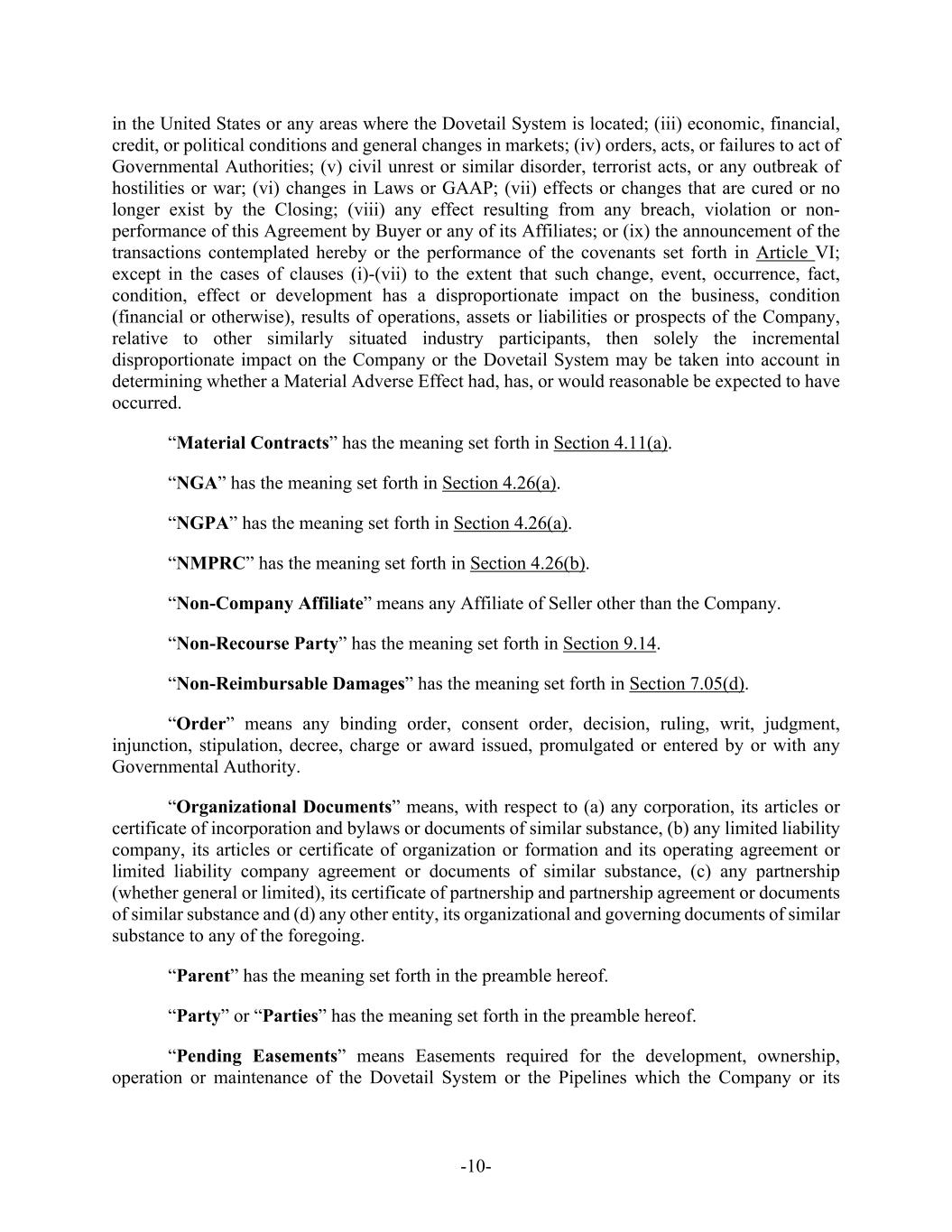 -10- in the United States or any areas where the Dovetail System is located; (iii) economic, financial, credit, or political conditions and general changes in markets; (iv) orders, acts, or failures to act of Governmental Authorities; (v) civil unrest or similar disorder, terrorist acts, or any outbreak of hostilities or war; (vi) changes in Laws or GAAP; (vii) effects or changes that are cured or no longer exist by the Closing; (viii) any effect resulting from any breach, violation or non- performance of this Agreement by Buyer or any of its Affiliates; or (ix) the announcement of the transactions contemplated hereby or the performance of the covenants set forth in Article VI; except in the cases of clauses (i)-(vii) to the extent that such change, event, occurrence, fact, condition, effect or development has a disproportionate impact on the business, condition (financial or otherwise), results of operations, assets or liabilities or prospects of the Company, relative to other similarly situated industry participants, then solely the incremental disproportionate impact on the Company or the Dovetail System may be taken into account in determining whether a Material Adverse Effect had, has, or would reasonable be expected to have occurred. “Material Contracts” has the meaning set forth in Section 4.11(a). “NGA” has the meaning set forth in Section 4.26(a). “NGPA” has the meaning set forth in Section 4.26(a). “NMPRC” has the meaning set forth in Section 4.26(b). “Non-Company Affiliate” means any Affiliate of Seller other than the Company. “Non-Recourse Party” has the meaning set forth in Section 9.14. “Non-Reimbursable Damages” has the meaning set forth in Section 7.05(d). “Order” means any binding order, consent order, decision, ruling, writ, judgment, injunction, stipulation, decree, charge or award issued, promulgated or entered by or with any Governmental Authority. “Organizational Documents” means, with respect to (a) any corporation, its articles or certificate of incorporation and bylaws or documents of similar substance, (b) any limited liability company, its articles or certificate of organization or formation and its operating agreement or limited liability company agreement or documents of similar substance, (c) any partnership (whether general or limited), its certificate of partnership and partnership agreement or documents of similar substance and (d) any other entity, its organizational and governing documents of similar substance to any of the foregoing. “Parent” has the meaning set forth in the preamble hereof. “Party” or “Parties” has the meaning set forth in the preamble hereof. “Pending Easements” means Easements required for the development, ownership, operation or maintenance of the Dovetail System or the Pipelines which the Company or its