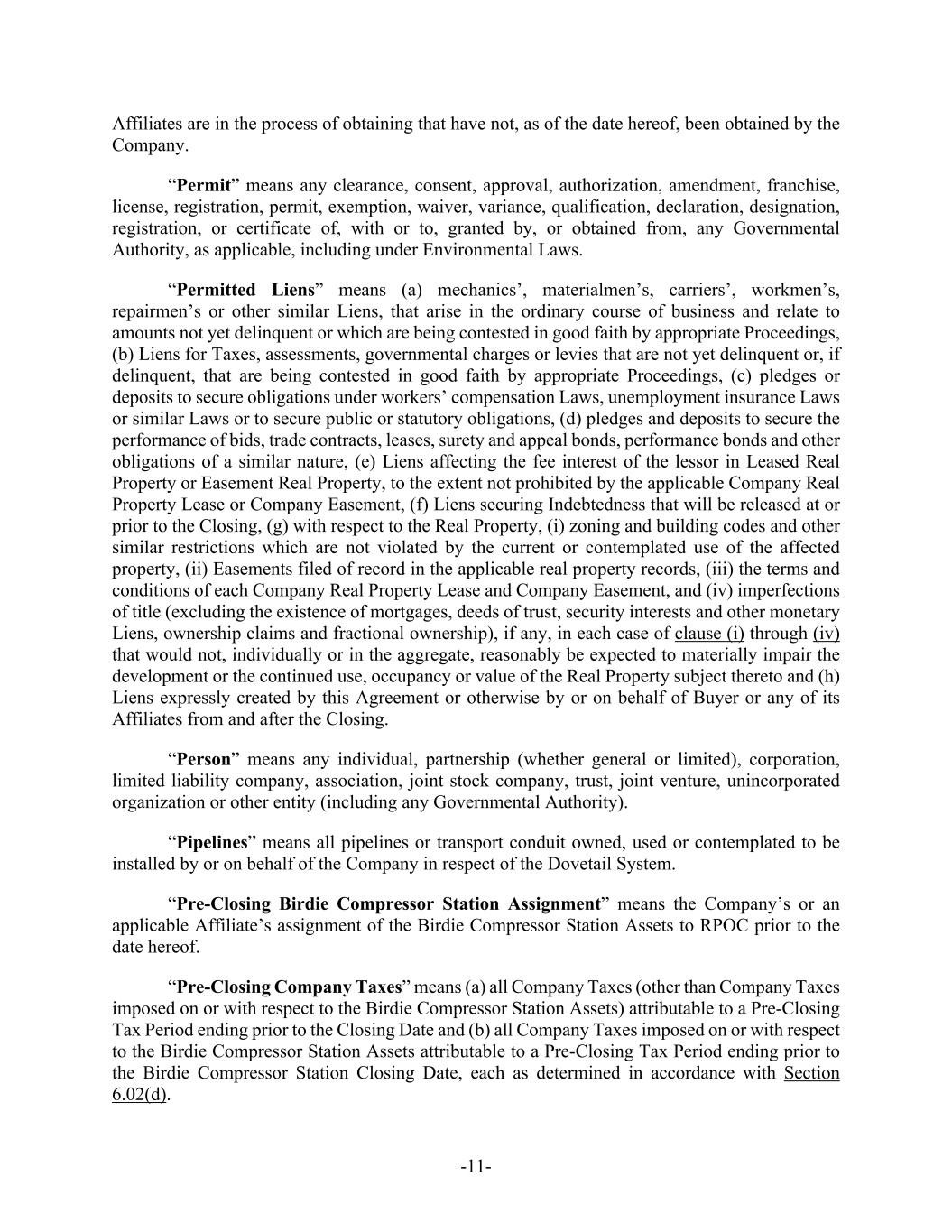 -11- Affiliates are in the process of obtaining that have not, as of the date hereof, been obtained by the Company. “Permit” means any clearance, consent, approval, authorization, amendment, franchise, license, registration, permit, exemption, waiver, variance, qualification, declaration, designation, registration, or certificate of, with or to, granted by, or obtained from, any Governmental Authority, as applicable, including under Environmental Laws. “Permitted Liens” means (a) mechanics’, materialmen’s, carriers’, workmen’s, repairmen’s or other similar Liens, that arise in the ordinary course of business and relate to amounts not yet delinquent or which are being contested in good faith by appropriate Proceedings, (b) Liens for Taxes, assessments, governmental charges or levies that are not yet delinquent or, if delinquent, that are being contested in good faith by appropriate Proceedings, (c) pledges or deposits to secure obligations under workers’ compensation Laws, unemployment insurance Laws or similar Laws or to secure public or statutory obligations, (d) pledges and deposits to secure the performance of bids, trade contracts, leases, surety and appeal bonds, performance bonds and other obligations of a similar nature, (e) Liens affecting the fee interest of the lessor in Leased Real Property or Easement Real Property, to the extent not prohibited by the applicable Company Real Property Lease or Company Easement, (f) Liens securing Indebtedness that will be released at or prior to the Closing, (g) with respect to the Real Property, (i) zoning and building codes and other similar restrictions which are not violated by the current or contemplated use of the affected property, (ii) Easements filed of record in the applicable real property records, (iii) the terms and conditions of each Company Real Property Lease and Company Easement, and (iv) imperfections of title (excluding the existence of mortgages, deeds of trust, security interests and other monetary Liens, ownership claims and fractional ownership), if any, in each case of clause (i) through (iv) that would not, individually or in the aggregate, reasonably be expected to materially impair the development or the continued use, occupancy or value of the Real Property subject thereto and (h) Liens expressly created by this Agreement or otherwise by or on behalf of Buyer or any of its Affiliates from and after the Closing. “Person” means any individual, partnership (whether general or limited), corporation, limited liability company, association, joint stock company, trust, joint venture, unincorporated organization or other entity (including any Governmental Authority). “Pipelines” means all pipelines or transport conduit owned, used or contemplated to be installed by or on behalf of the Company in respect of the Dovetail System. “Pre-Closing Birdie Compressor Station Assignment” means the Company’s or an applicable Affiliate’s assignment of the Birdie Compressor Station Assets to RPOC prior to the date hereof. “Pre-Closing Company Taxes” means (a) all Company Taxes (other than Company Taxes imposed on or with respect to the Birdie Compressor Station Assets) attributable to a Pre-Closing Tax Period ending prior to the Closing Date and (b) all Company Taxes imposed on or with respect to the Birdie Compressor Station Assets attributable to a Pre-Closing Tax Period ending prior to the Birdie Compressor Station Closing Date, each as determined in accordance with Section 6.02(d).